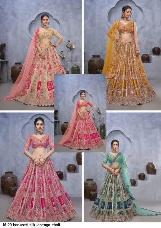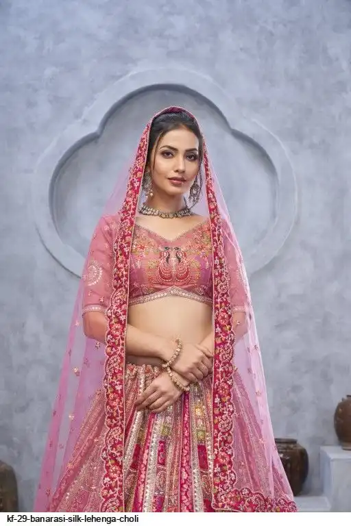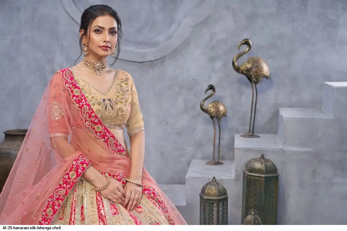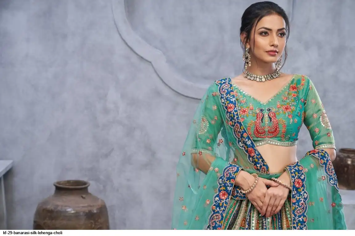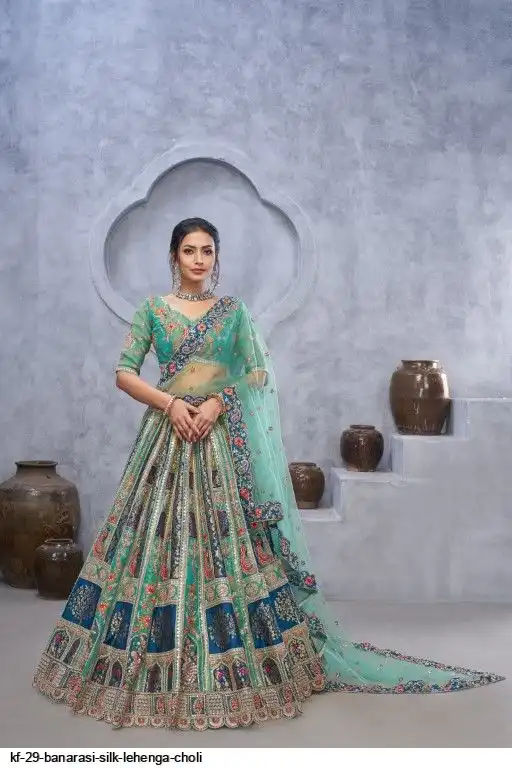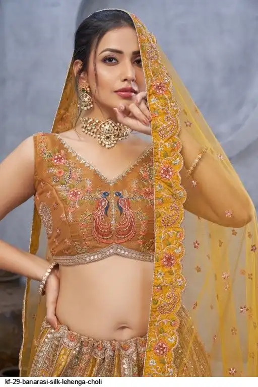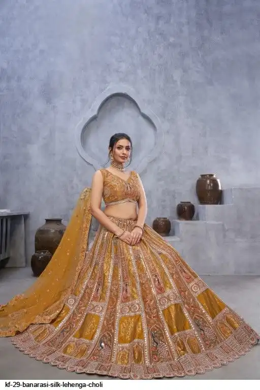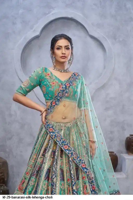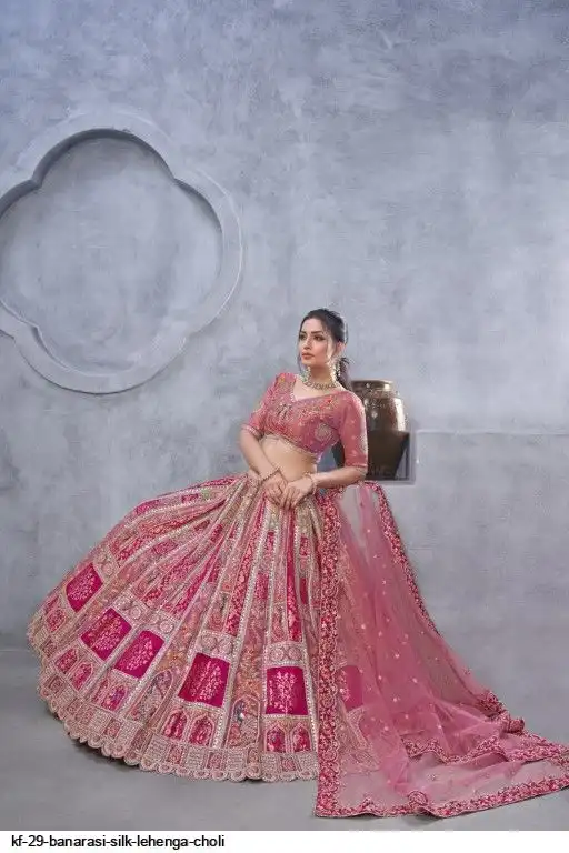 Lehenga: Banarasi silk, Waist up to 42 inch, Length 42 inch, Flair 4 meter