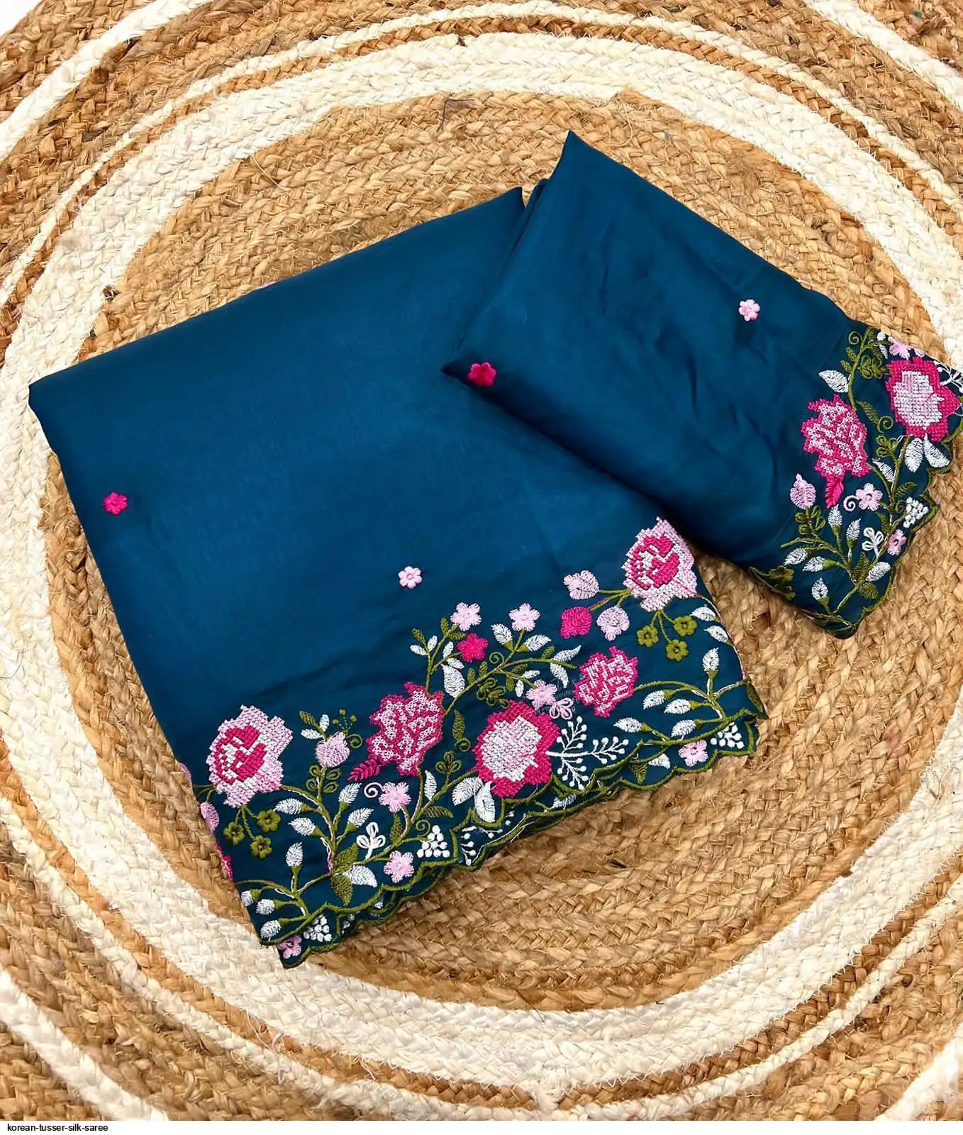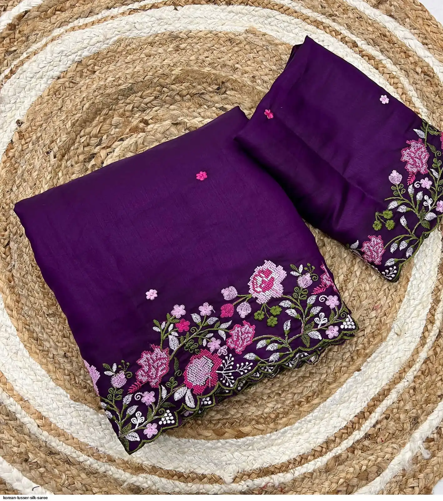 Fabric - Korean Tusser Silk Fabric Dark Color Matching With Multi Color Embroidery Cutwork Bordar And Body With Runing Blouse