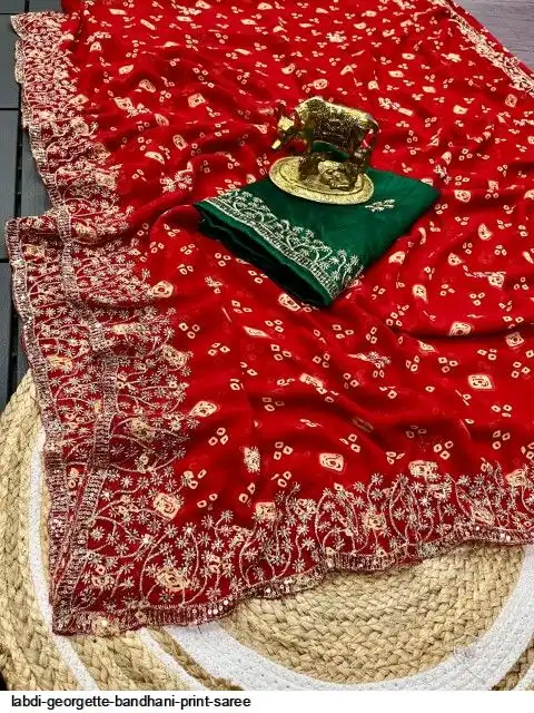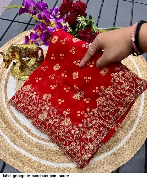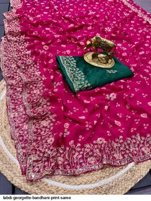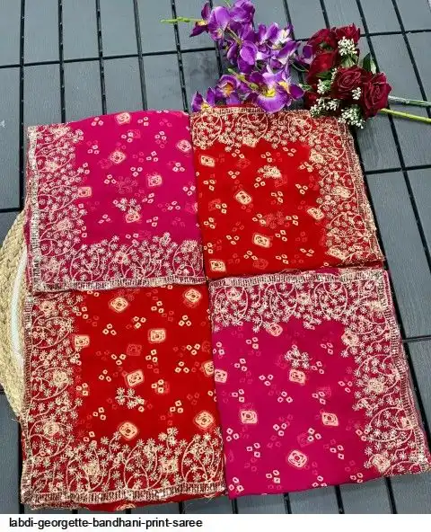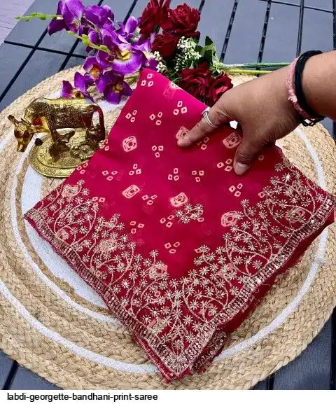 Saree :~ Georgette with Bandhani Print Saree with Beautiful Sequance Thread Work in C~Pallu Butti Work Border in Saree