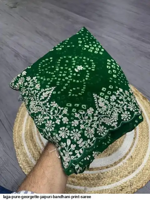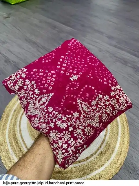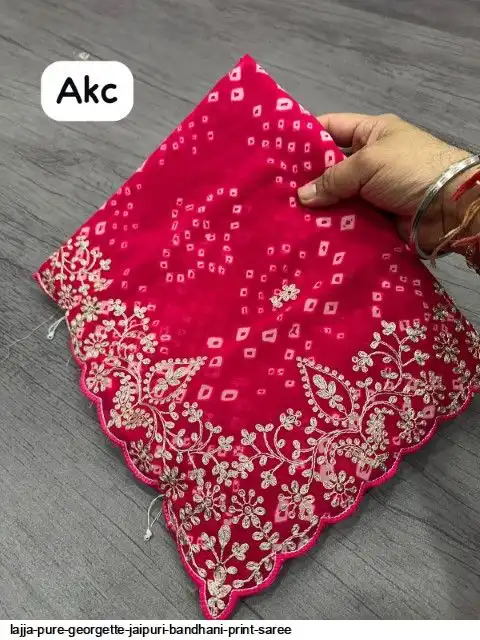 Saree :~ Pure Georgette with Jaipuri Bandhani Print Saree with Beautiful Foil Gota Work in C~Pallu Work Border in Saree