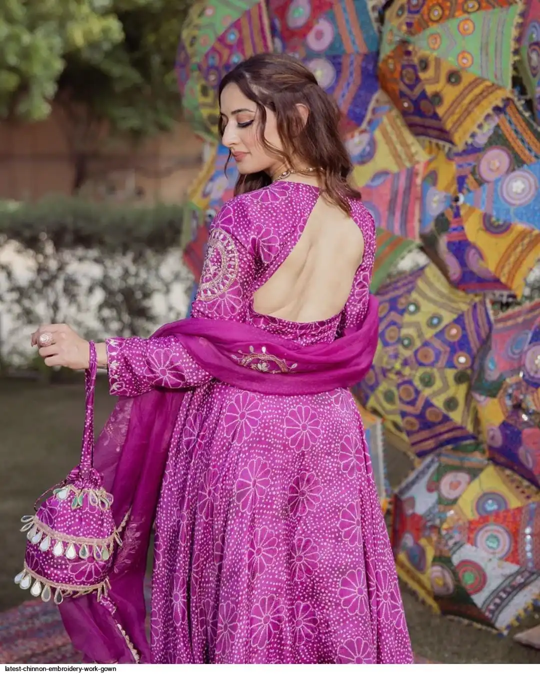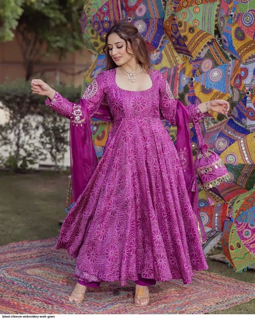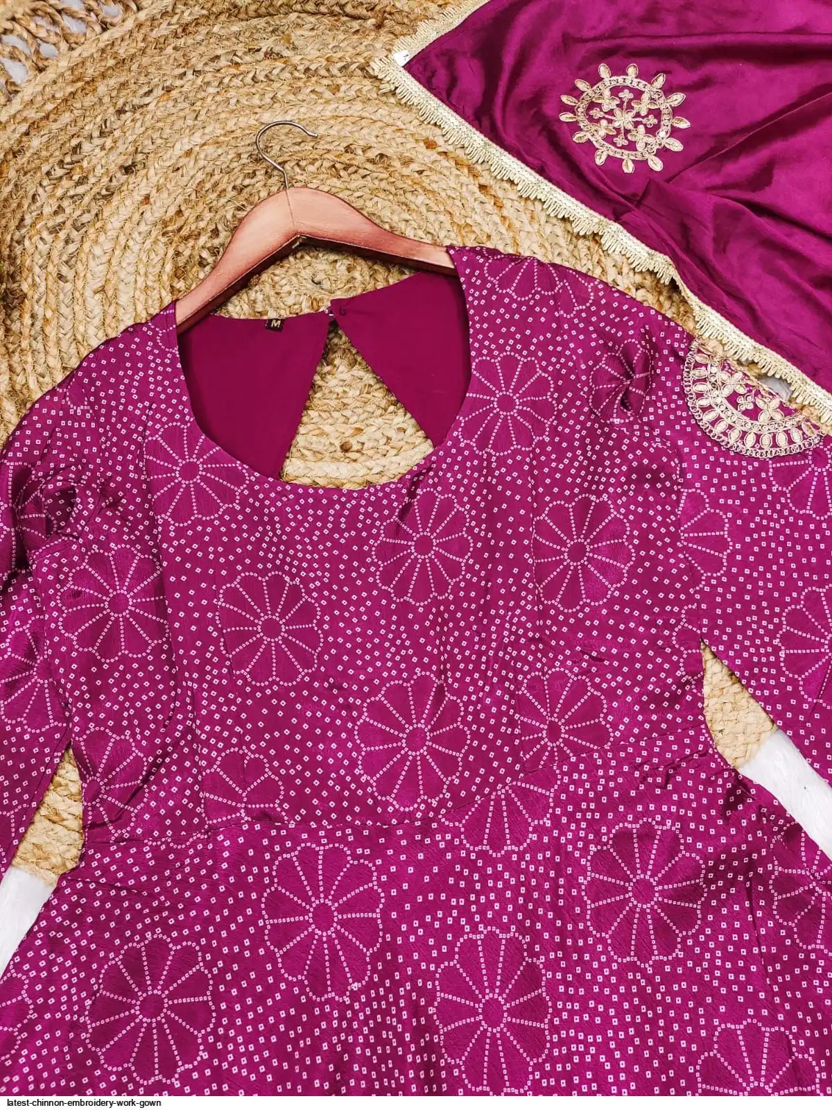 It appears to be an Anarkali style, given the significant flare and gathered waistline, which flows to the floor. The neckline is a subtle round or boat neck at the front, with a distinctive cut-out or tie-up detail at the upper back. The outfit has a festive, graceful, and traditional appeal, suitable for occasions like parties, festivals, or smaller wedding functions. The combination of the flowy Chinon fabric, the vibrant color, and the gold embroidery on the dupatta makes it visually striking.