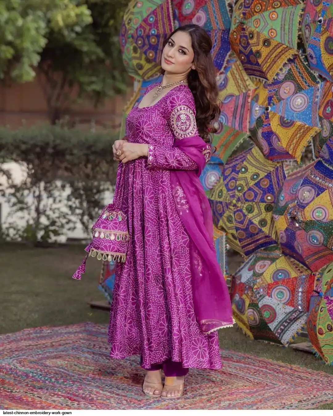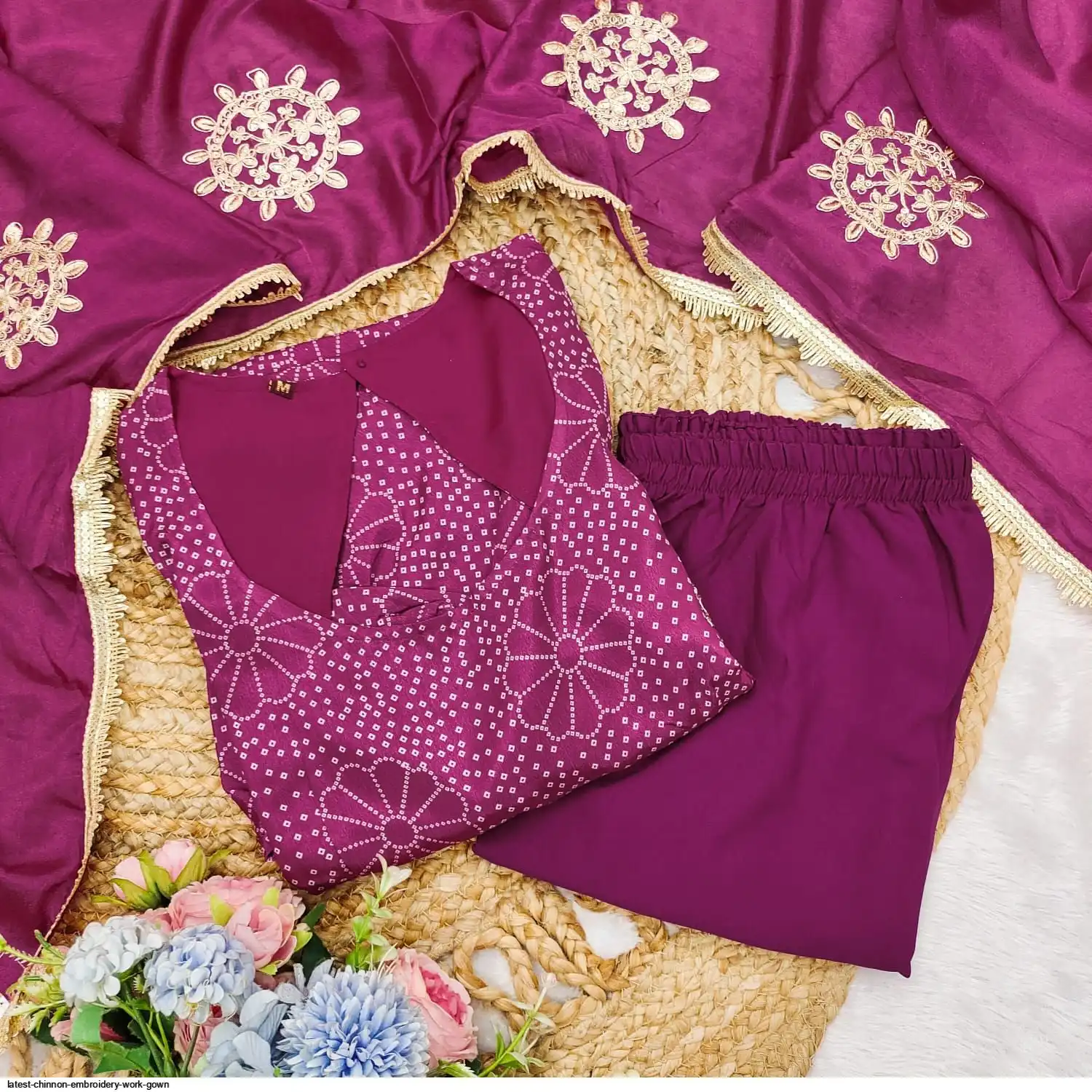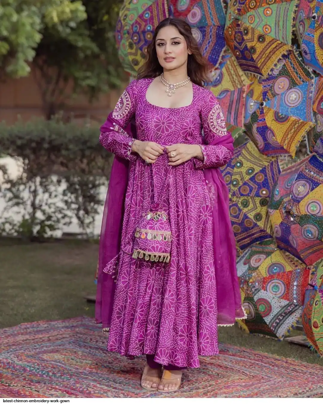 It appears to be an Anarkali style, given the significant flare and gathered waistline, which flows to the floor. The neckline is a subtle round or boat neck at the front, with a distinctive cut-out or tie-up detail at the upper back. The outfit has a festive, graceful, and traditional appeal, suitable for occasions like parties, festivals, or smaller wedding functions. The combination of the flowy Chinon fabric, the vibrant color, and the gold embroidery on the dupatta makes it visually striking.