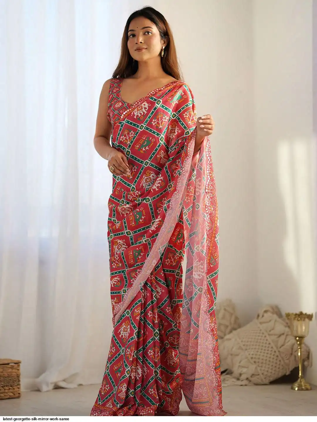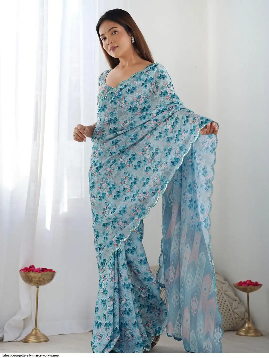 PATTERN-PRINTED SAREE WITH MIRROR WORK BORDER
