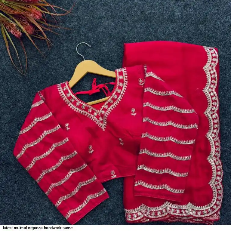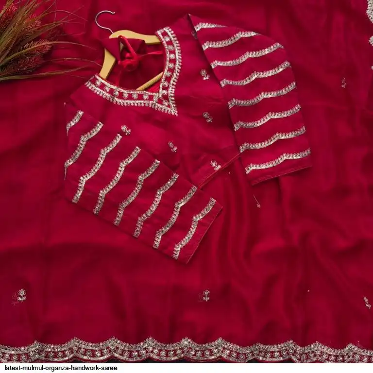 Mulmul organza saree with beautiful handwork all over saree and unstitch silk blouse with handwork