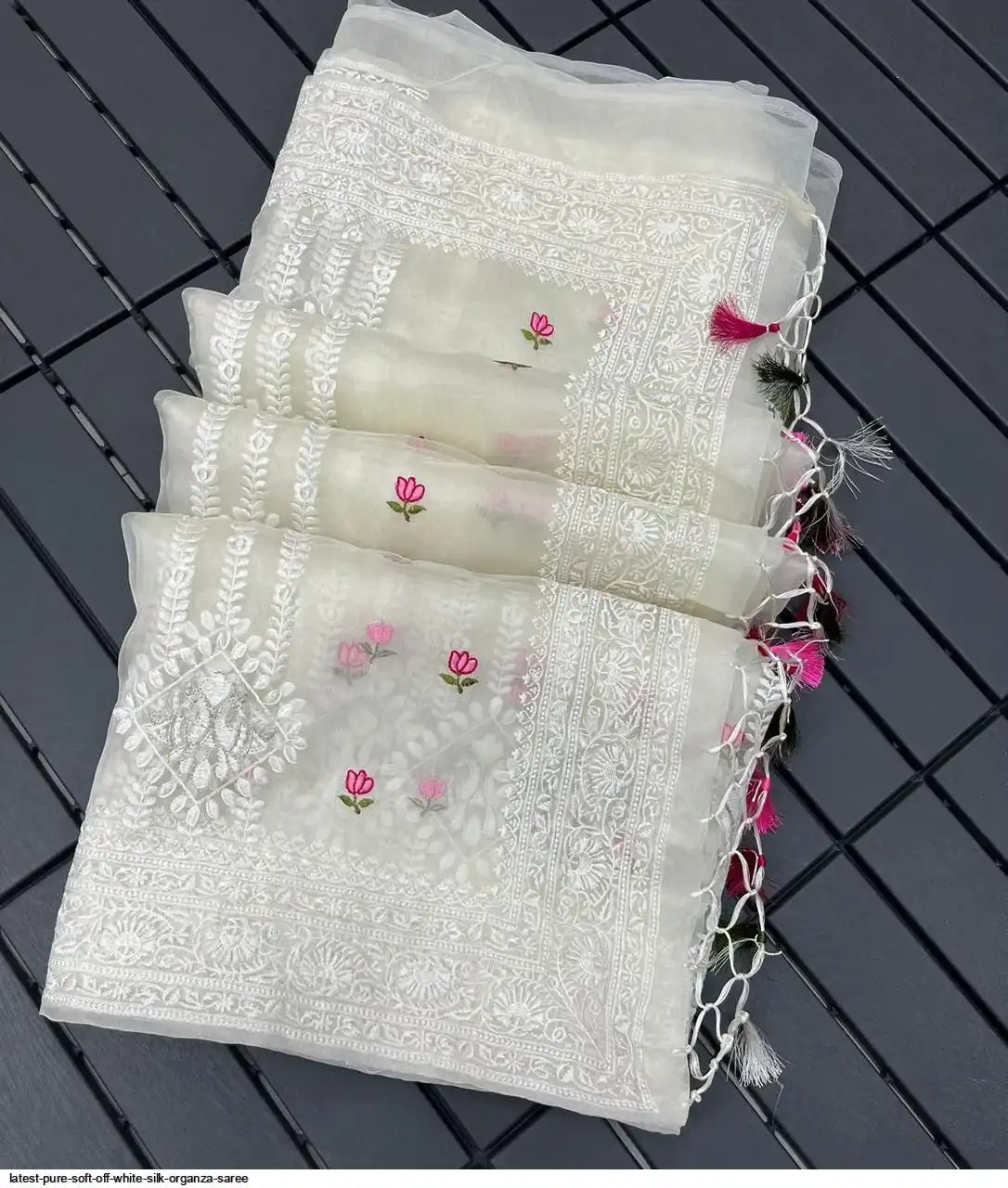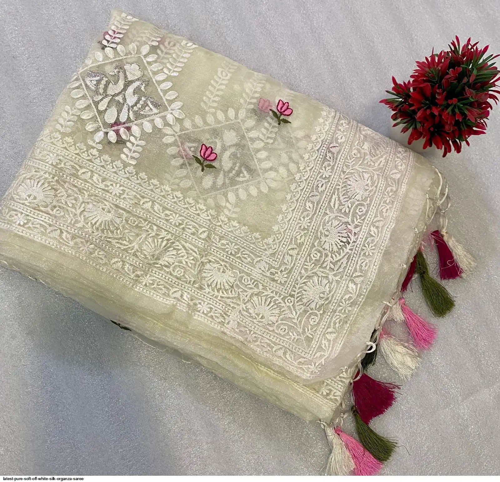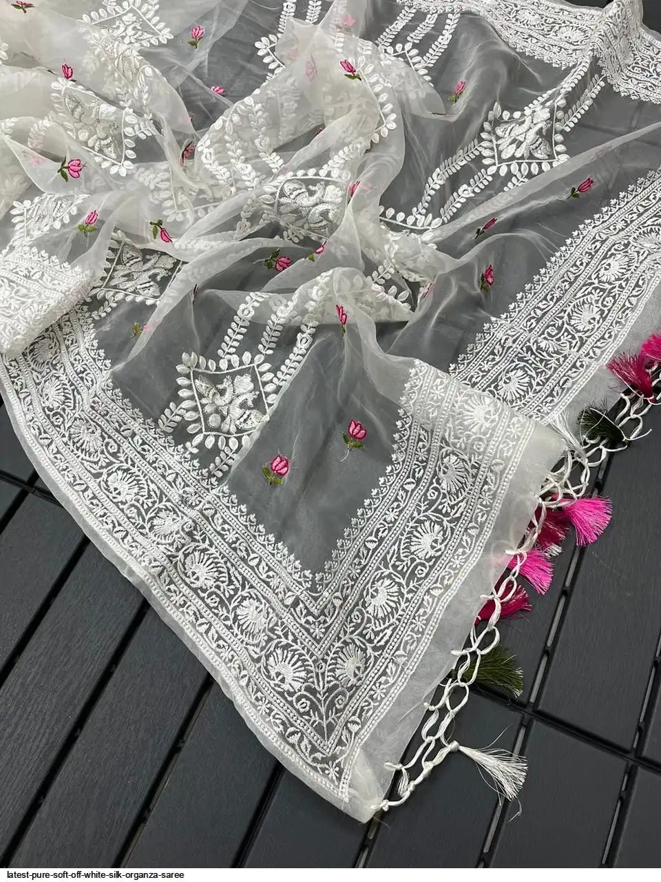Pure soft Off-white silk organza saree with Lucknowi & silver zari touch up embroidered all over saree with tassels (zalar) in pallu border contrast silk matching blouse