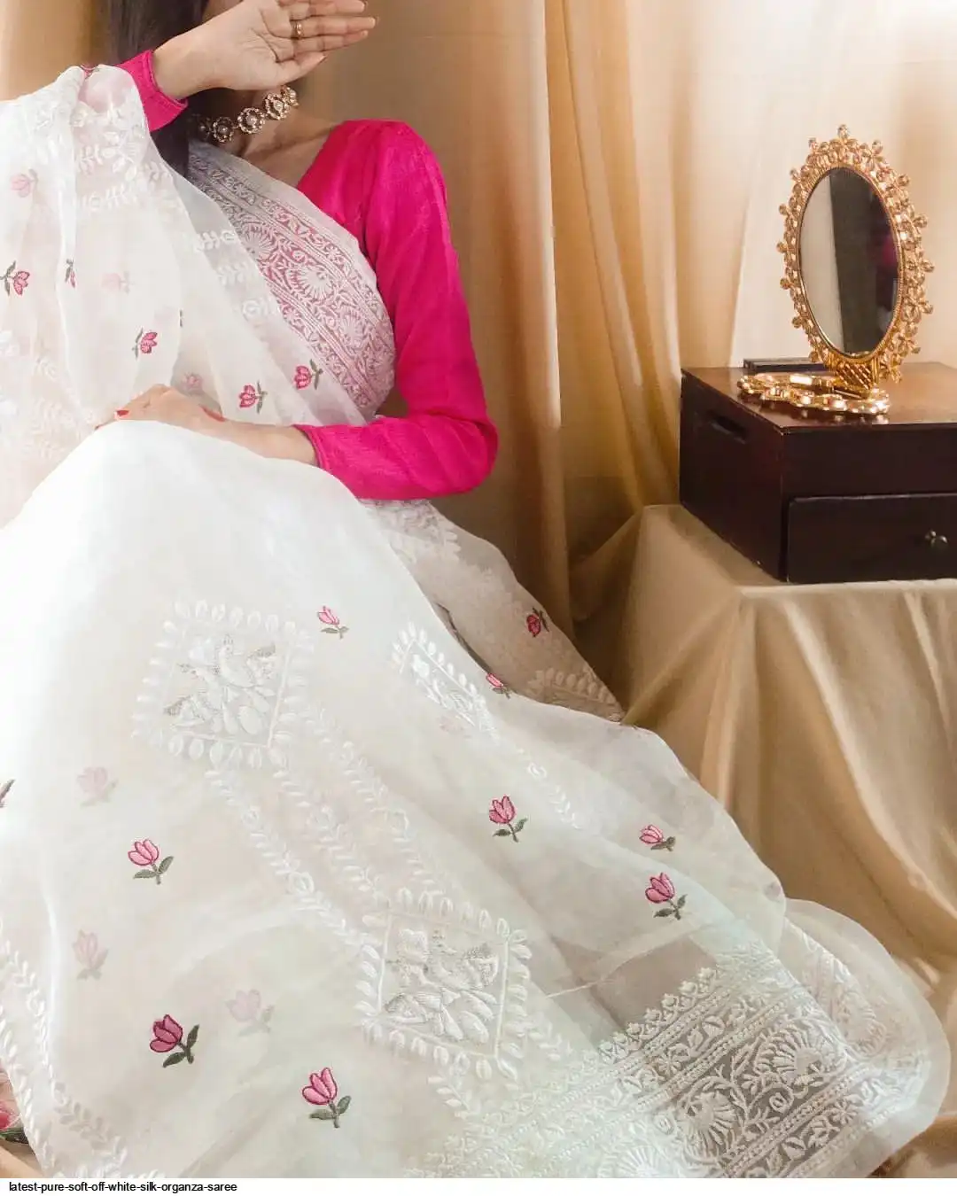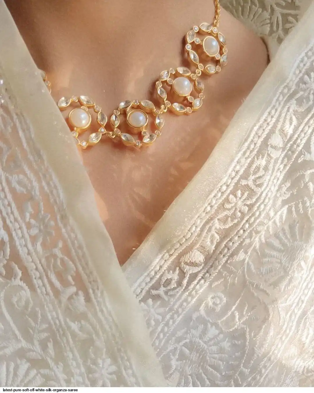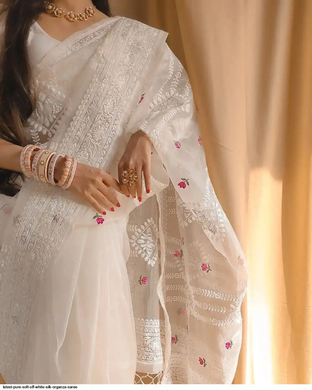 Pure soft Off-white silk organza saree with Lucknowi & silver zari touch up embroidered all over saree with tassels (zalar) in pallu border contrast silk matching blouse
