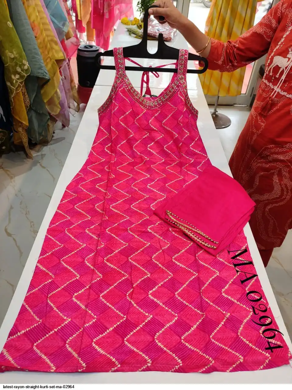Top - premium Rayon beautiful print sleeves less straight kurti with zari work on neck line .