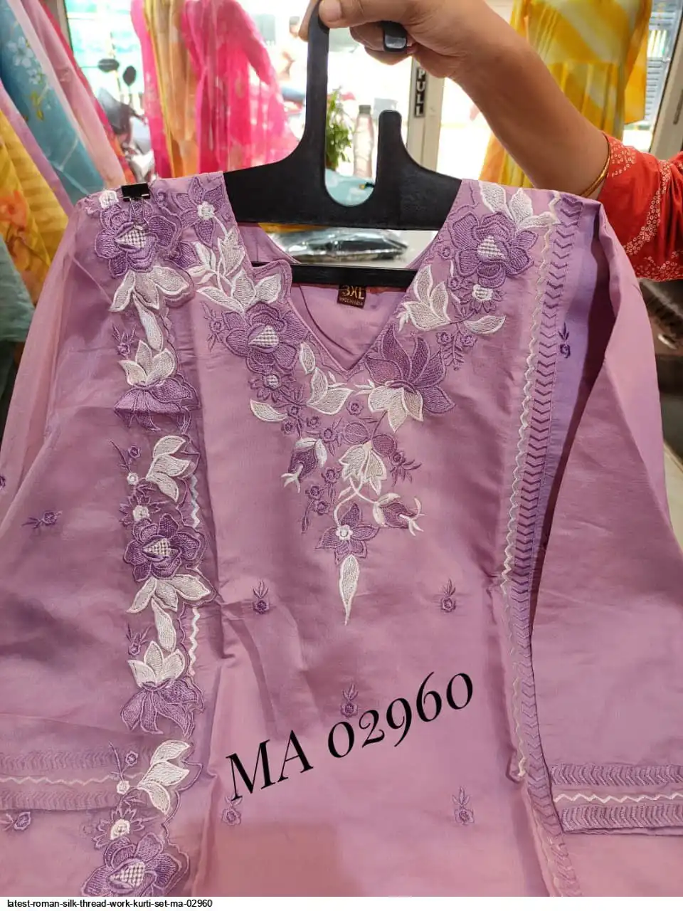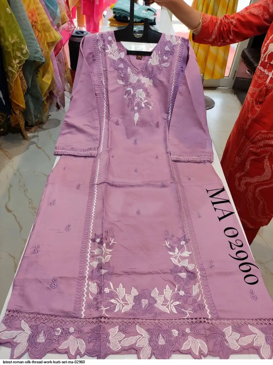 top - roman silk straight kurti detailing thread embroidery with cut work