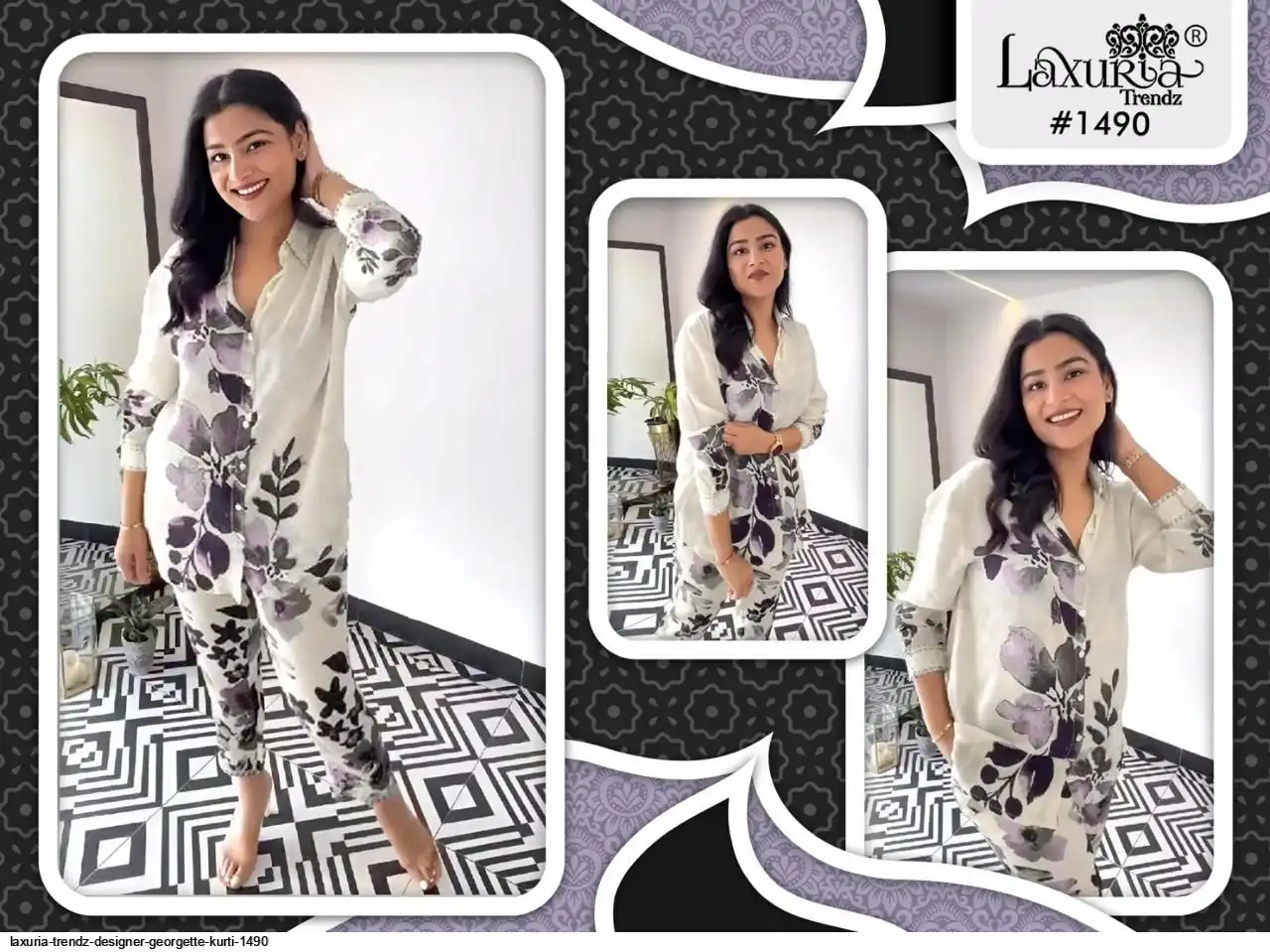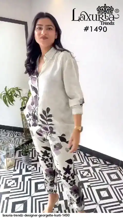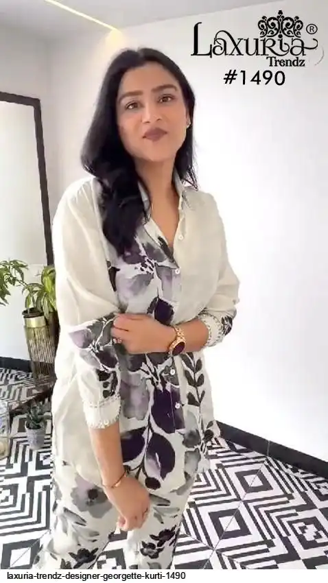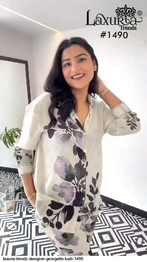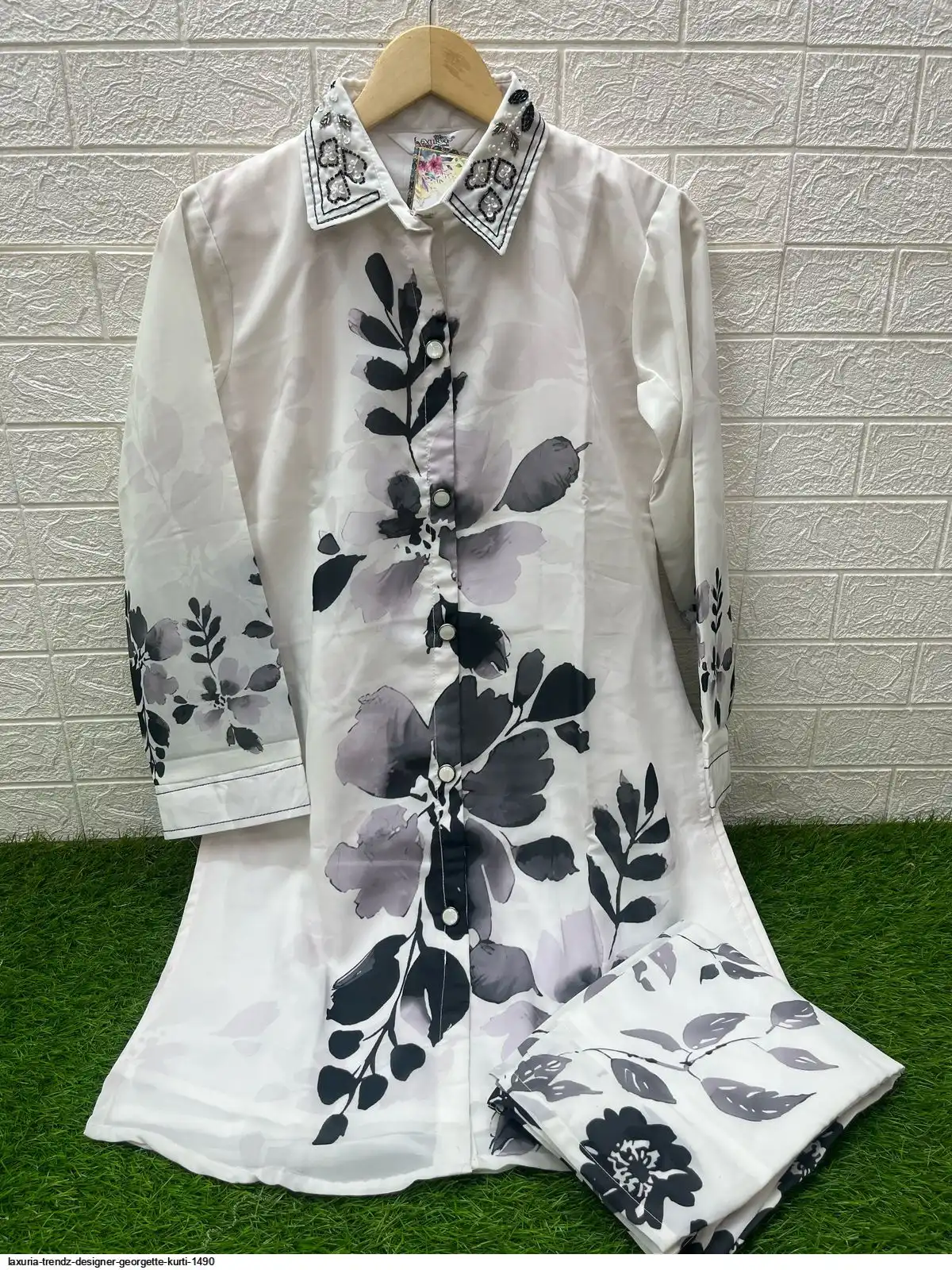 Designer Tunic On Georgette Print * with *Gorgeous sleeves * n *Glamours * paired with *Classy Handwork In Coller With Printed Pant...