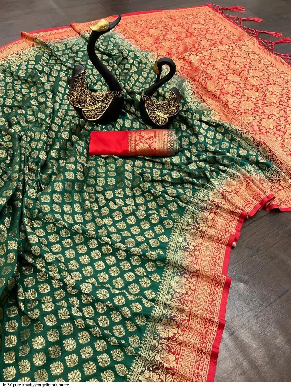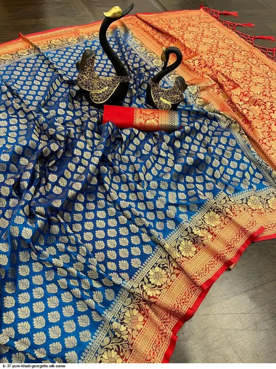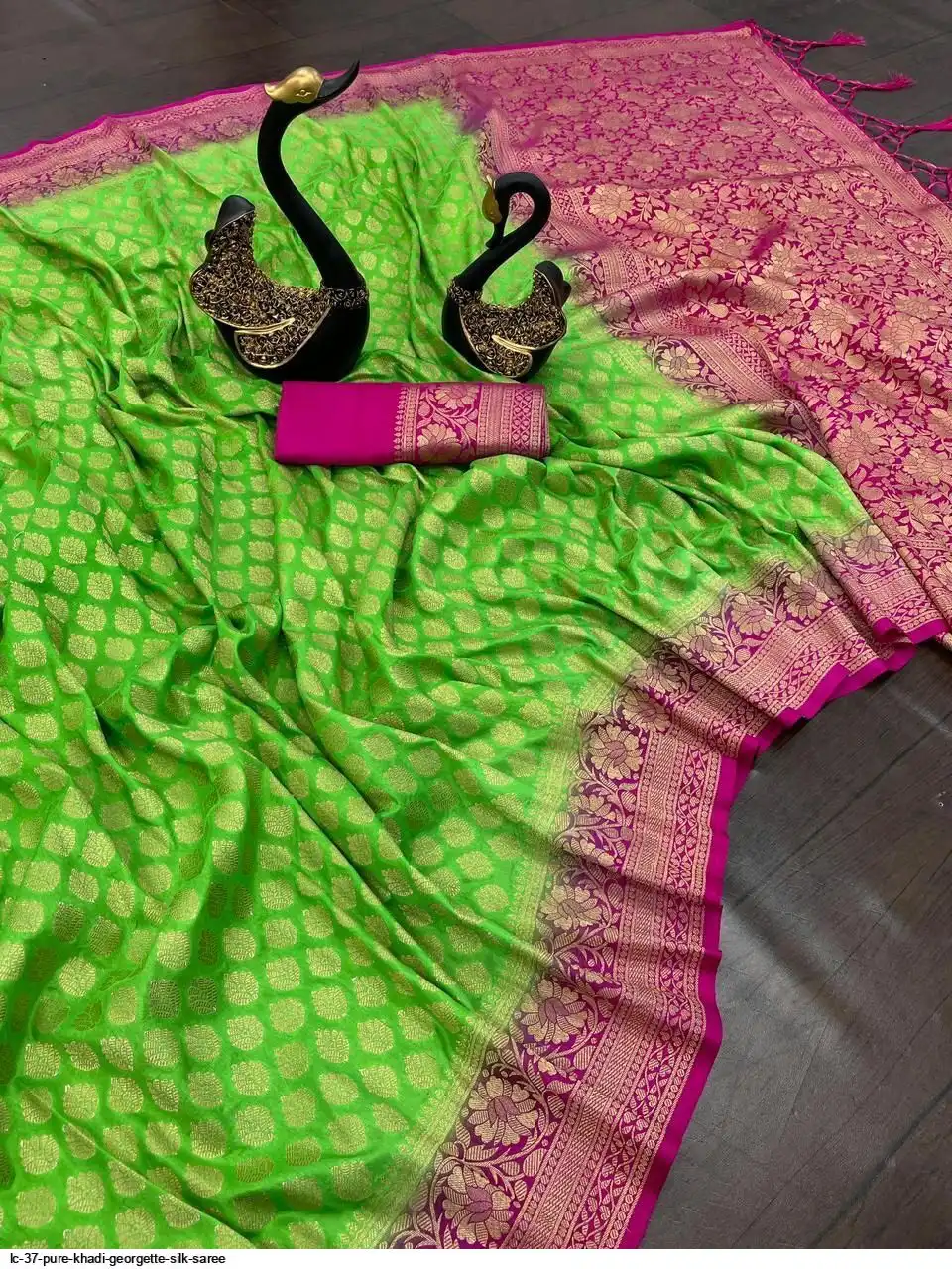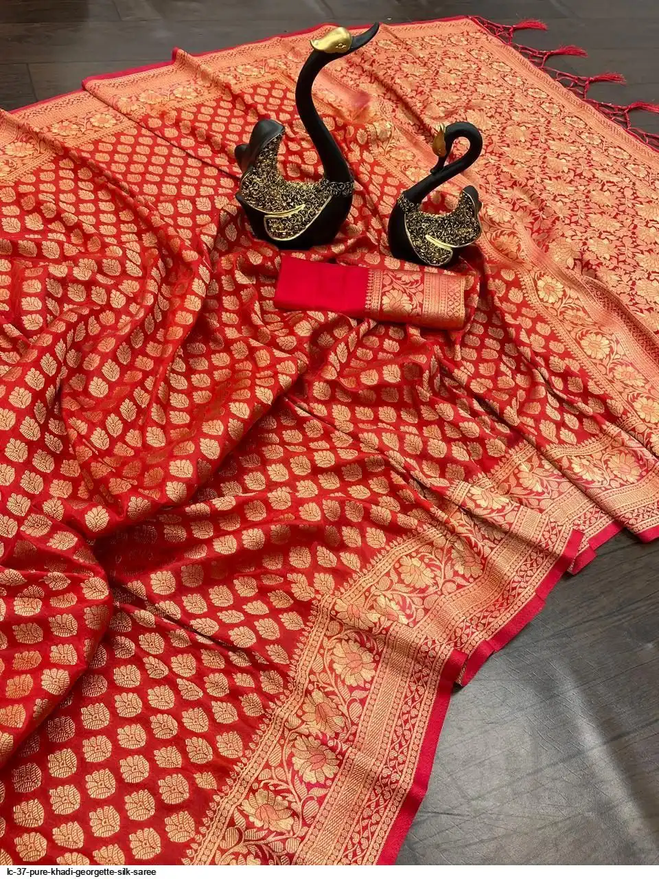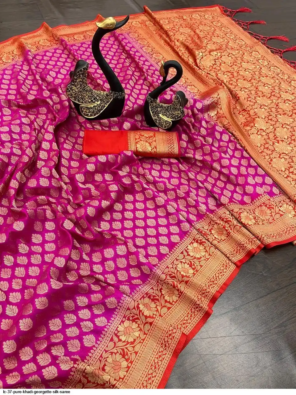 Pure Soft Khadi Georgette Silk Saree With Rich Zari Wooven Pallu Pairs With Fancy Tassels Having Heavy Wooven Border With All Over Zari Weaving in Full Saree With Running Blouse