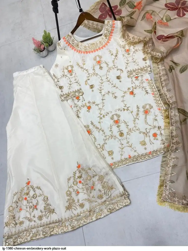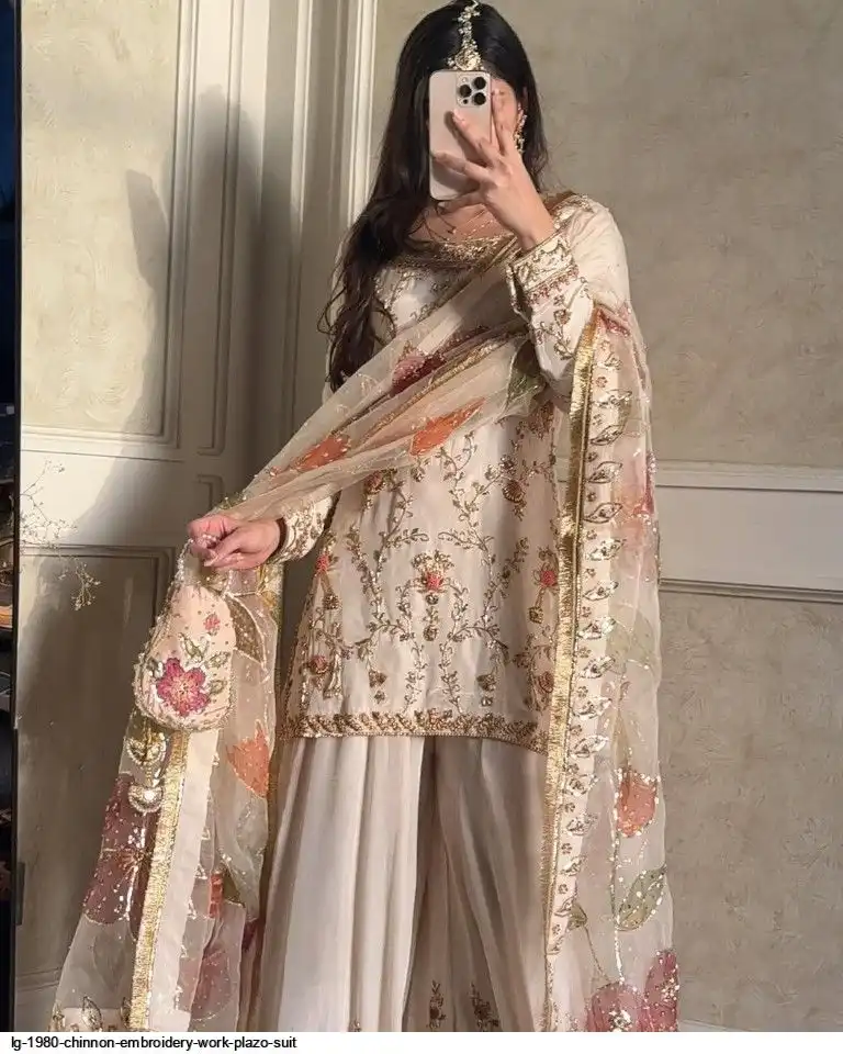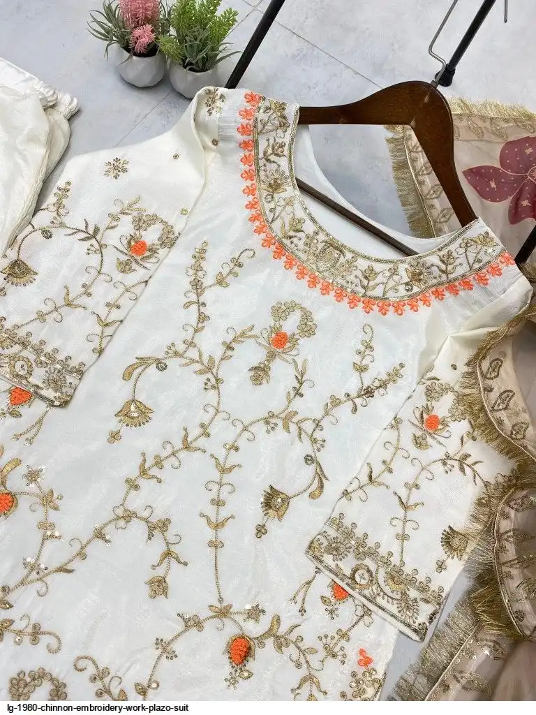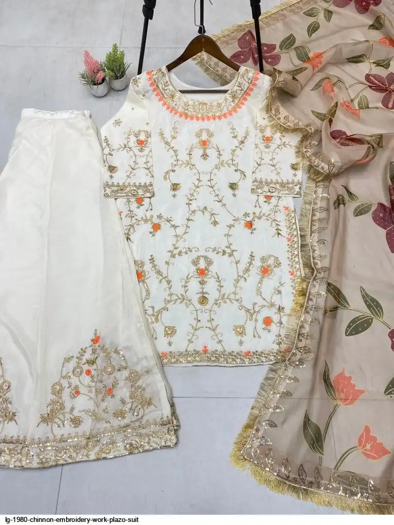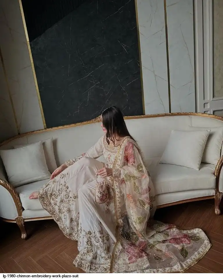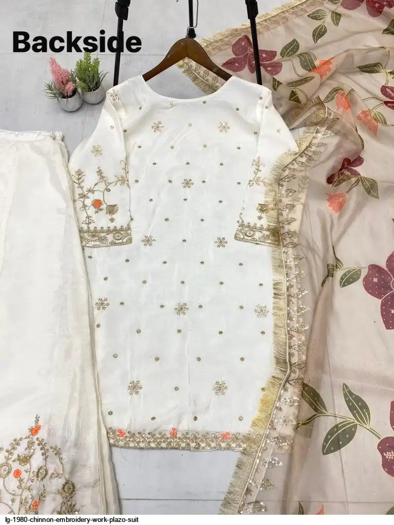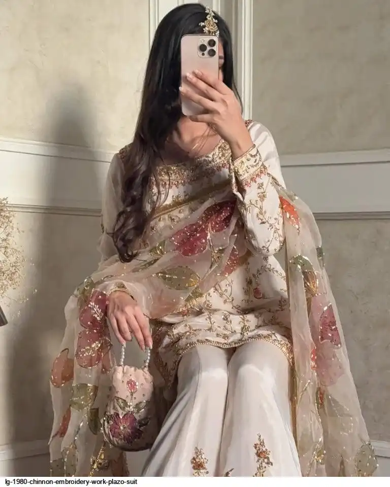 EXCLUSIVE DESIGNER HEAVY CHINON WITH SEQUANCE EMBROIDERY WORK SUIT WITH PLAZZO AND DUPATTA