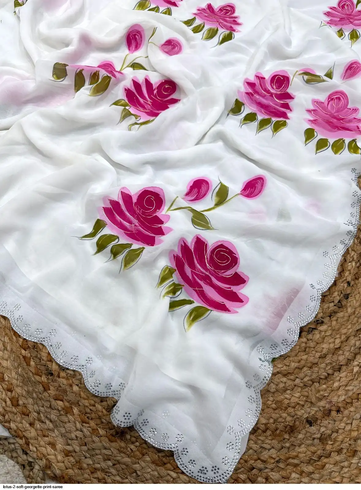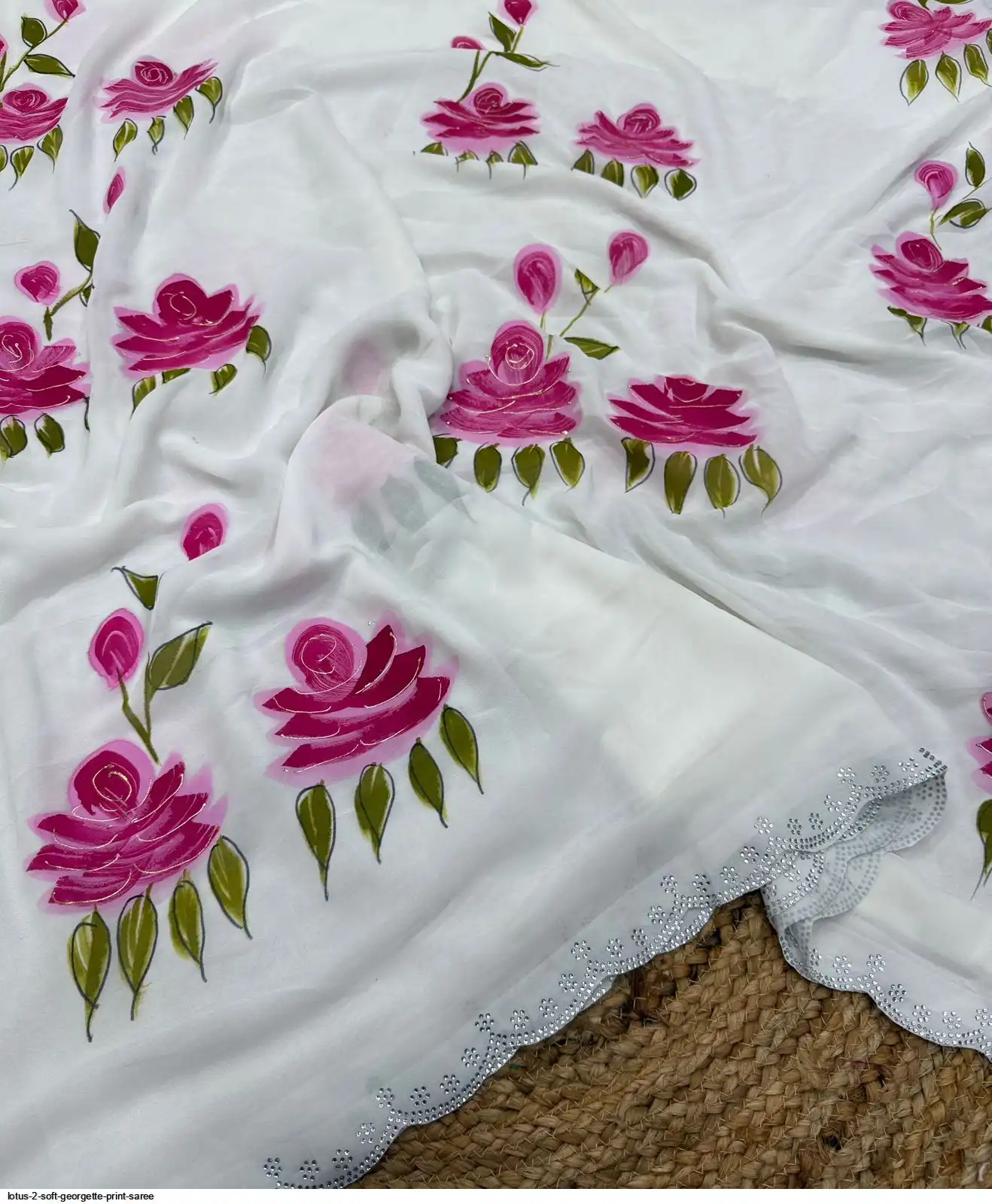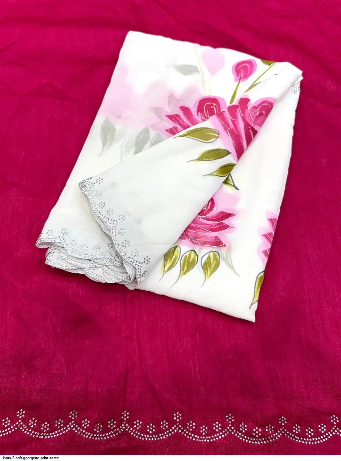 Fabric - Soft Georgette Fabric With Lotus Handbrush Print With Siroski Cutwork Bordar And Contrast Art Silk Blouse
