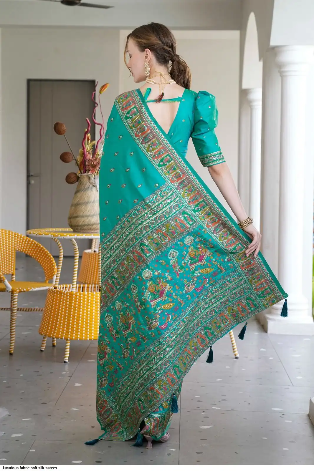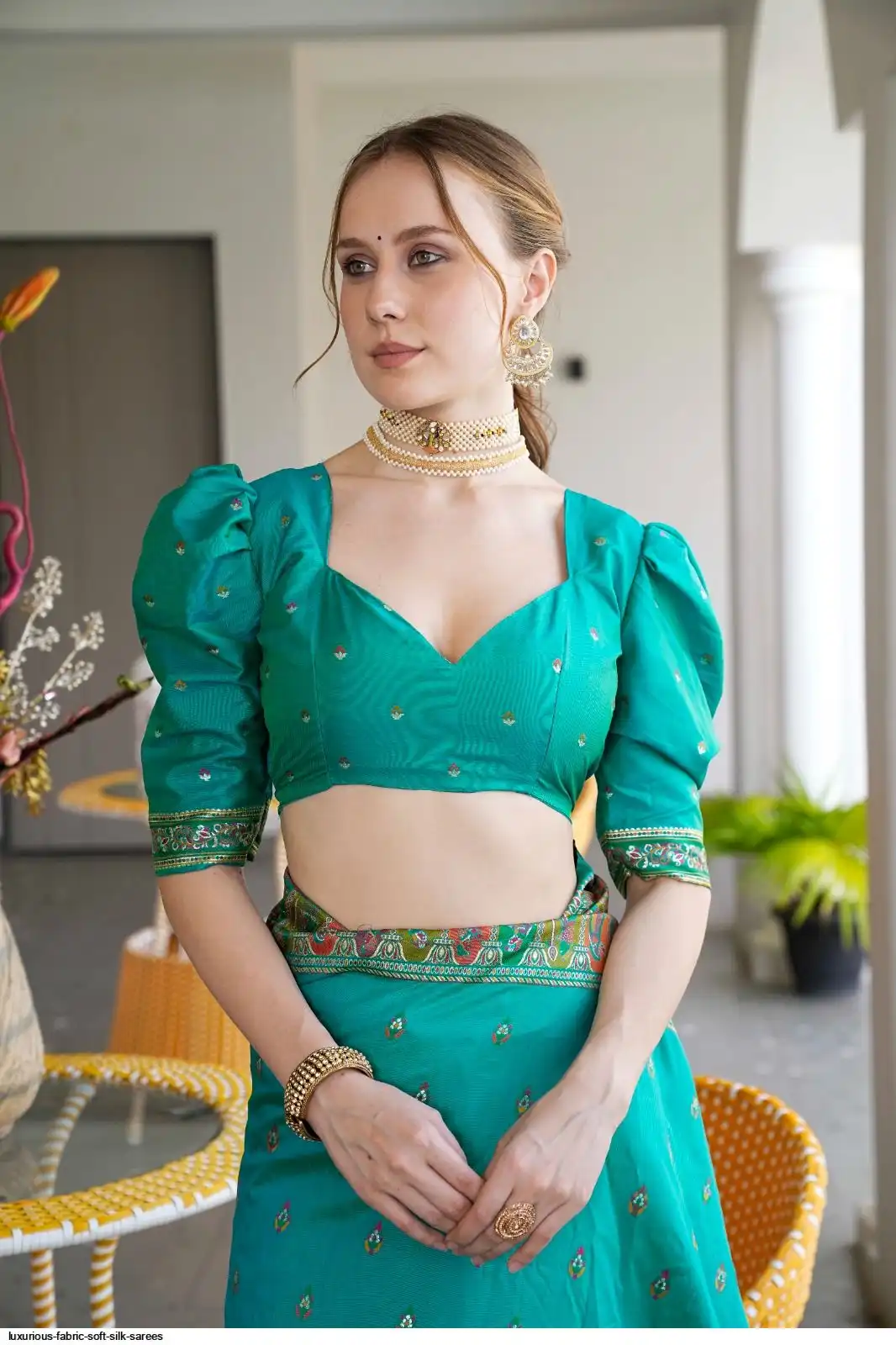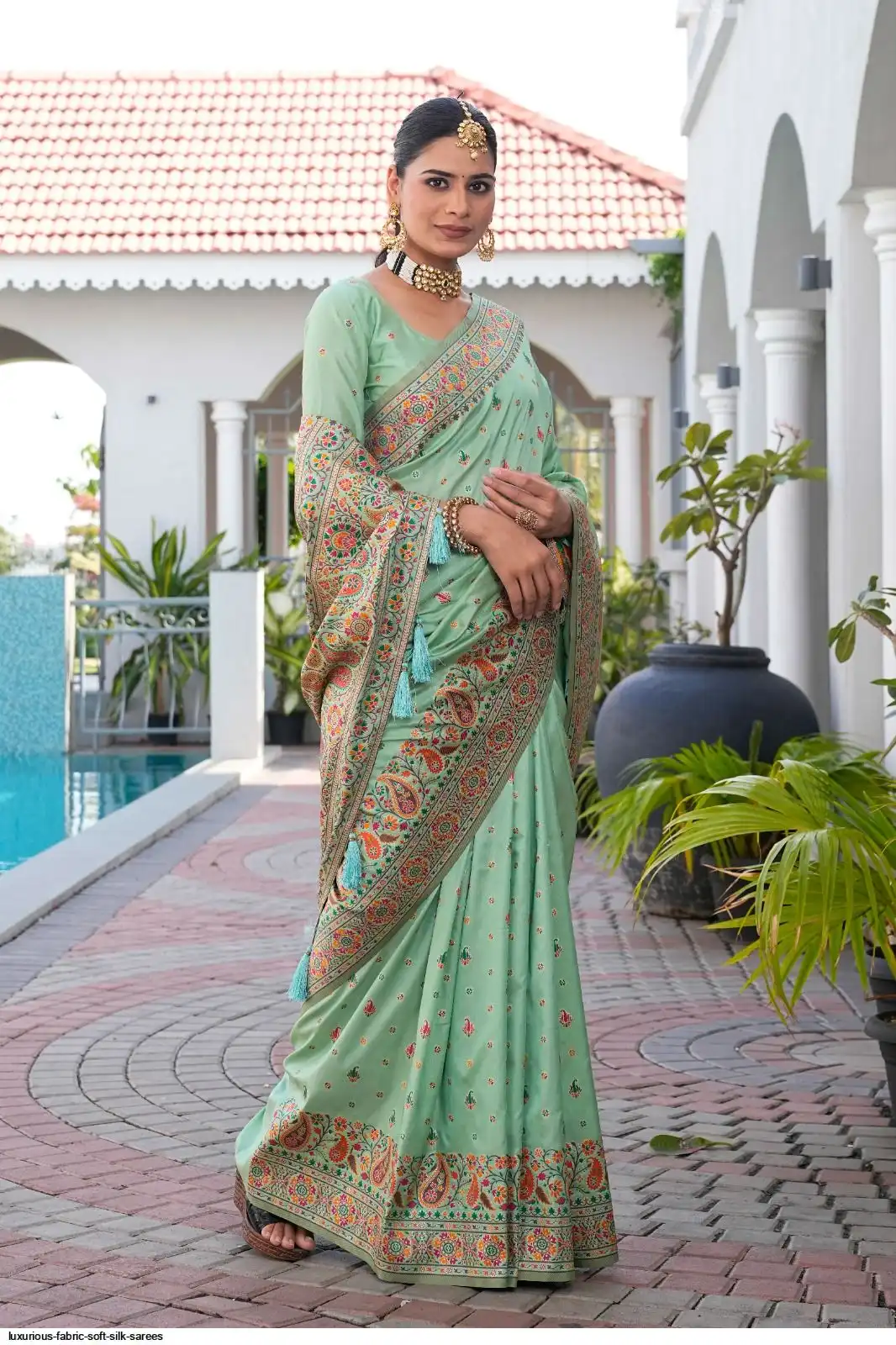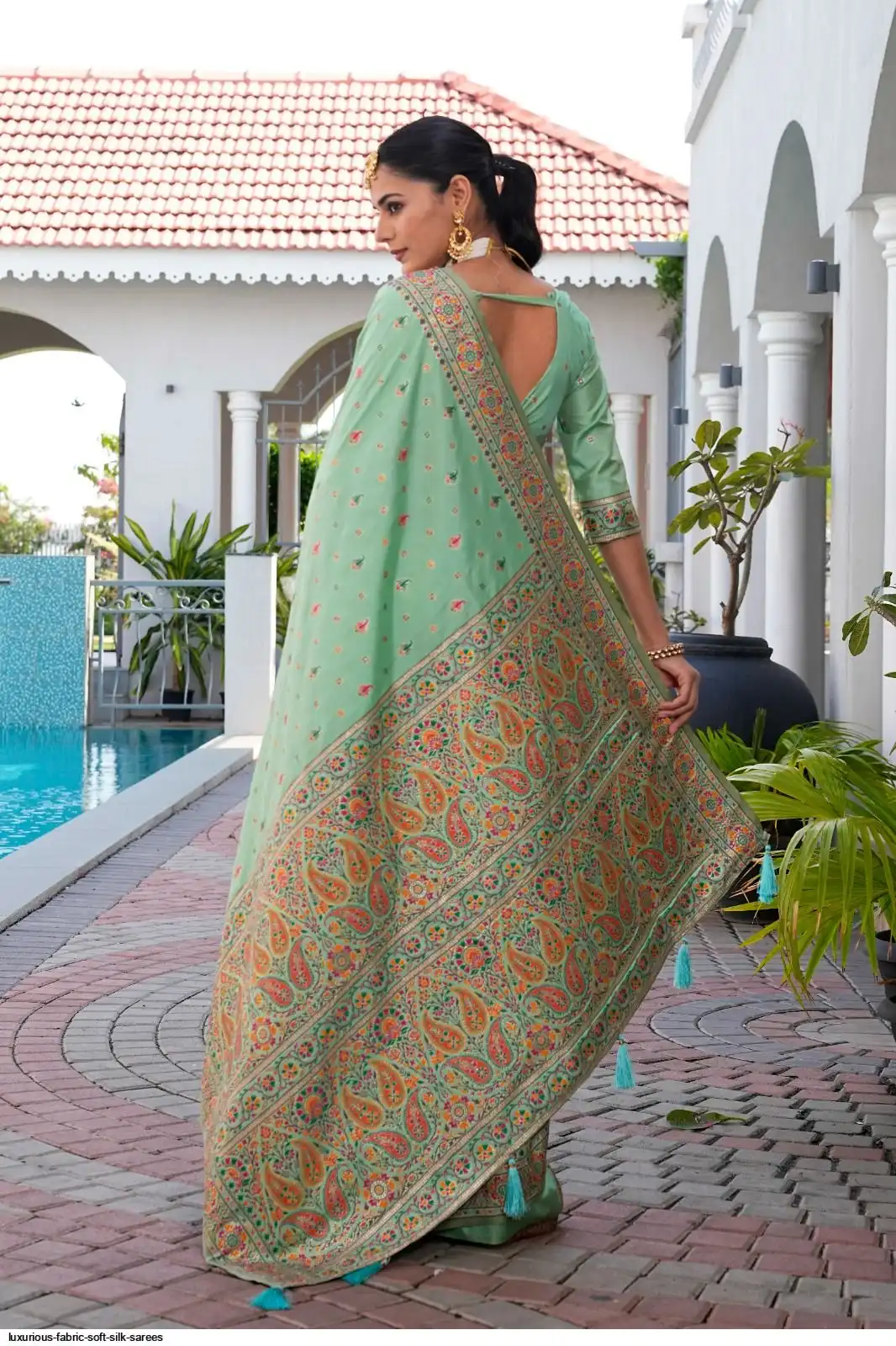 weaving, delicate butties, and a contrast Paithani border, this saree exudes timeless charm. The rich pallu with tassels and a matching weaving blouse complete the look, making it perfect for any grand occasion.