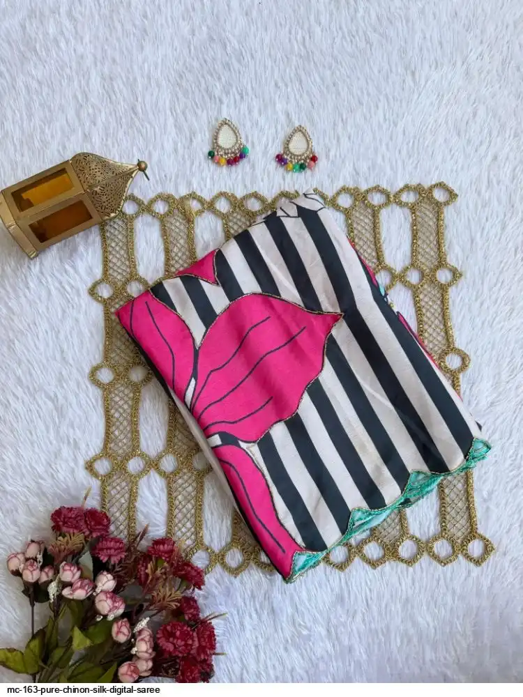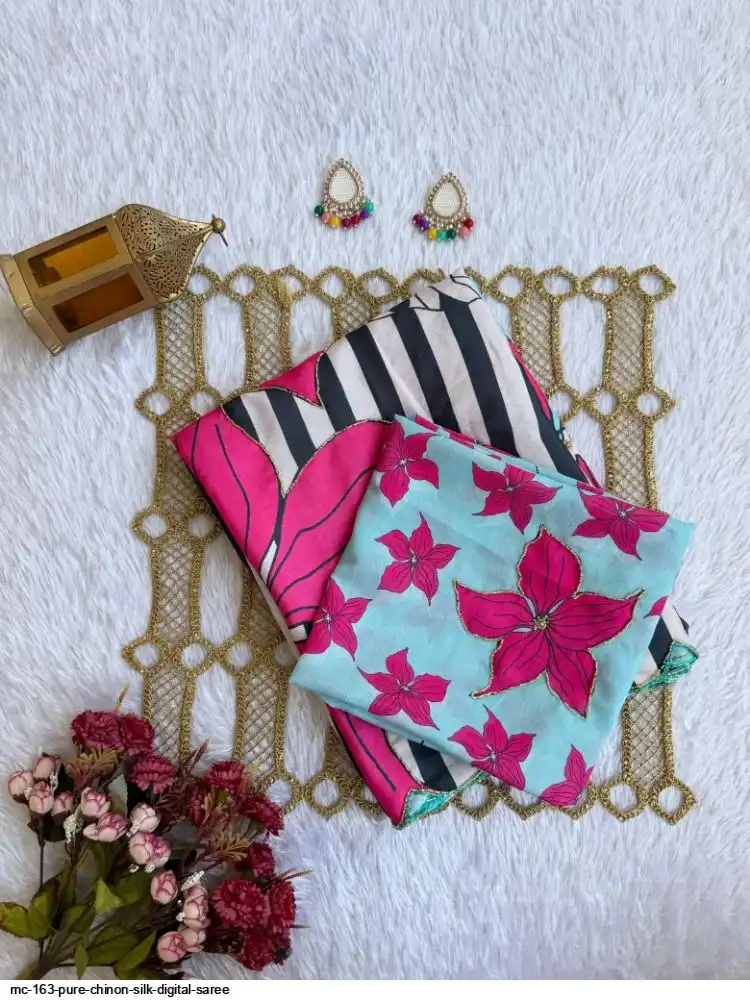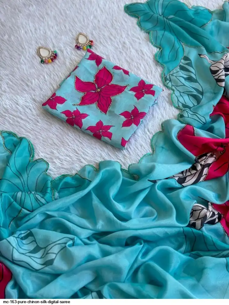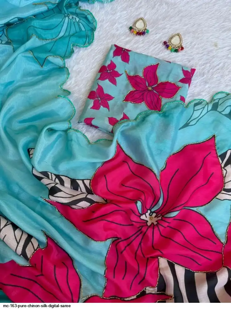 BEAUTIFUL WOMAN IN BEAUTIFUL SAREE!!..PURE CHINON SILK DIGITAL PRINT SAREE WITH GOLD RAINBOW CUTDANA HANDWORK BORDER..! UNSTITCHED CHINON SILK WITH GOLD RAINBOW CUTDANA AND DIGITAL PRINT BLOUSE