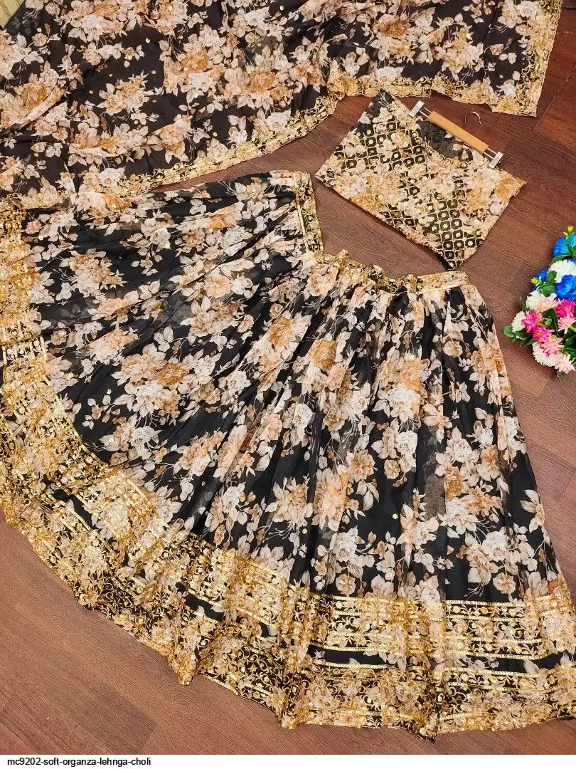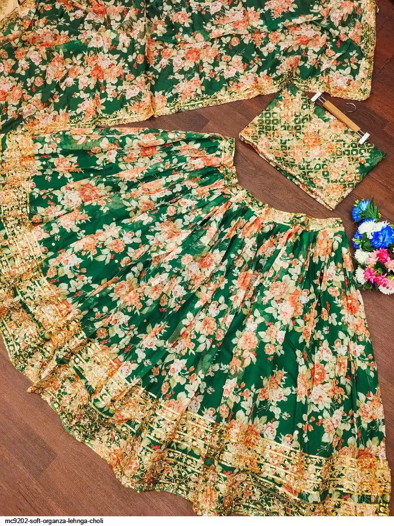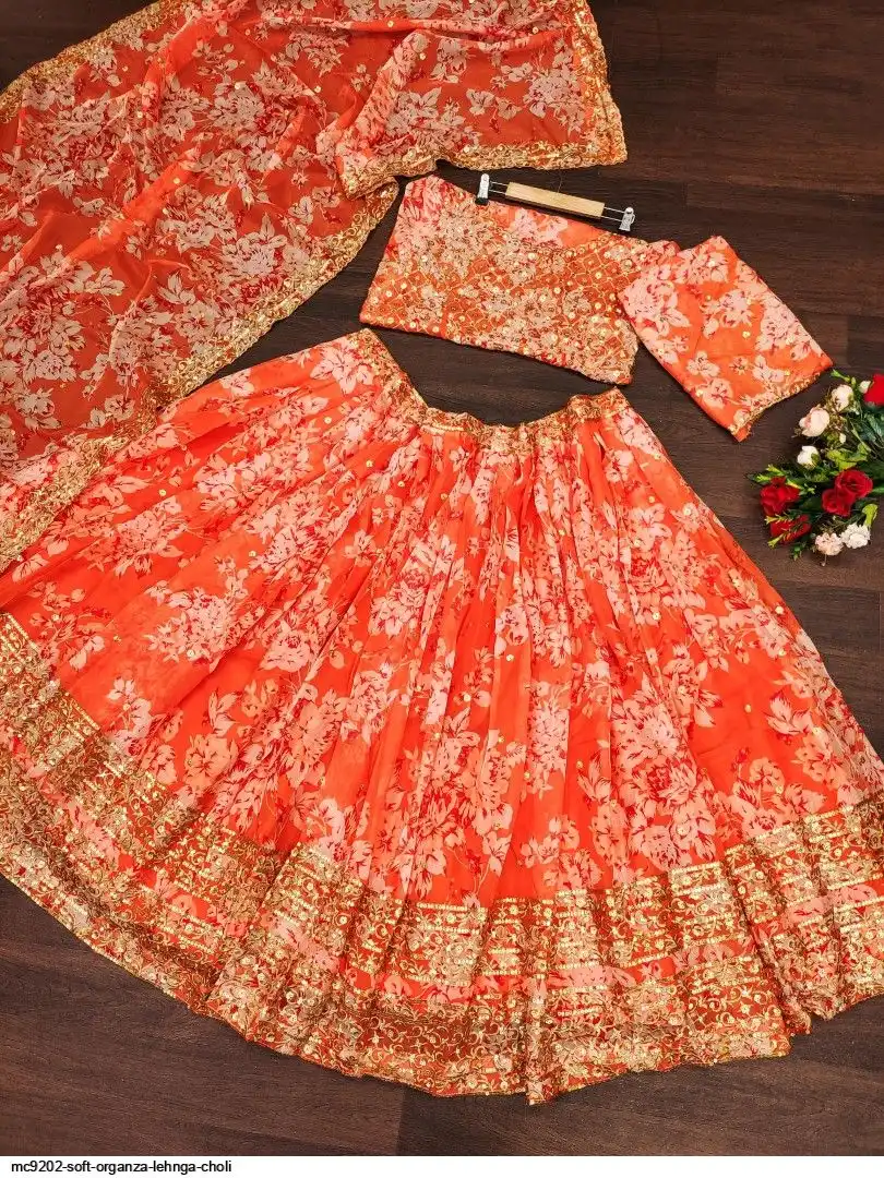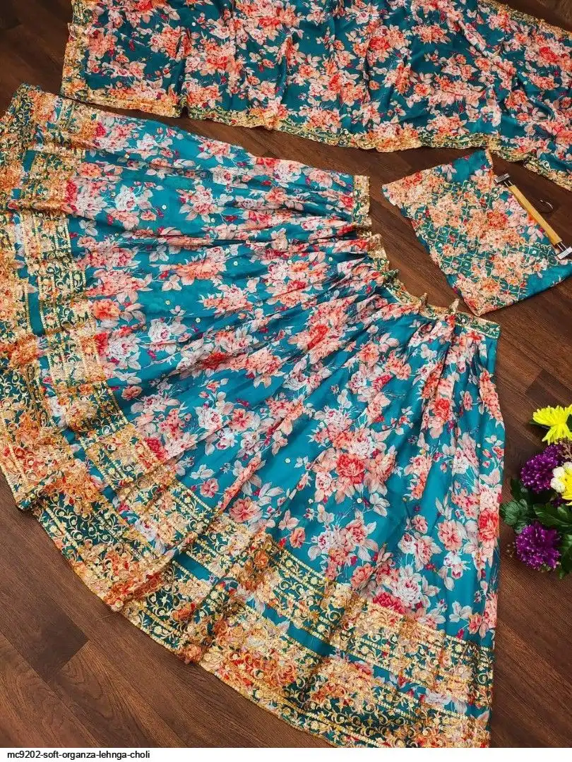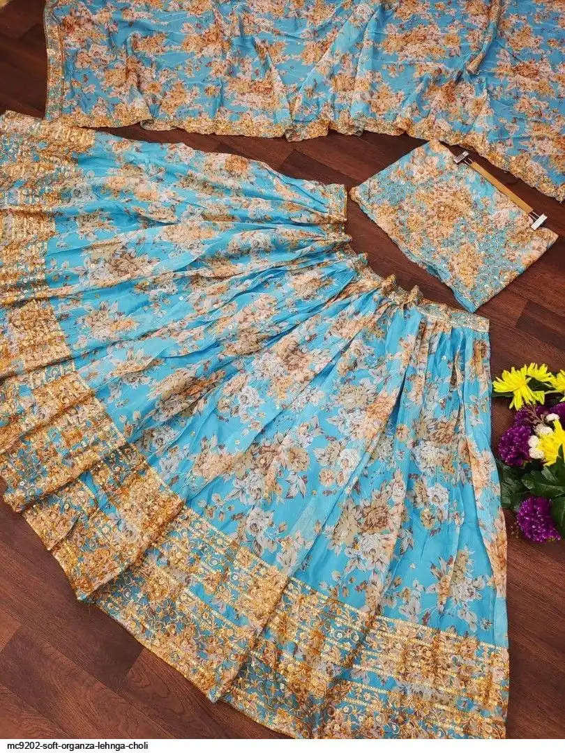 LEHNGA:SOFT ORGENZA WITH DIGITAL PRINT WITH EMBROIDERY JARI SEQUENCE DESIGNE WORK