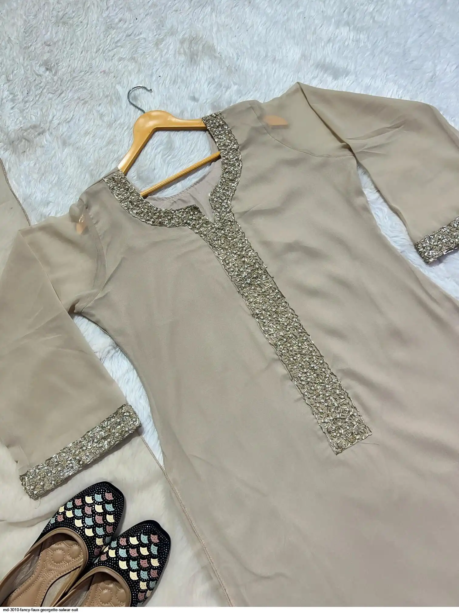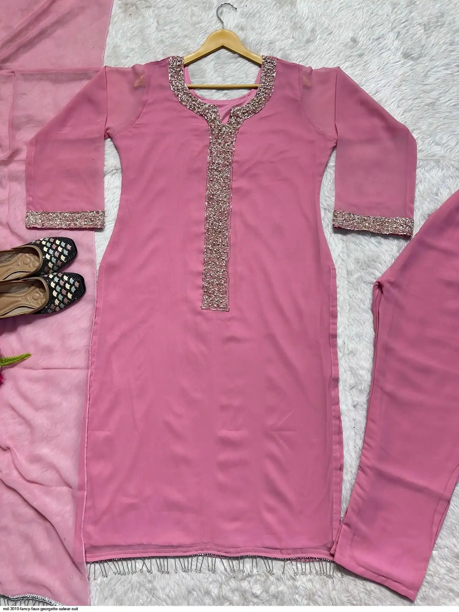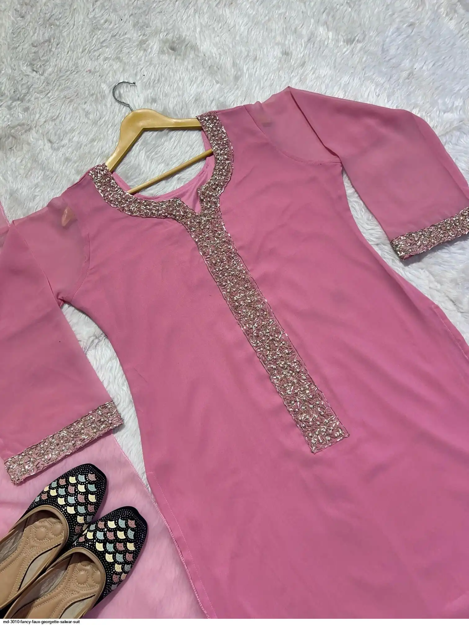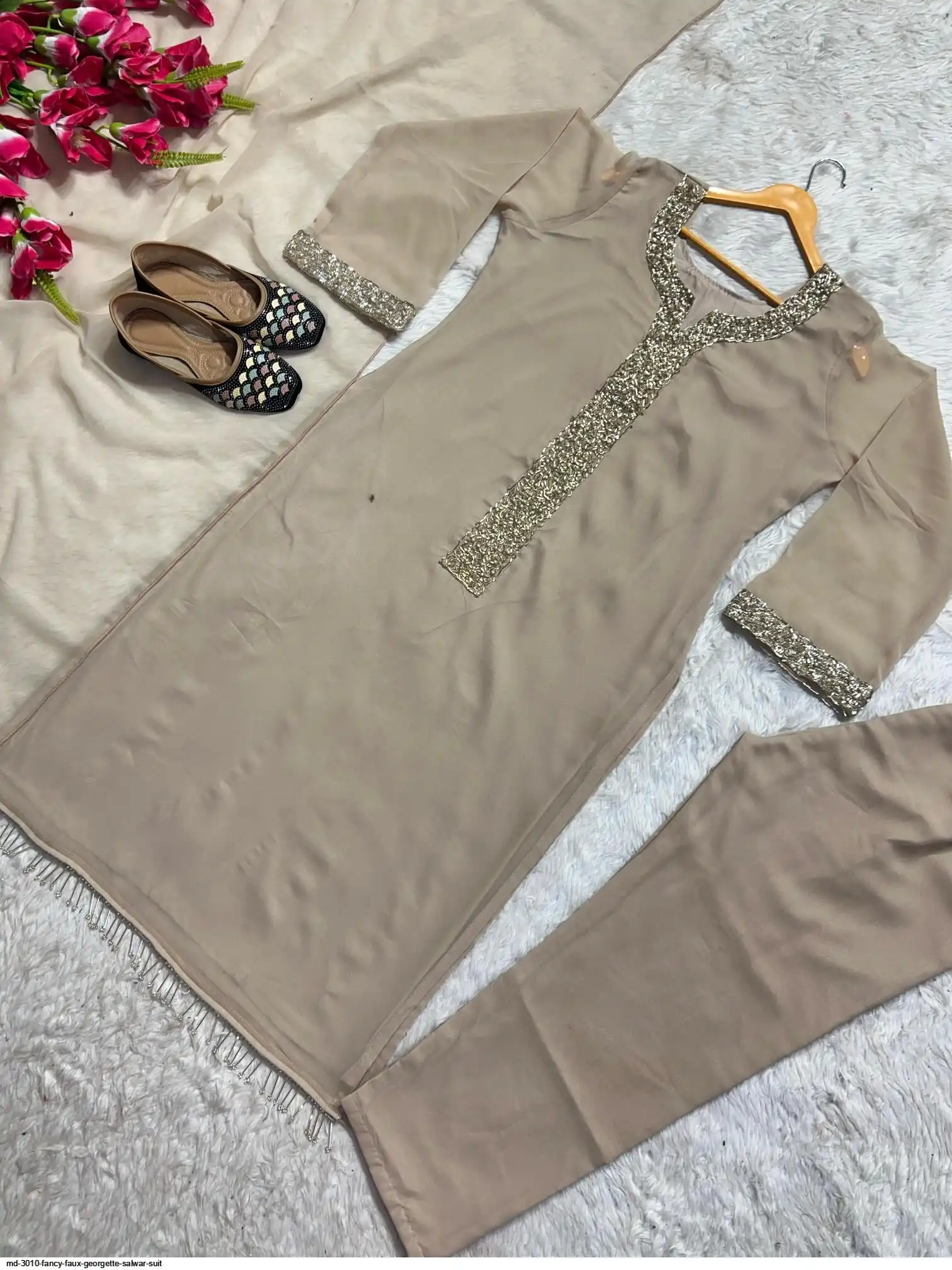 DESIRABLE FANCY FAUX GEORGETTE REAL MOTI HAND WORK TOP AND PENT WITH DUPATTA