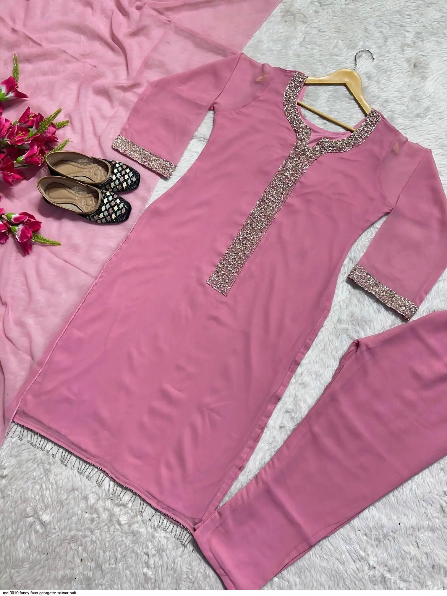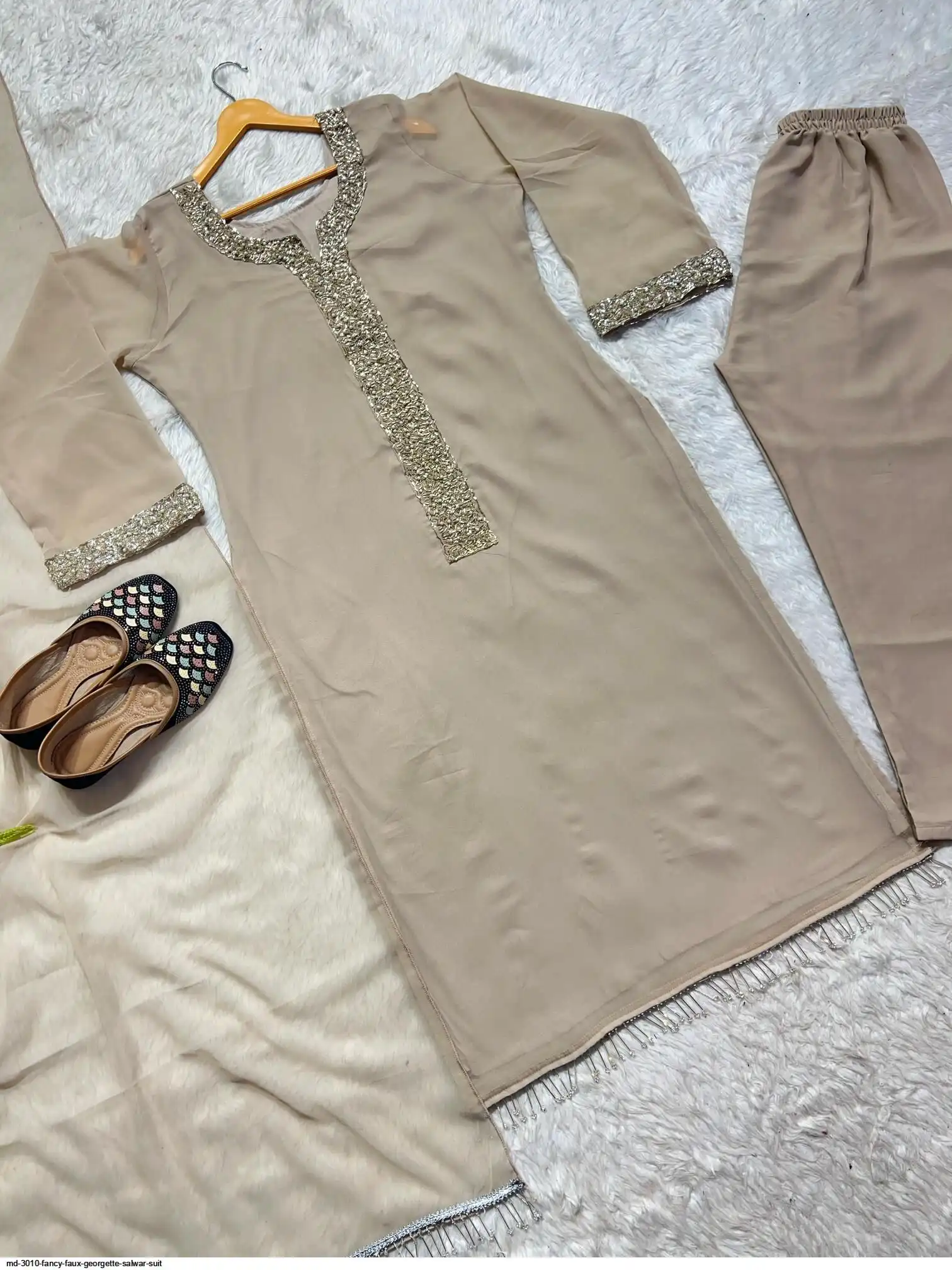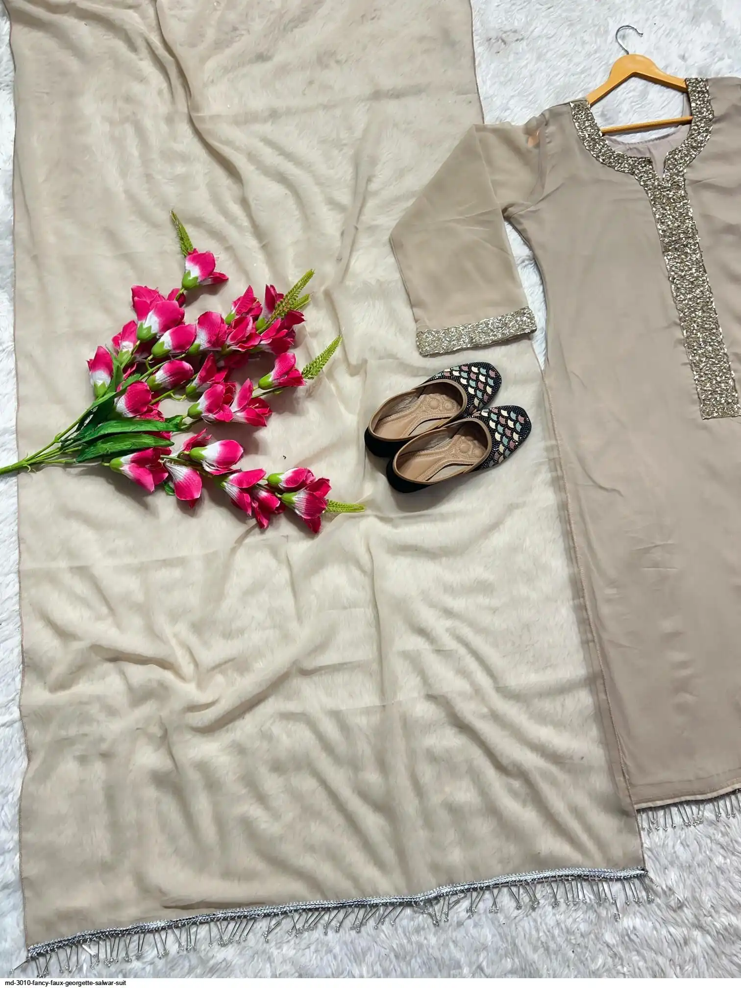 DESIRABLE FANCY FAUX GEORGETTE REAL MOTI HAND WORK TOP AND PENT WITH DUPATTA