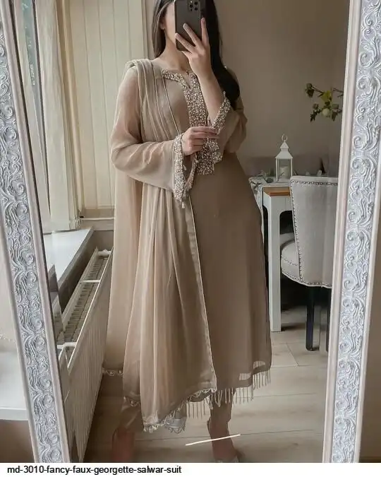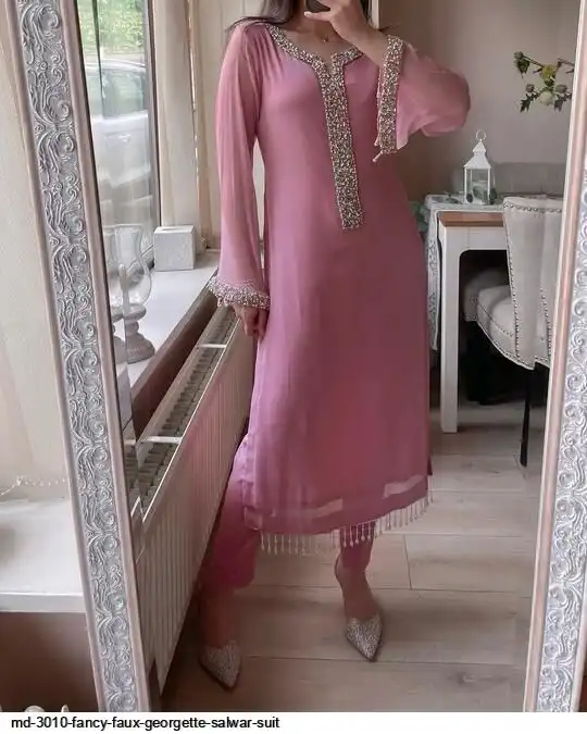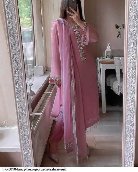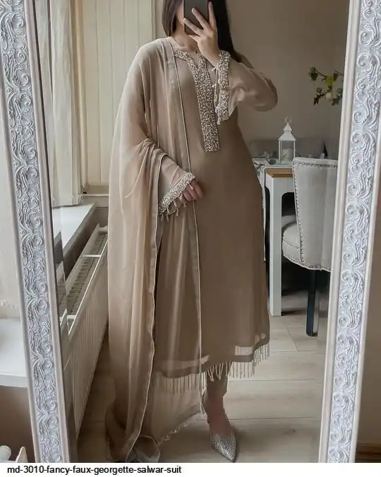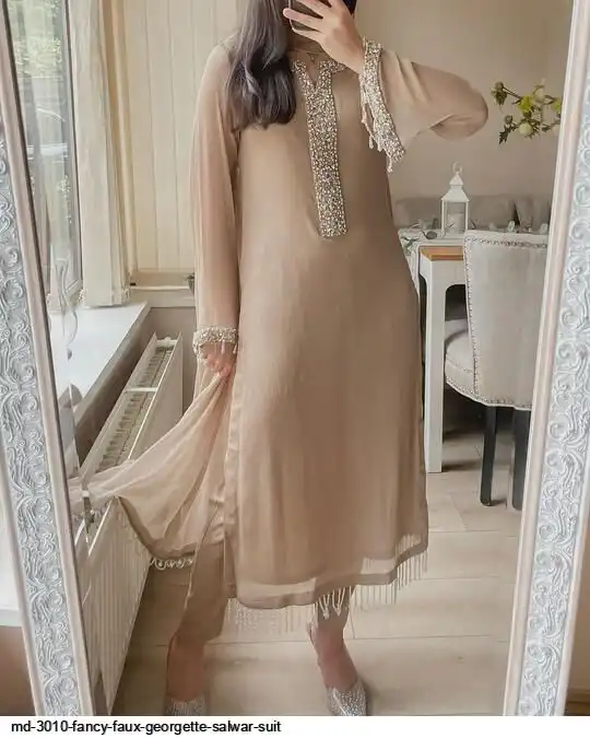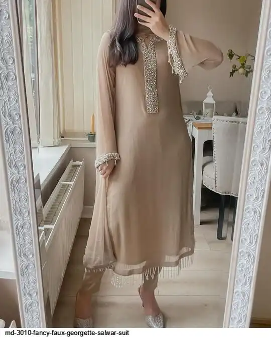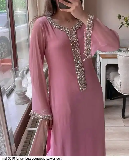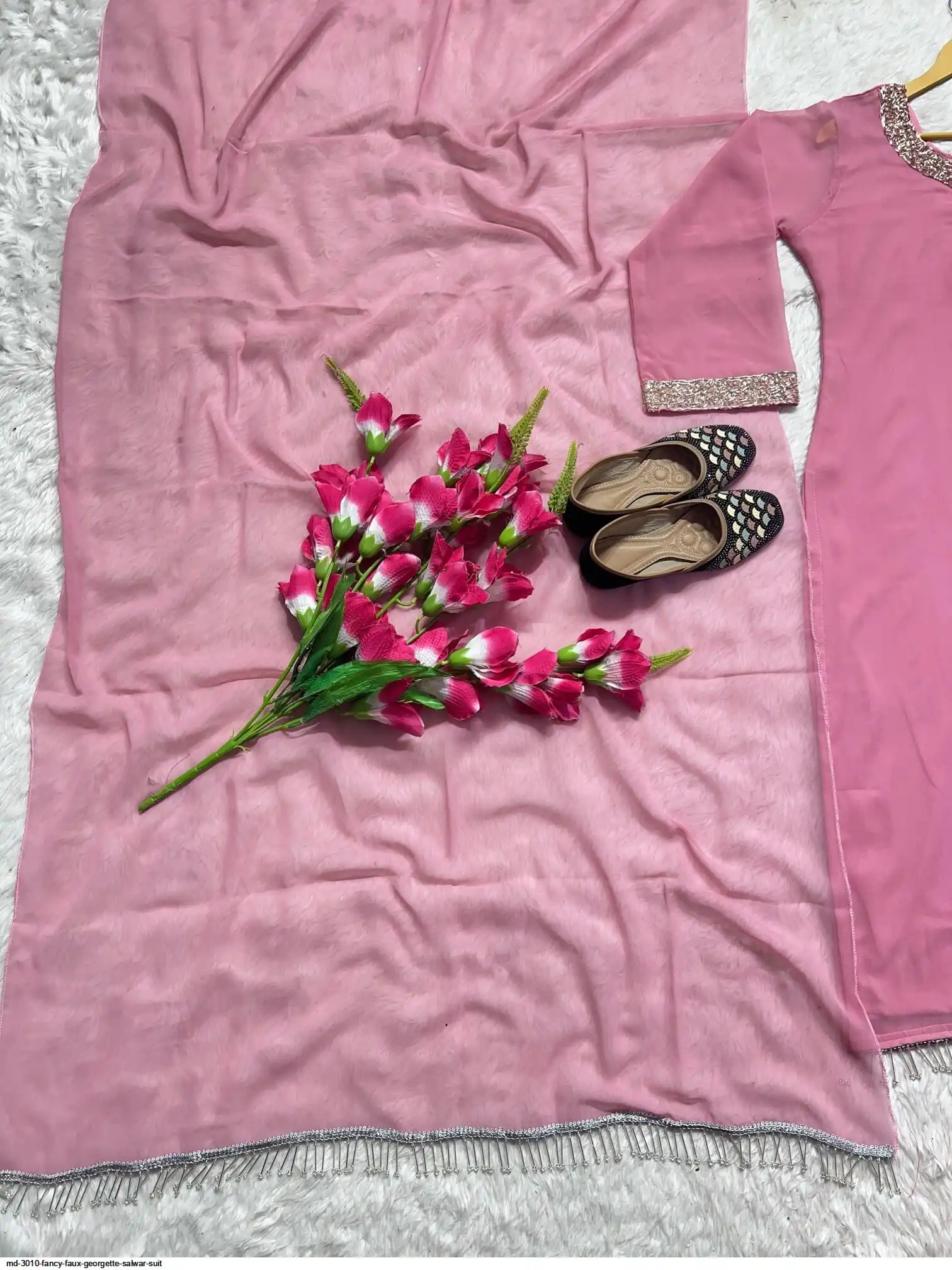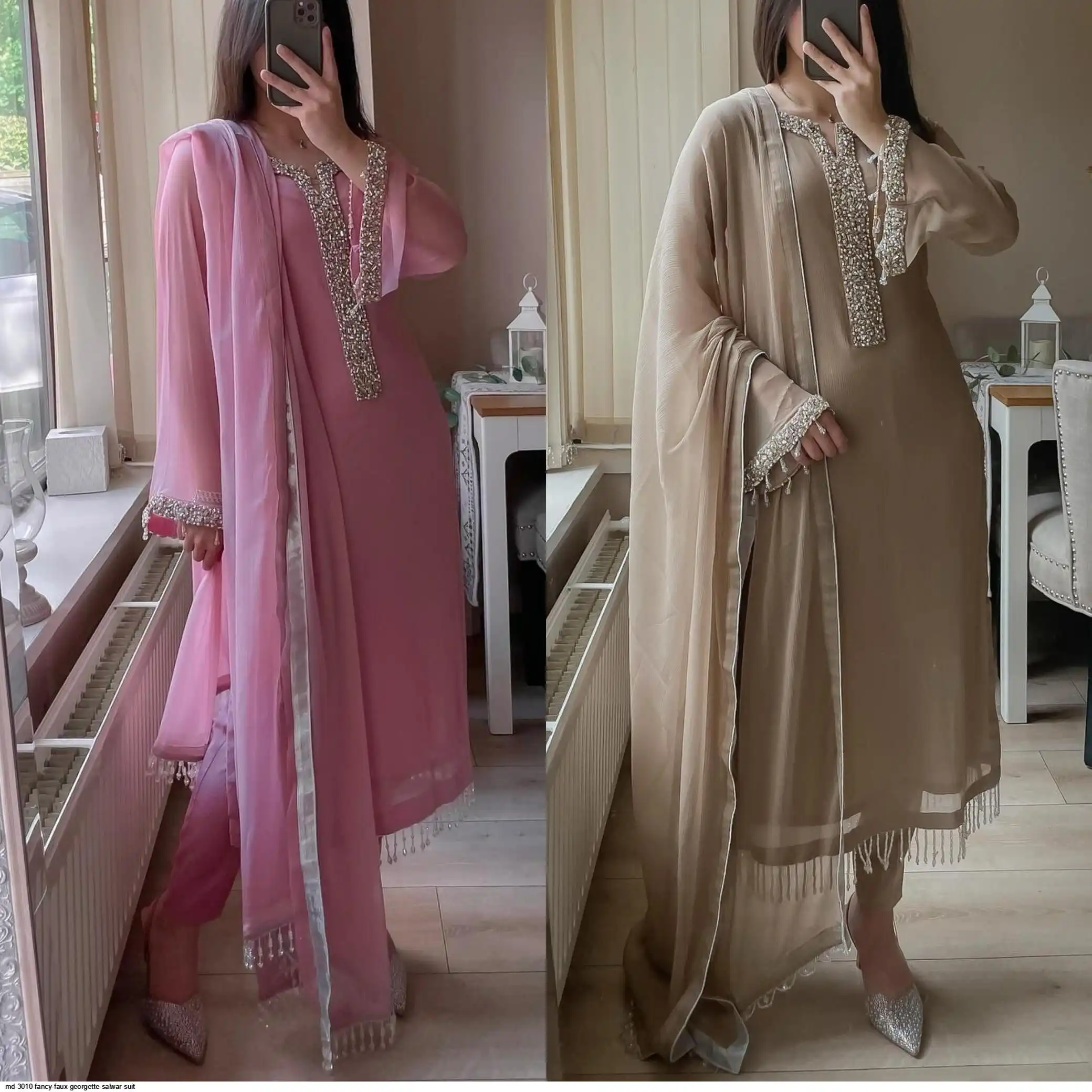 DESIRABLE FANCY FAUX GEORGETTE REAL MOTI HAND WORK TOP AND PENT WITH DUPATTA