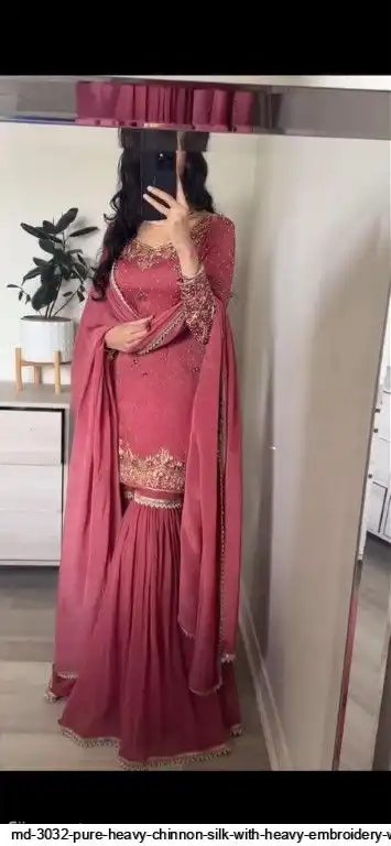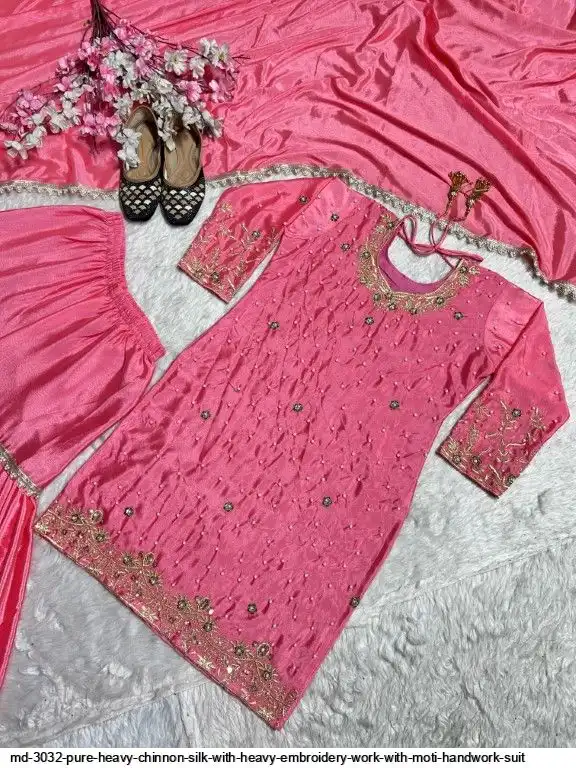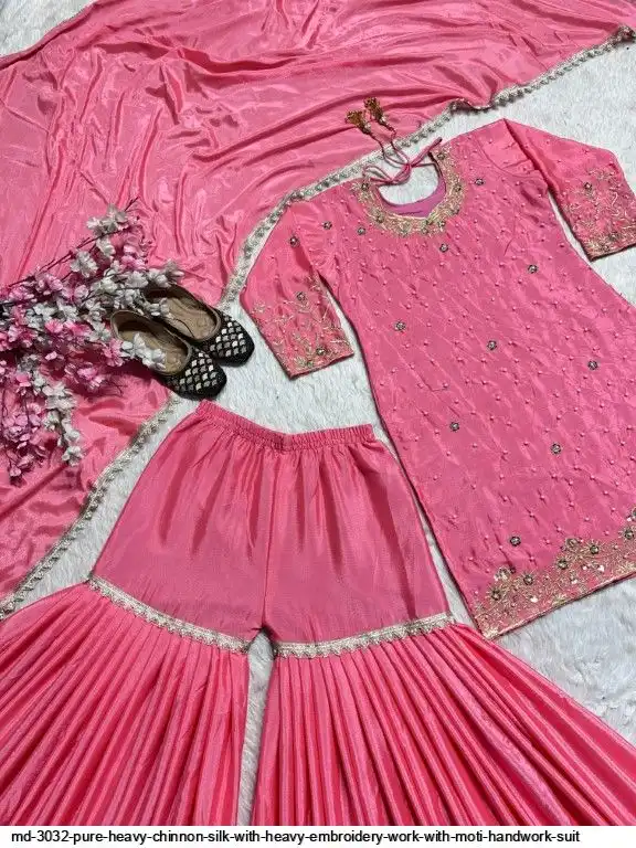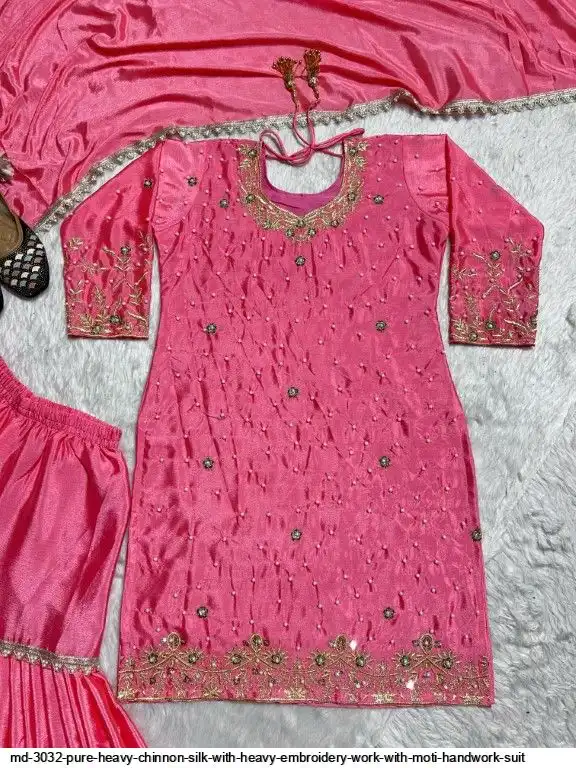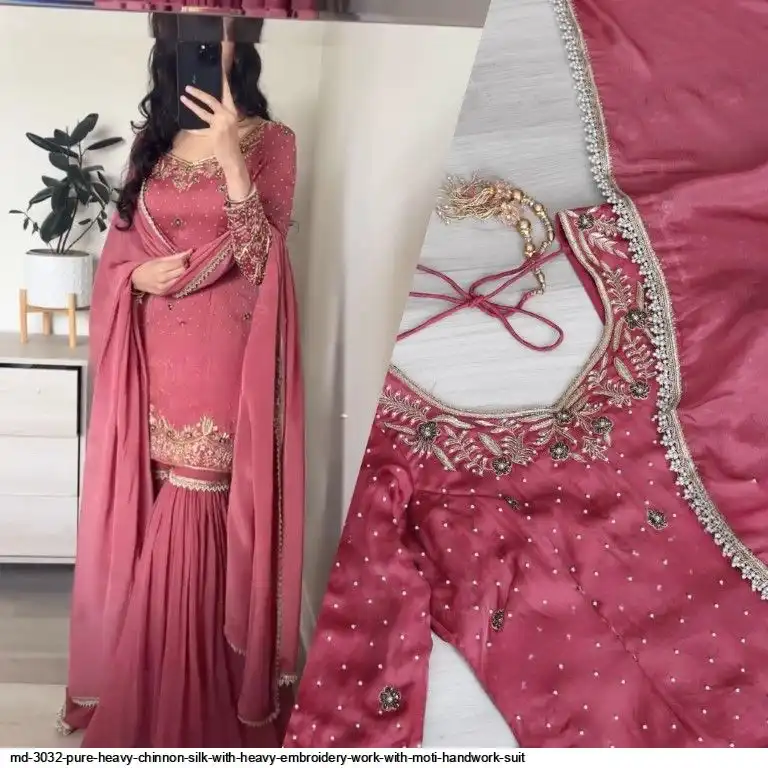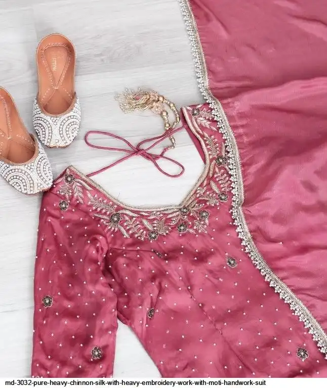 Dupatta Fabric :Pure Heavy Chinnon Silk Moti Handwork Fancy Borders Less Work.