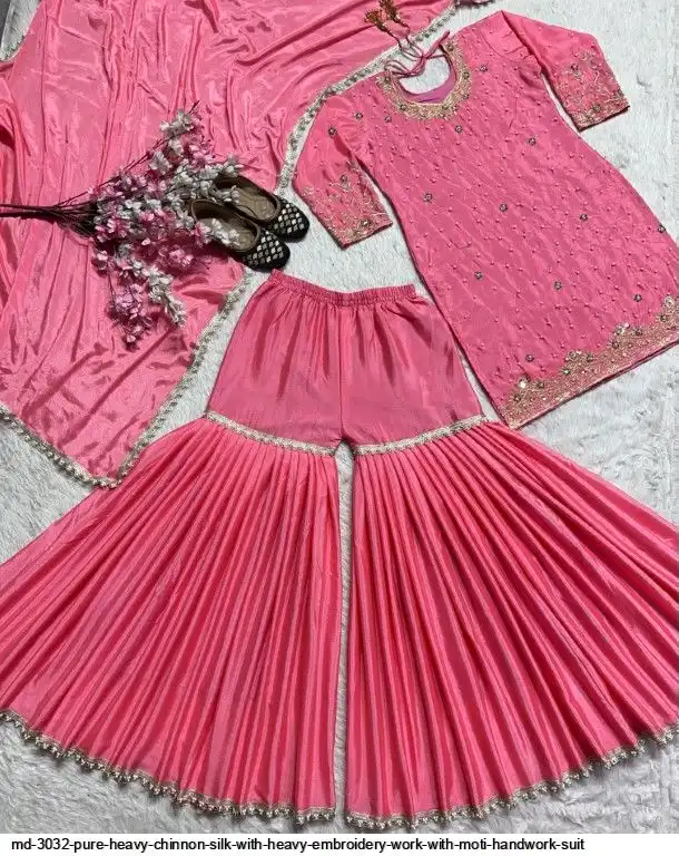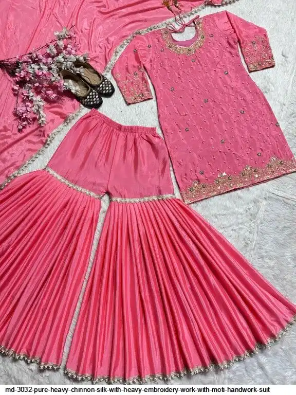 Palazzo Fabrics :Pure Heavy Chinnon Silk With Moti Handwork Fancy Borders Less Work Fully Flair.