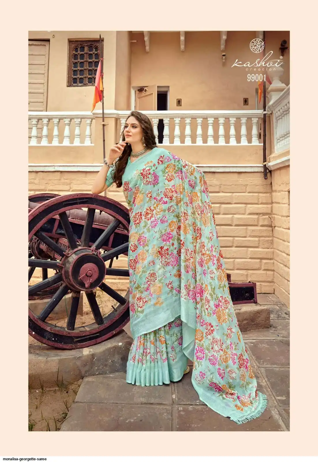 Fabric - GEORGETTE JACQUARD BORDER WITH FANCY PRINT WITH FOIL AND HEAVY JALAR IN PALLU WITH RUNNING BLOUSE