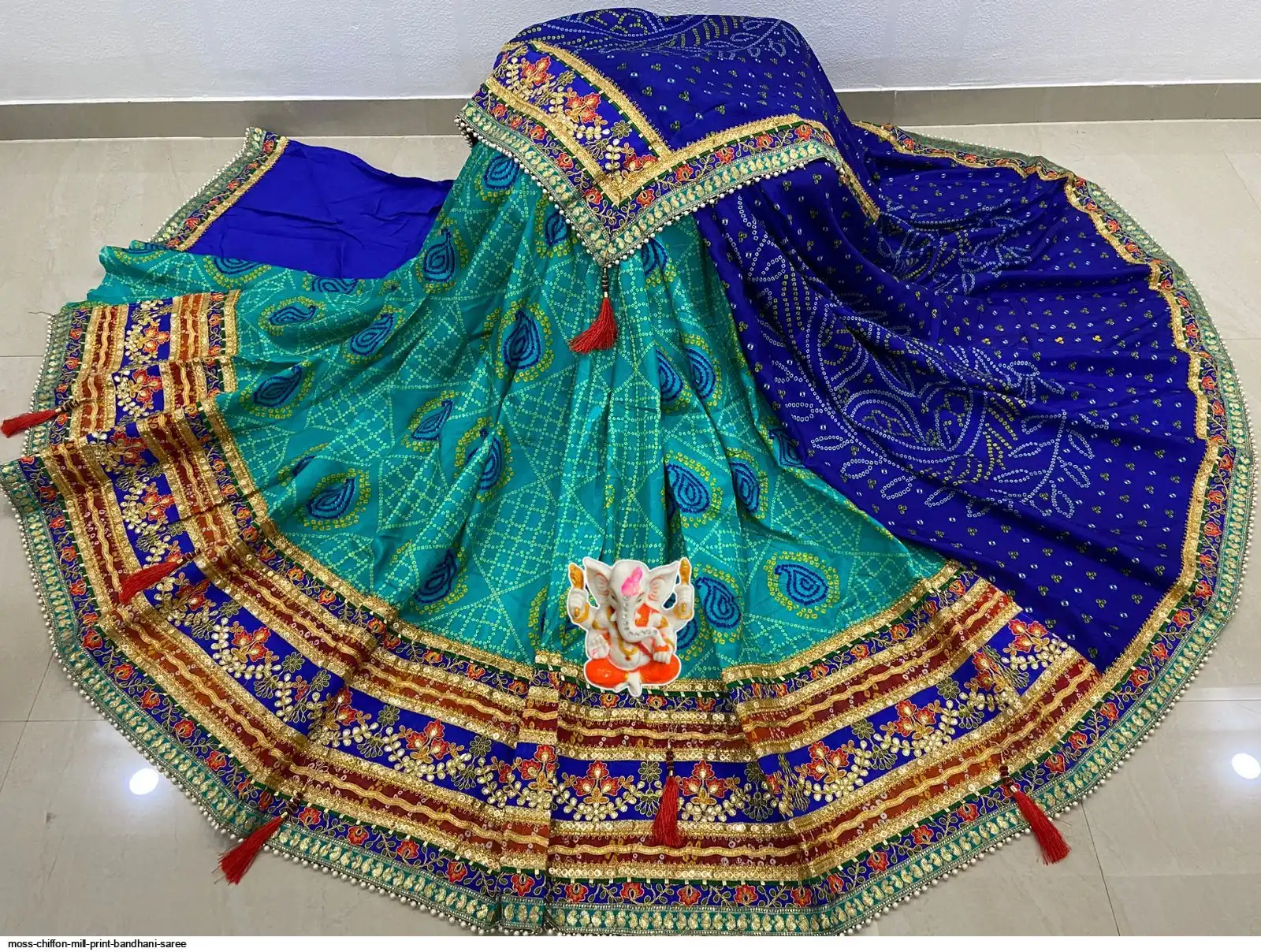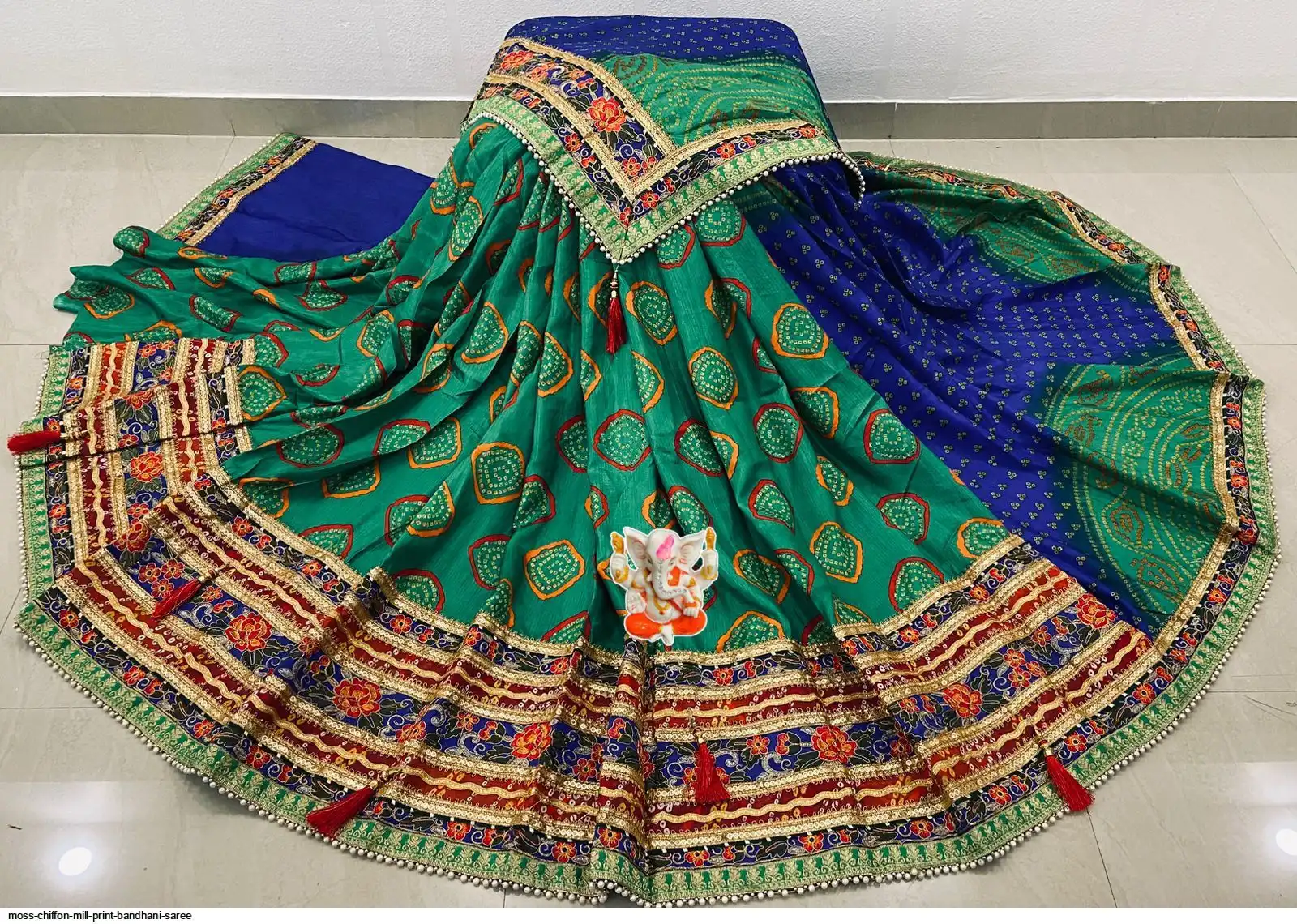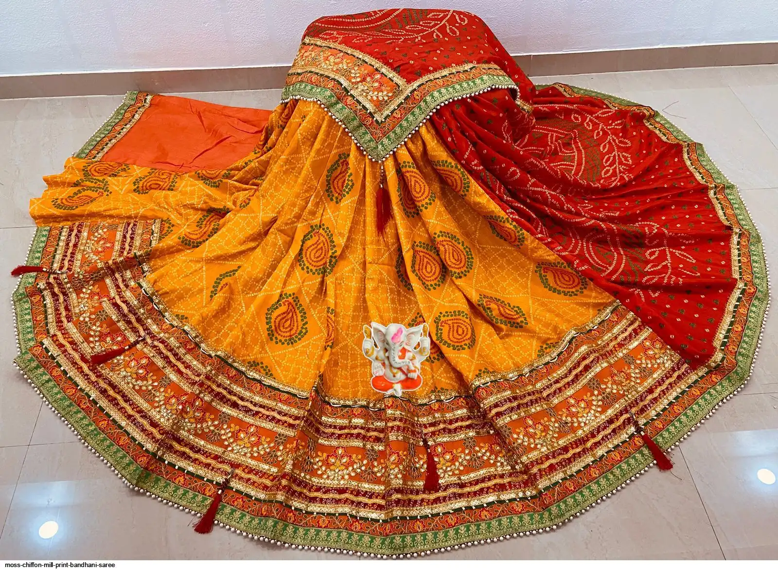 Fabric=moss chiffon with mill prints Bandhani sarees without joint and shoft fabric with Heavy gotta patti work with pears moti lace broder