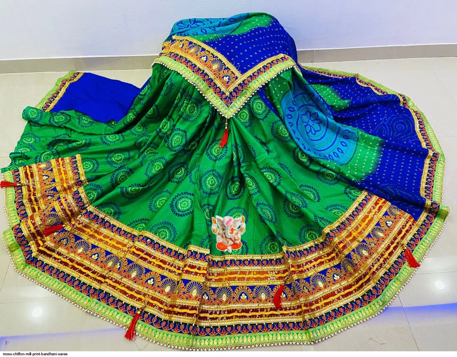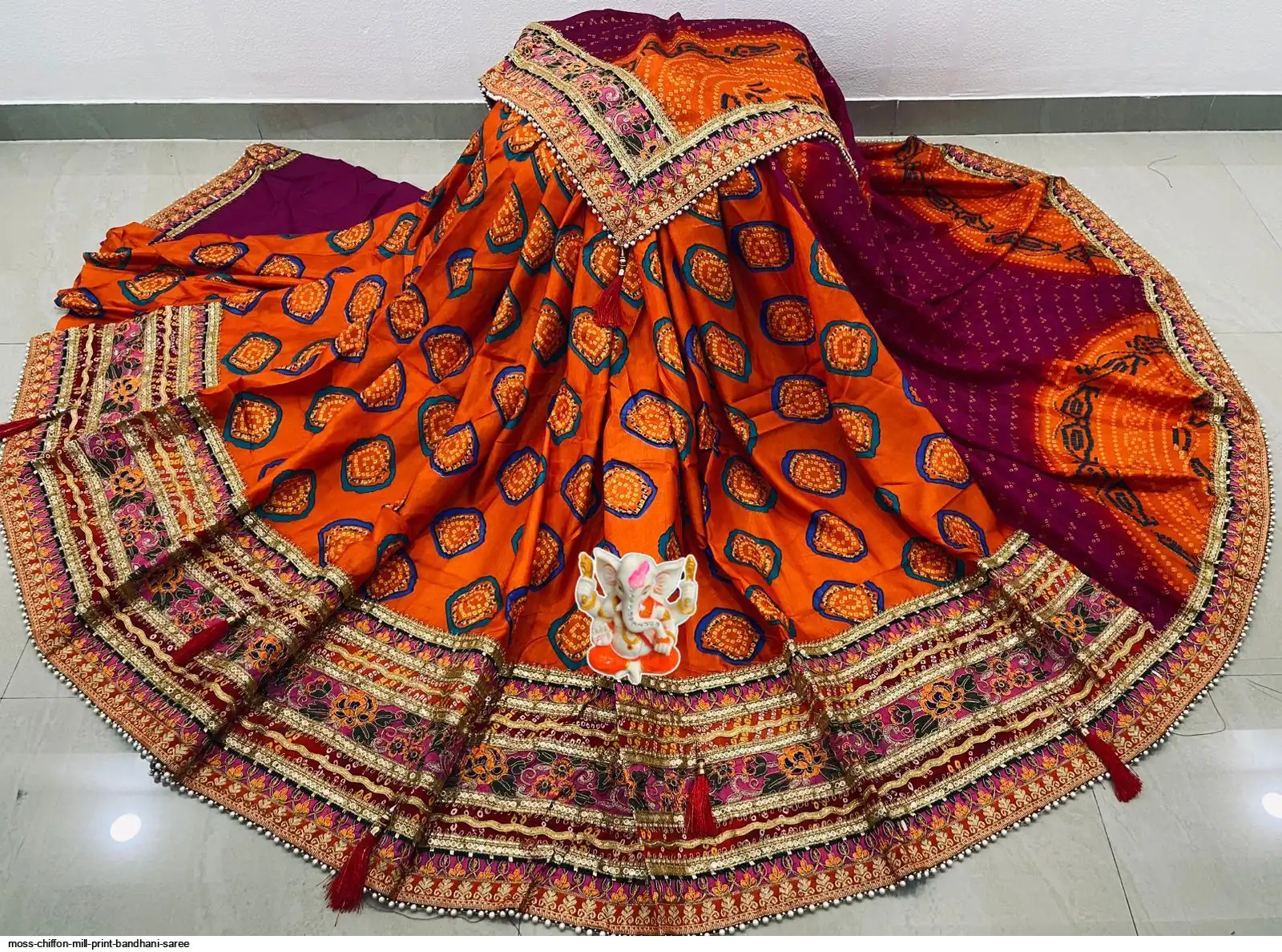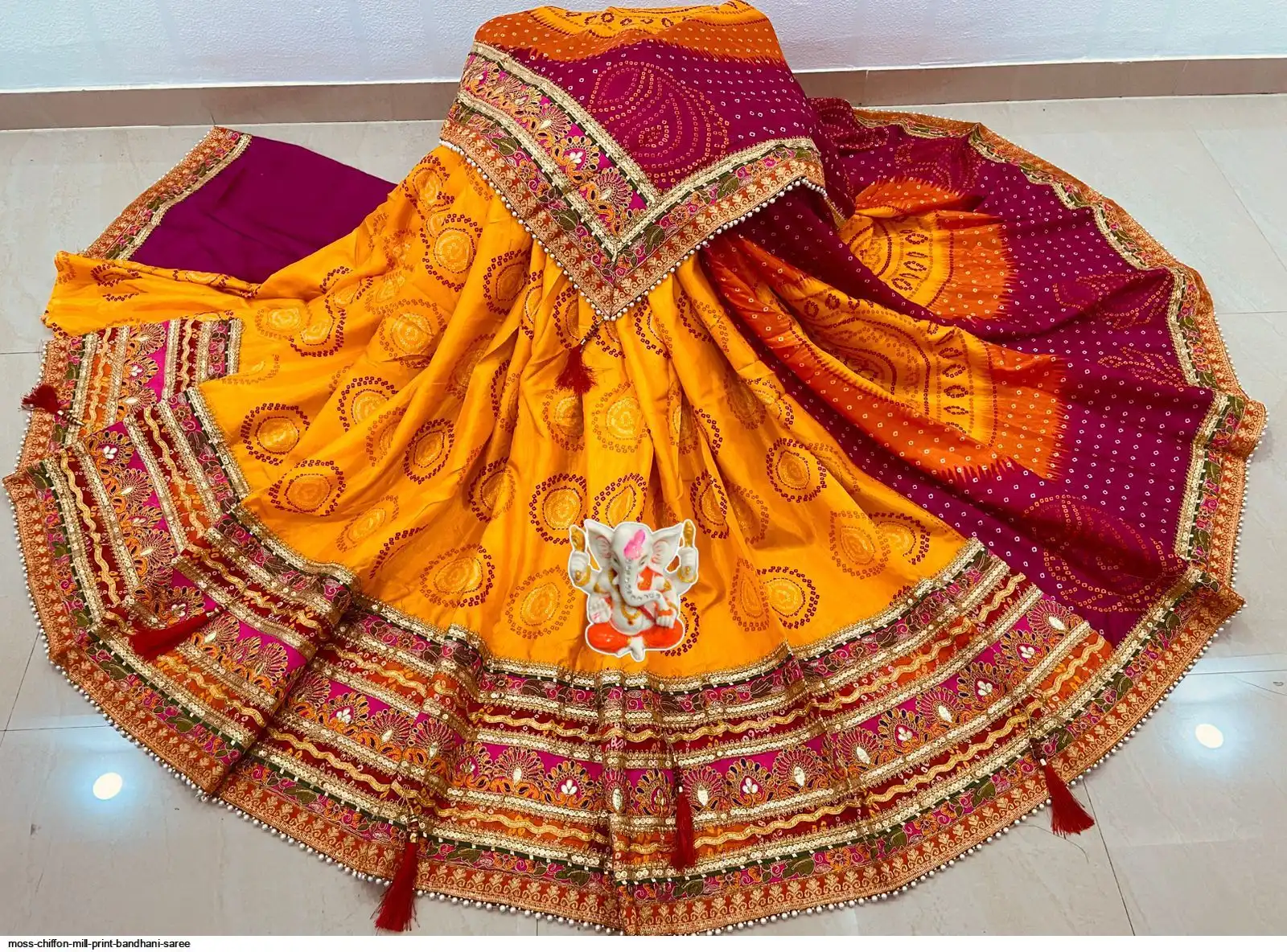 Fabric=moss chiffon with mill prints Bandhani sarees without joint and shoft fabric with Heavy gotta patti work with pears moti lace broder