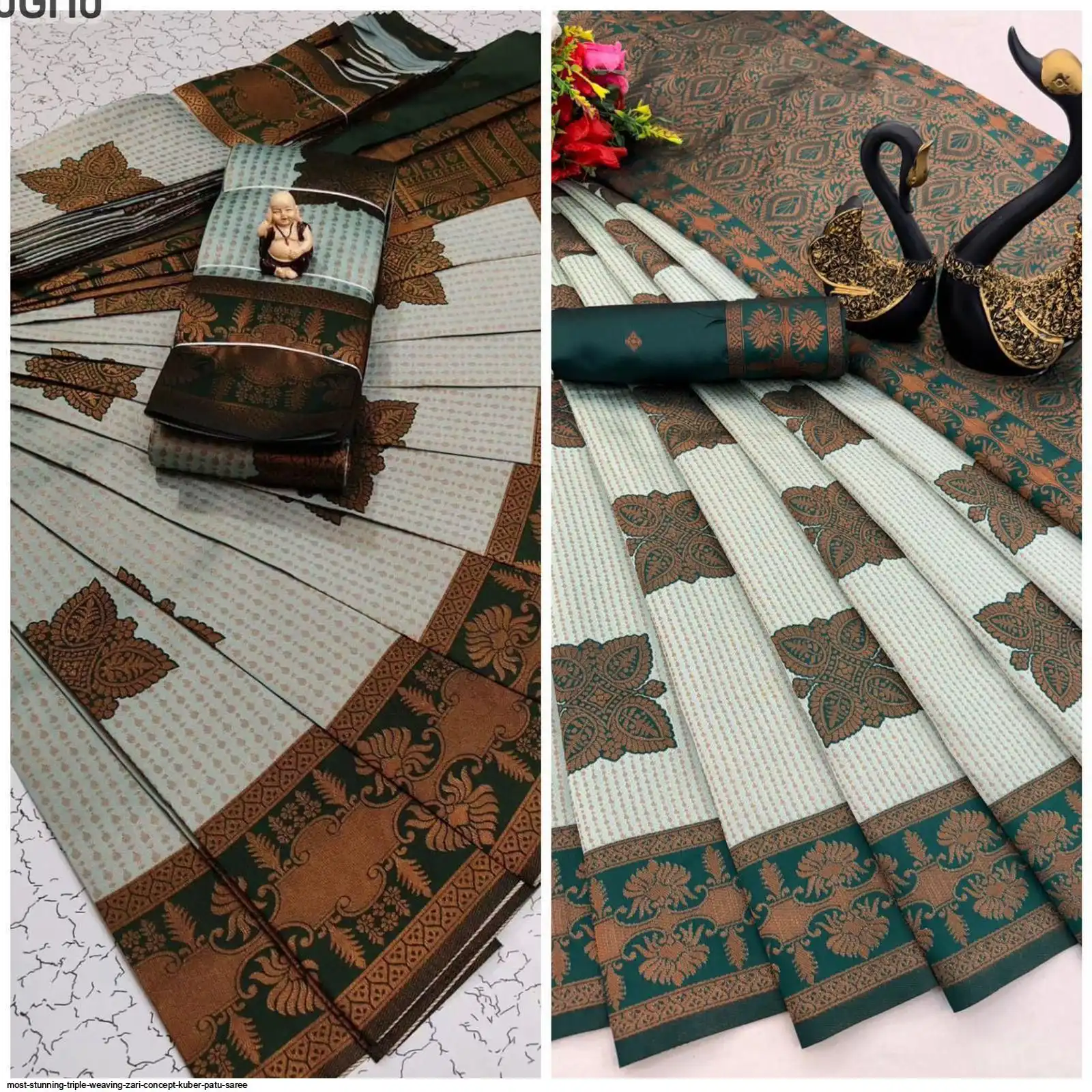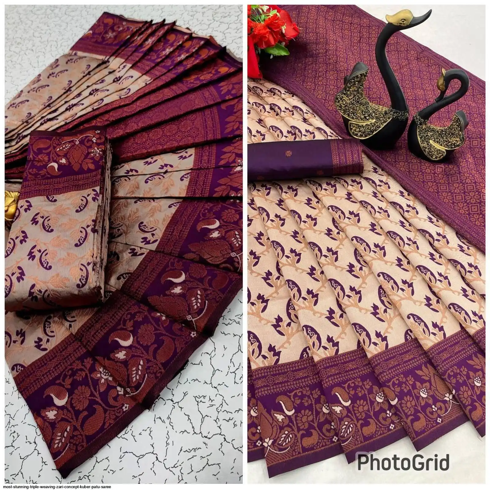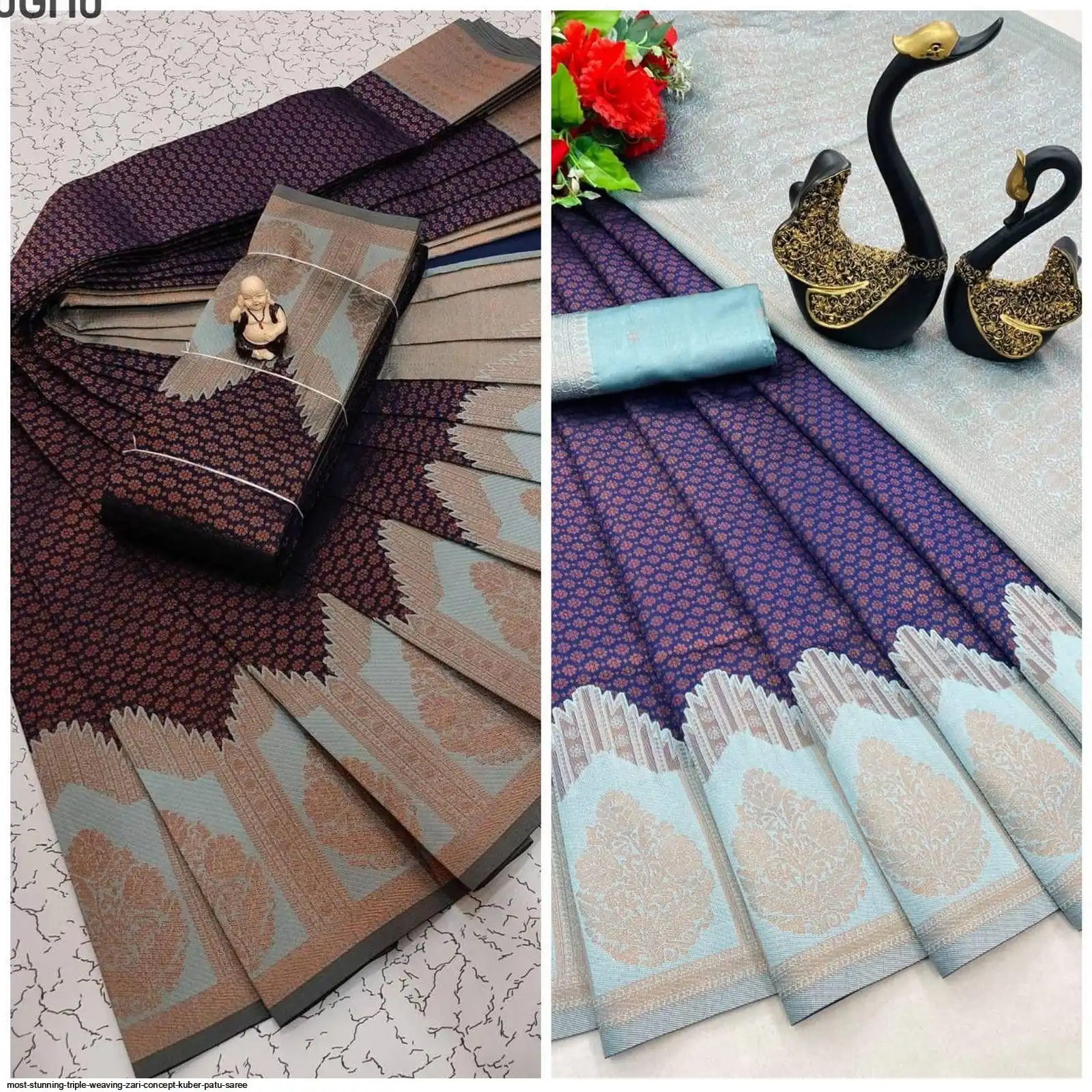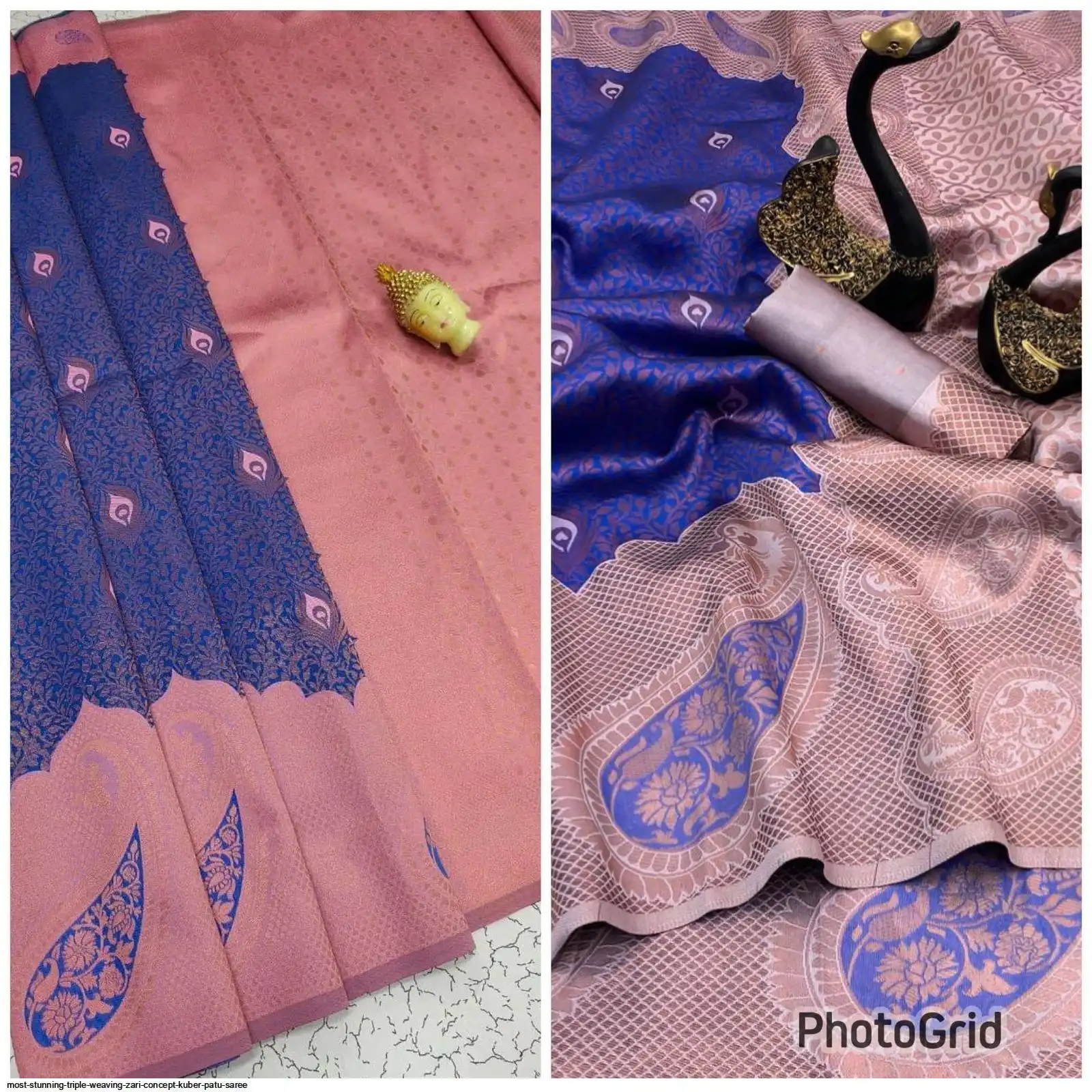 Most Stunning Triple Weaving Zari Concept Kuber patu Sarees . This concept Sarees is best for Party and wedding Occasion. This Kuber pattu Kanchi Sarees is made of Pure Copper Zari and Self Design with contrast Colour Meena makes Sarees Adorable