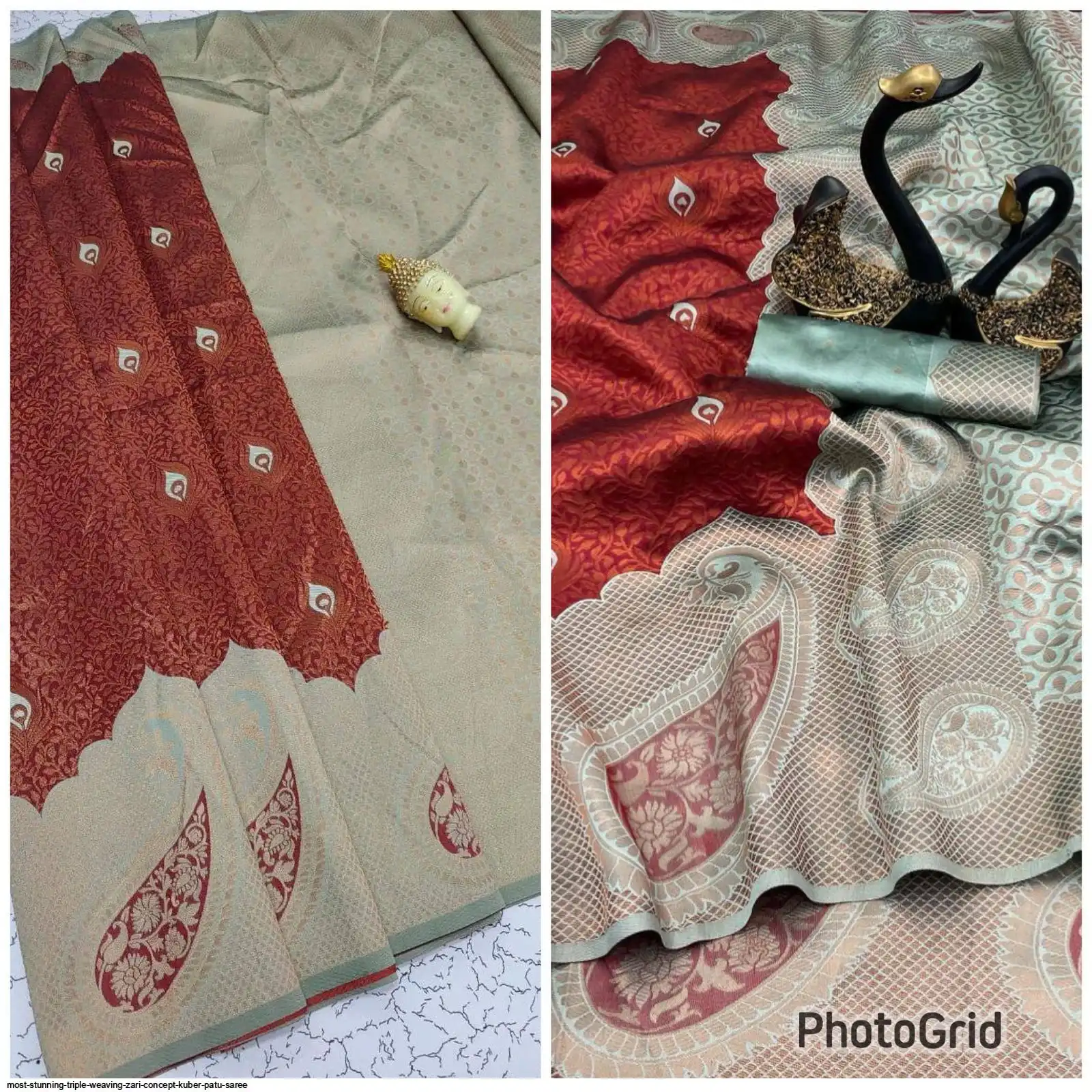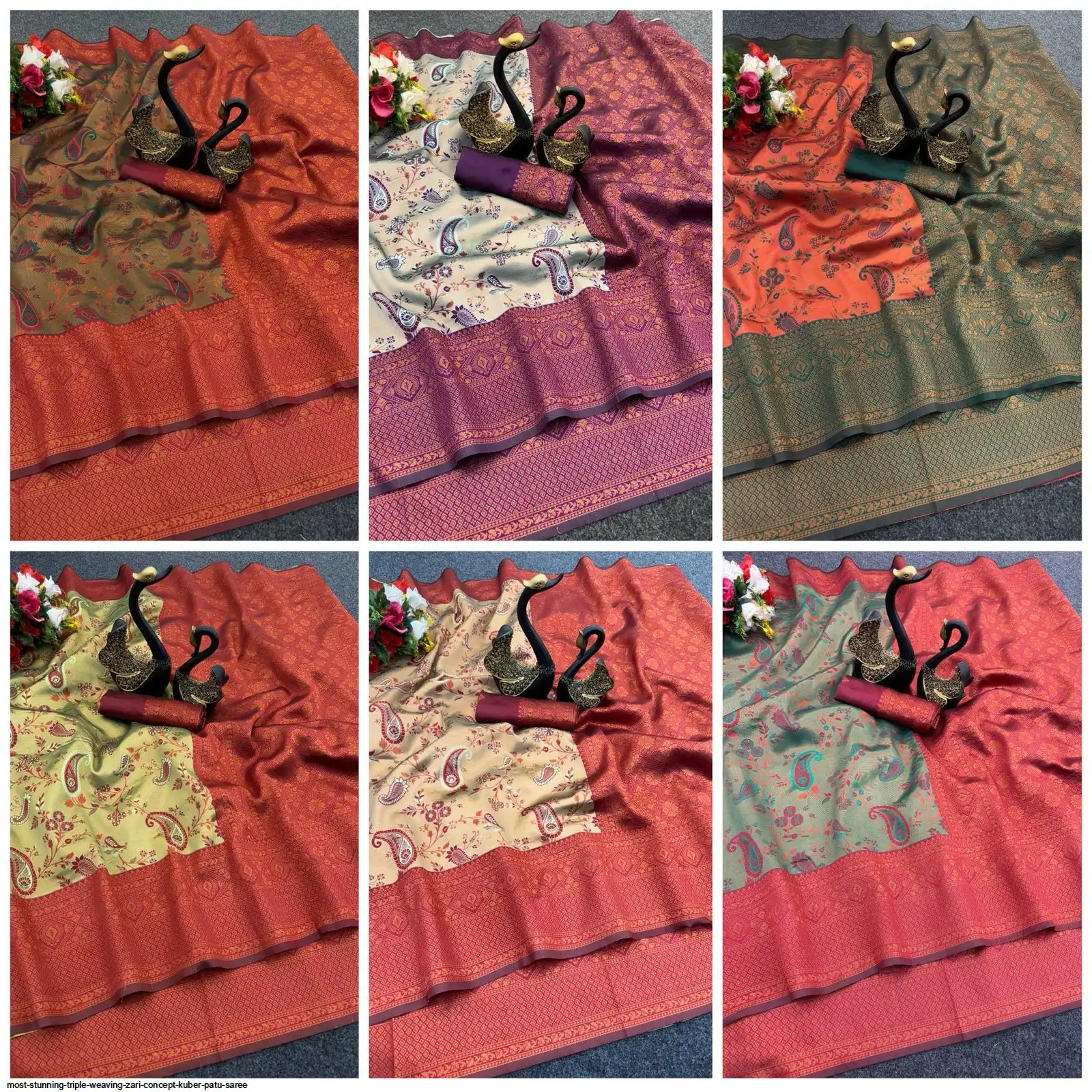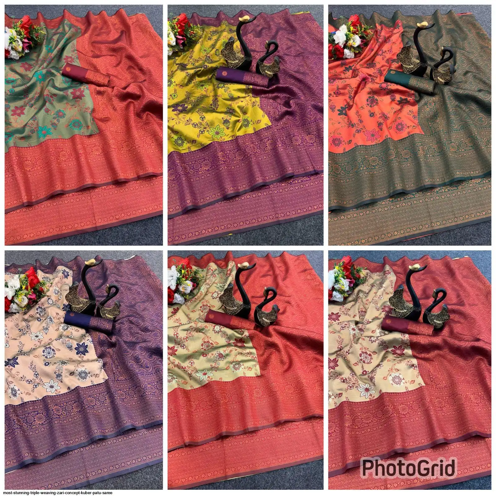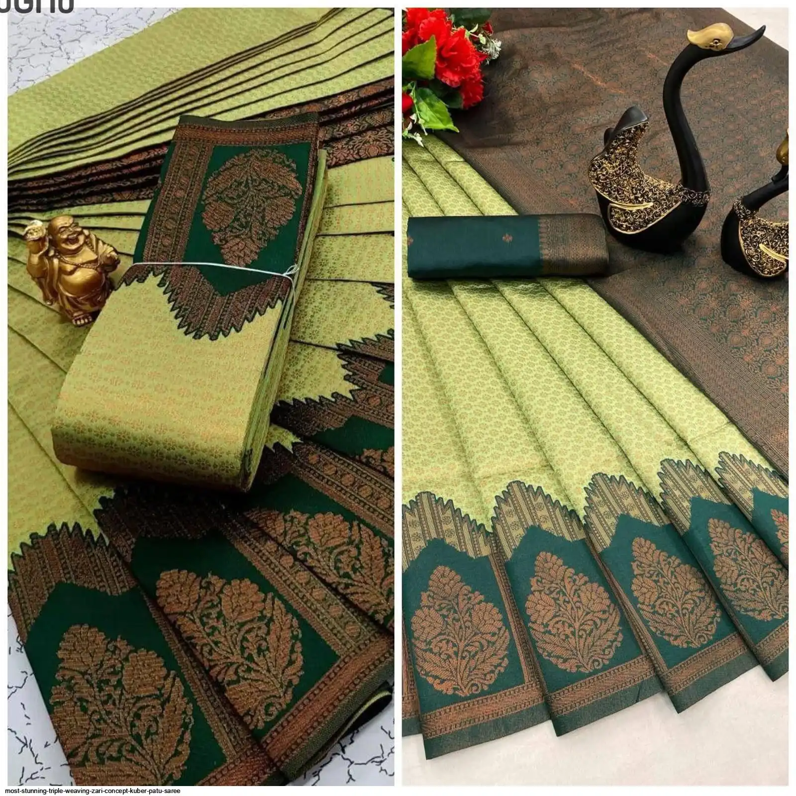Most Stunning Triple Weaving Zari Concept Kuber patu Sarees . This concept Sarees is best for Party and wedding Occasion. This Kuber pattu Kanchi Sarees is made of Pure Copper Zari and Self Design with contrast Colour Meena makes Sarees Adorable