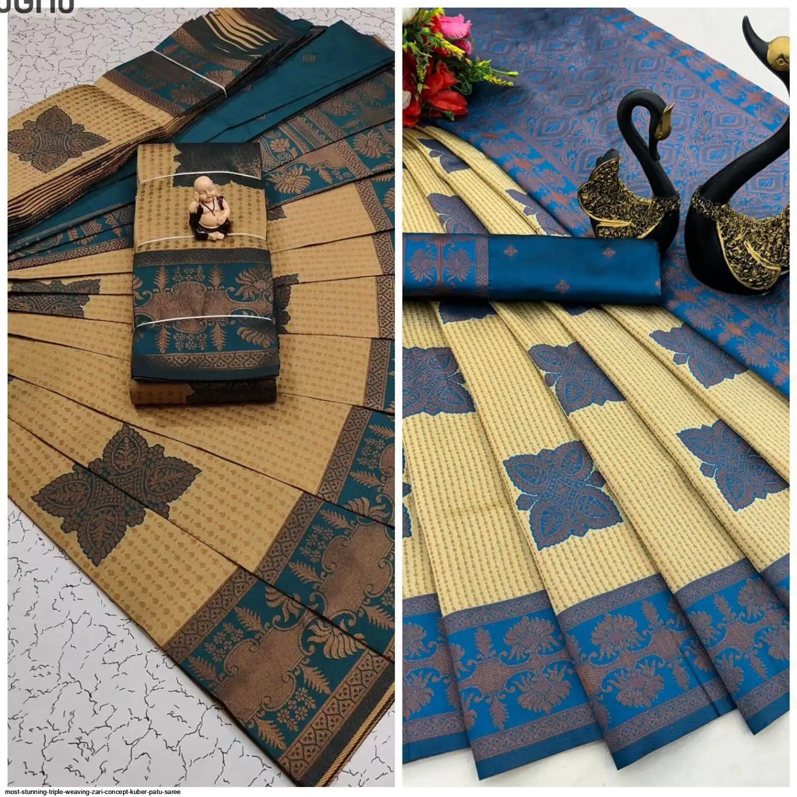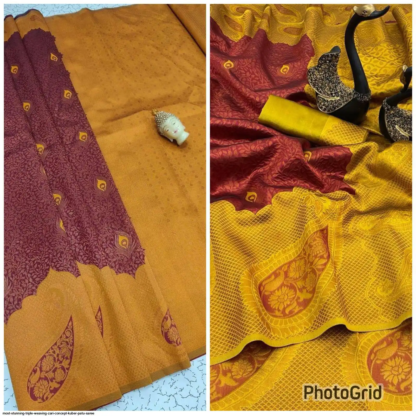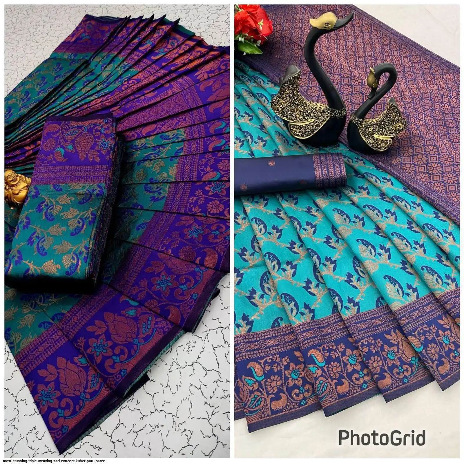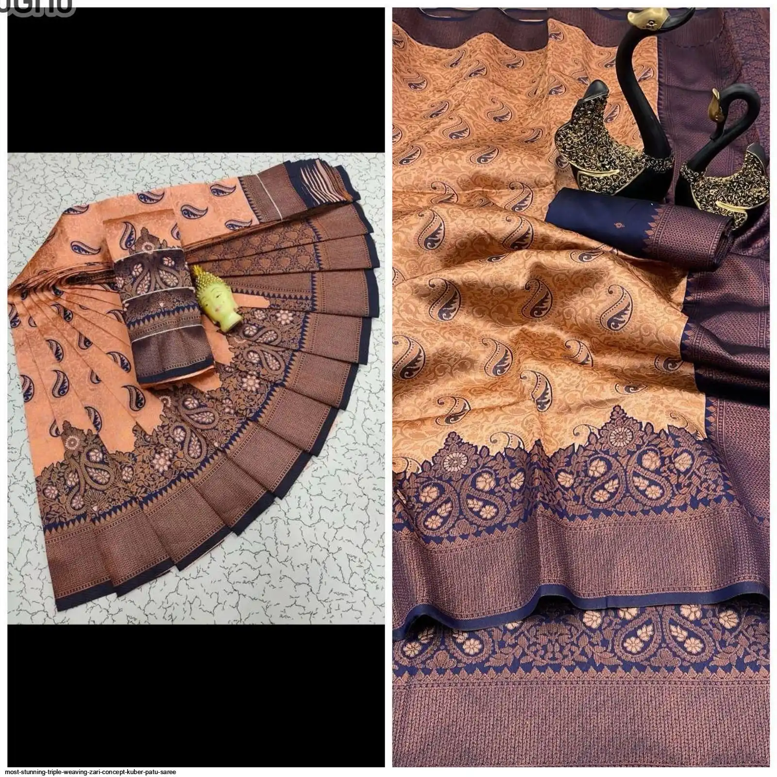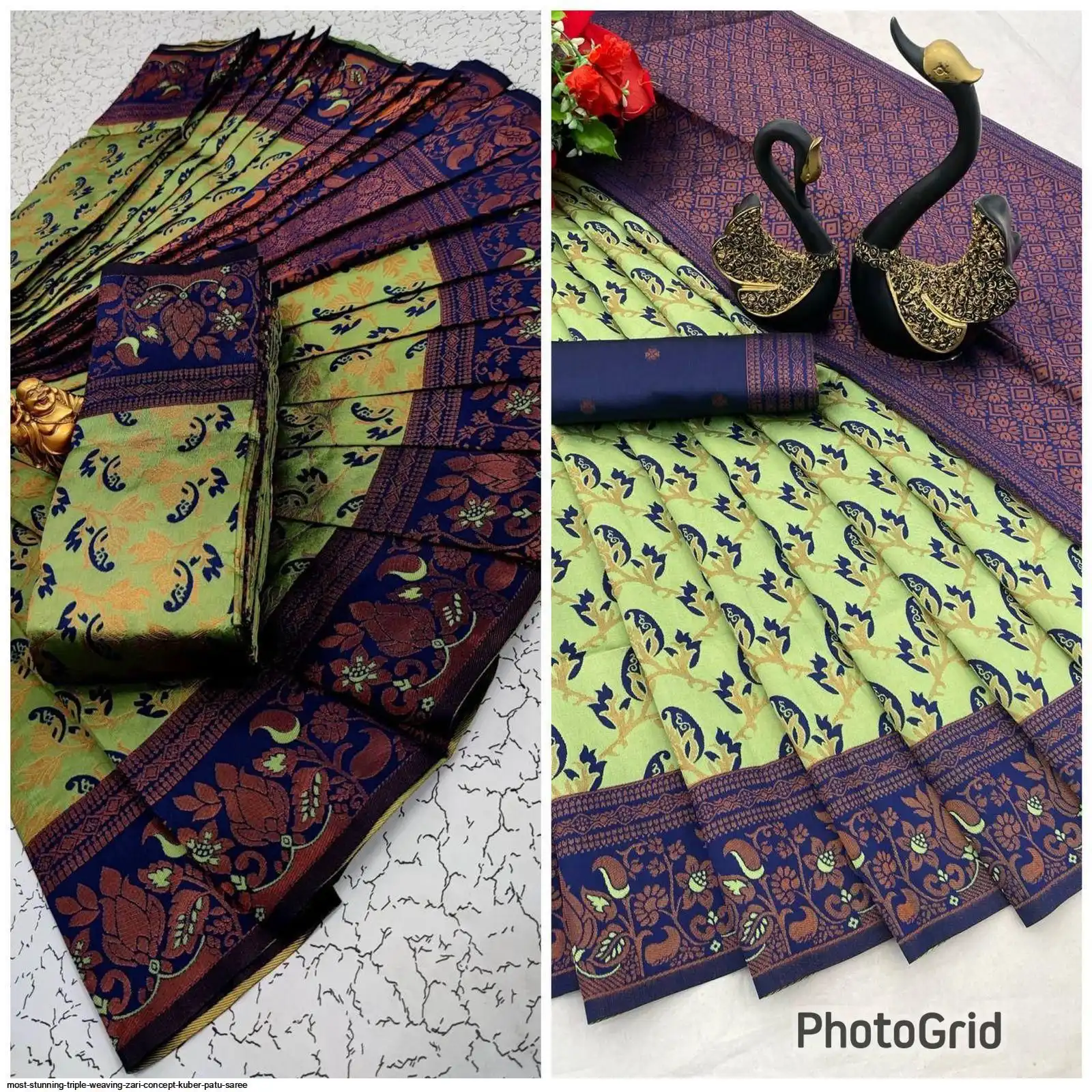 Most Stunning Triple Weaving Zari Concept Kuber patu Sarees . This concept Sarees is best for Party and wedding Occasion. This Kuber pattu Kanchi Sarees is made of Pure Copper Zari and Self Design with contrast Colour Meena makes Sarees Adorable