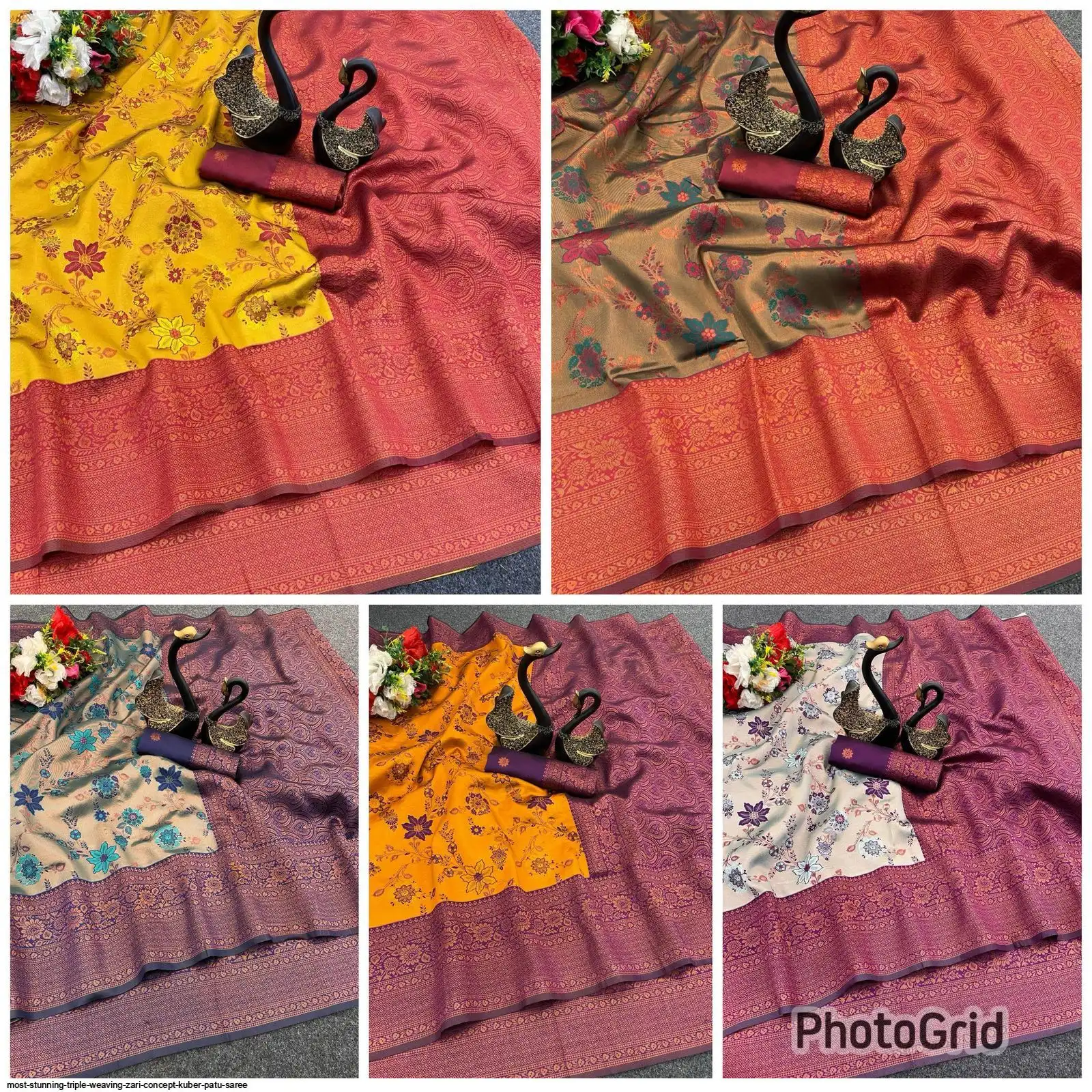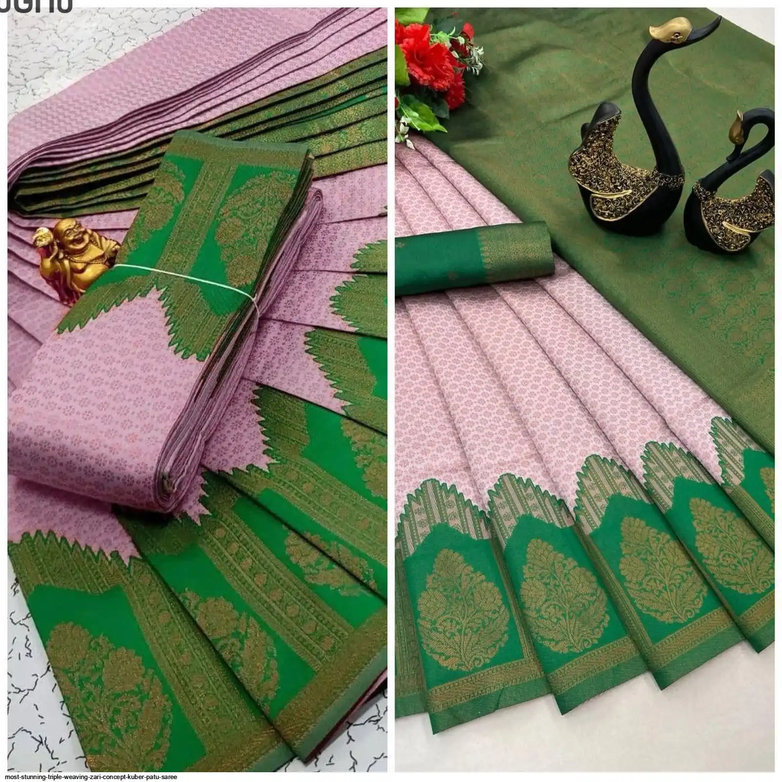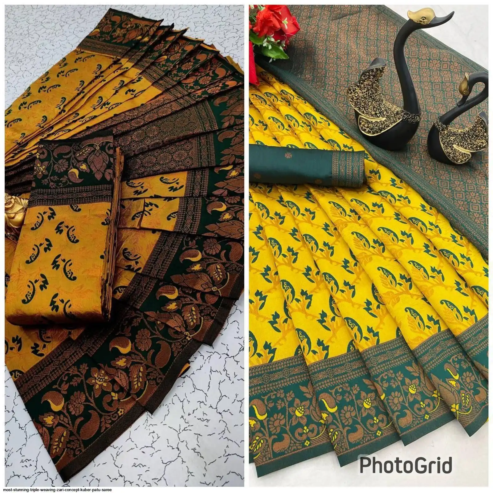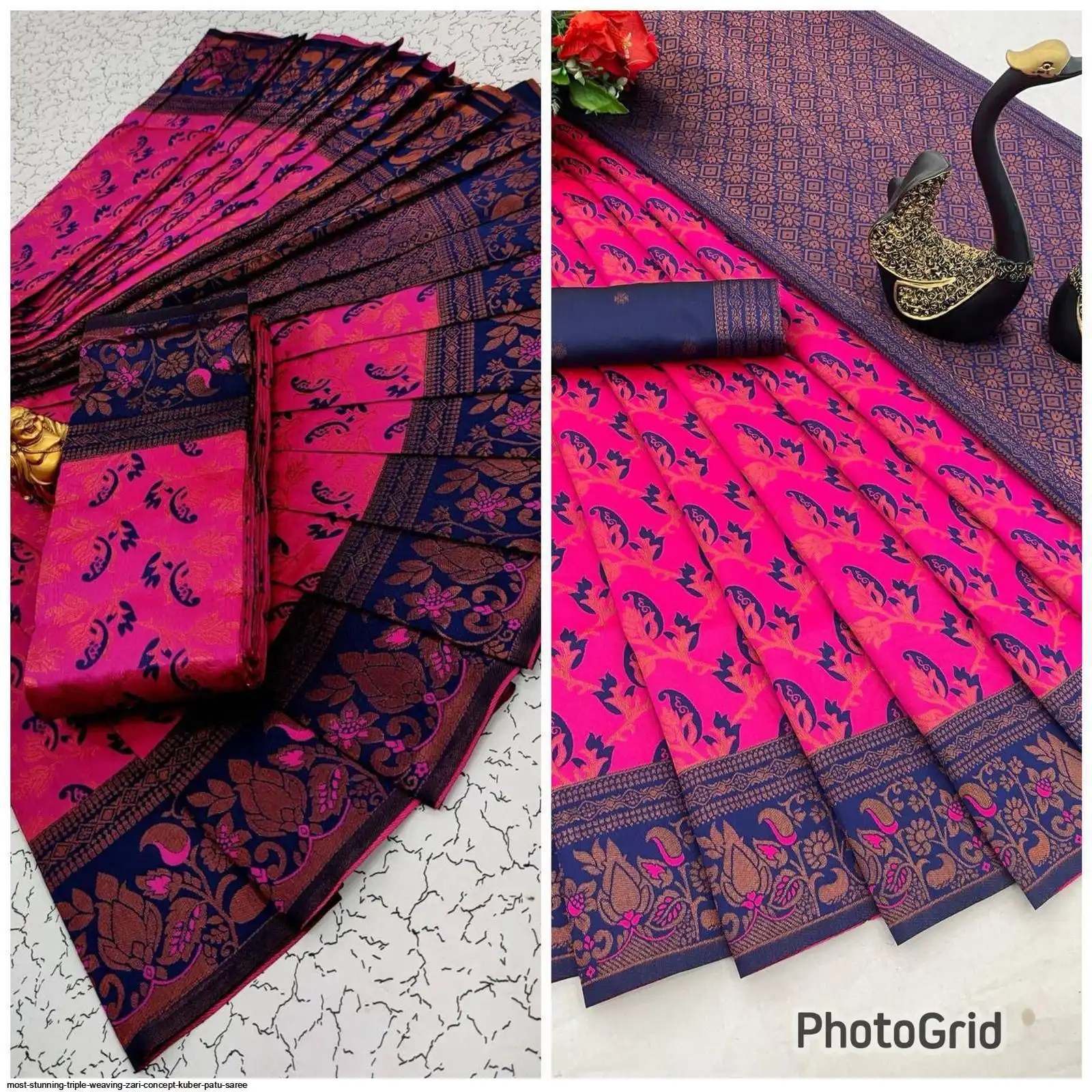 Most Stunning Triple Weaving Zari Concept Kuber patu Sarees . This concept Sarees is best for Party and wedding Occasion. This Kuber pattu Kanchi Sarees is made of Pure Copper Zari and Self Design with contrast Colour Meena makes Sarees Adorable