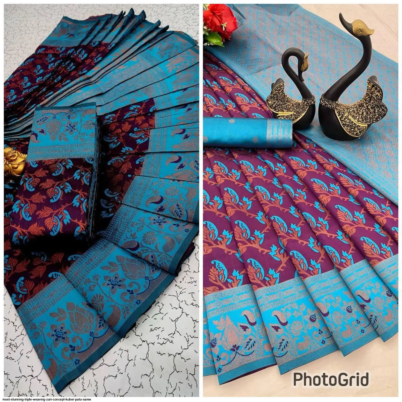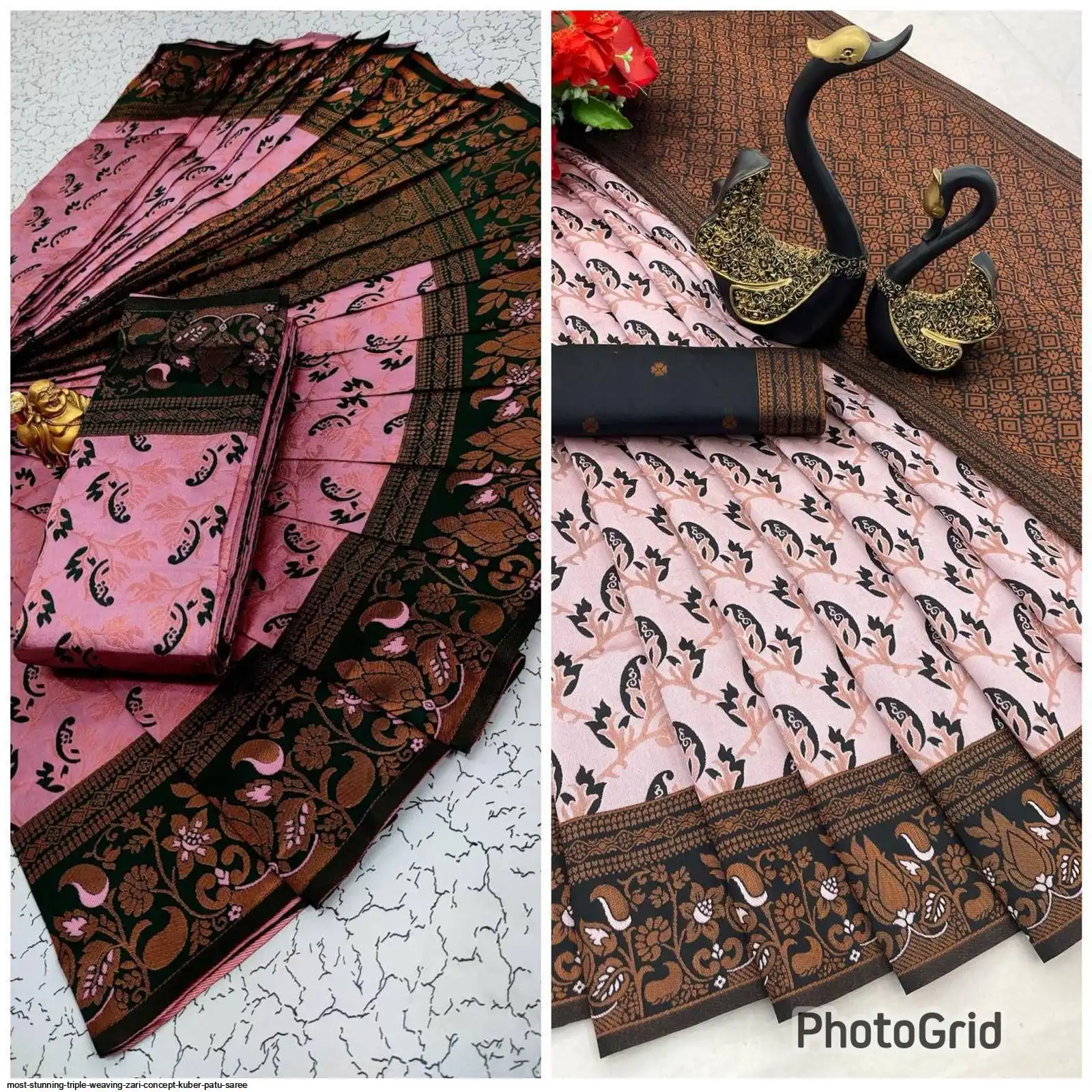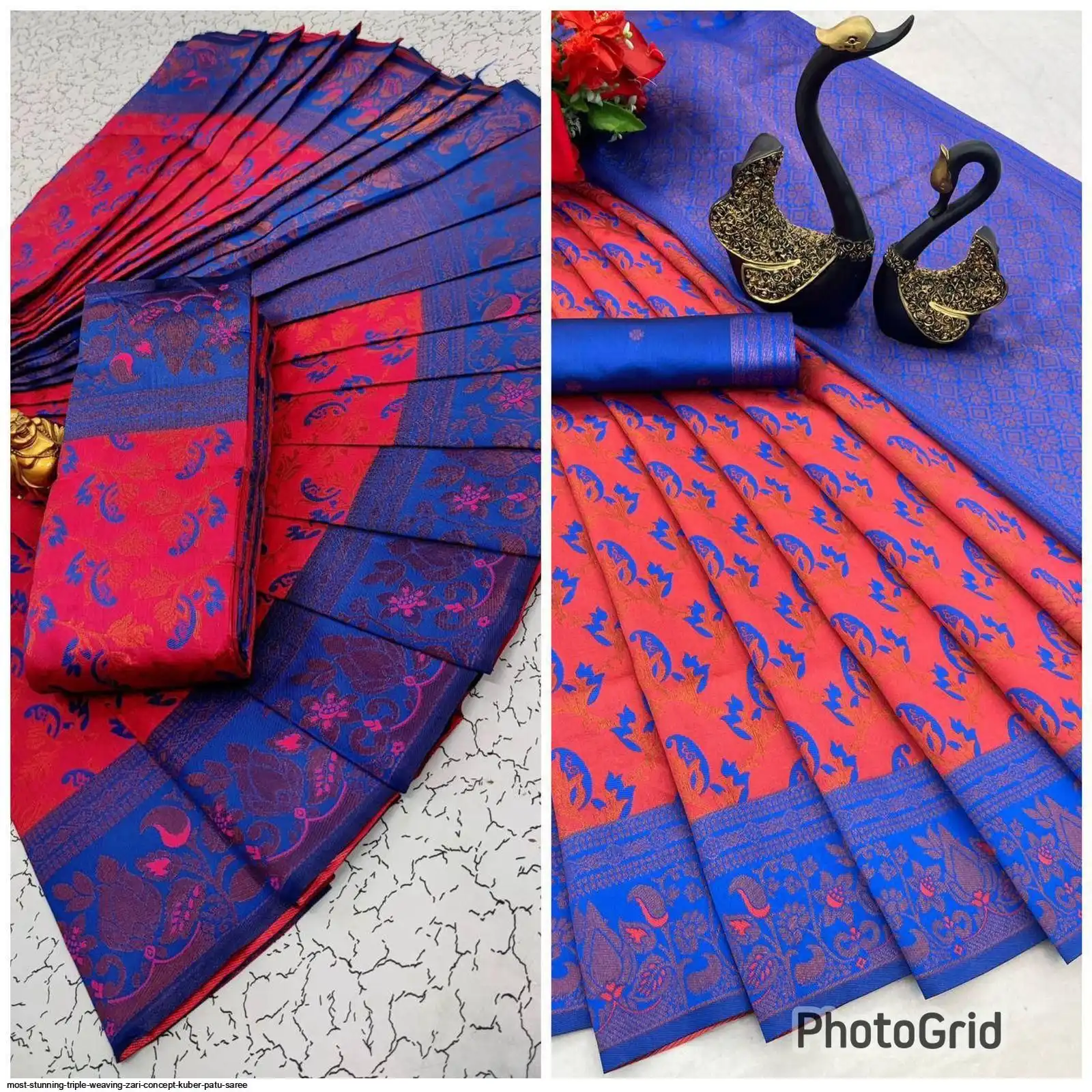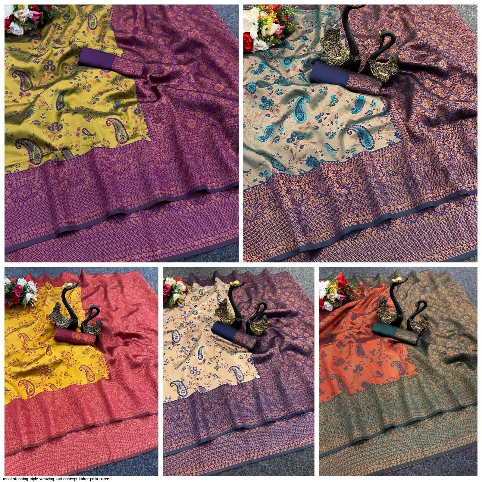 Most Stunning Triple Weaving Zari Concept Kuber patu Sarees . This concept Sarees is best for Party and wedding Occasion. This Kuber pattu Kanchi Sarees is made of Pure Copper Zari and Self Design with contrast Colour Meena makes Sarees Adorable