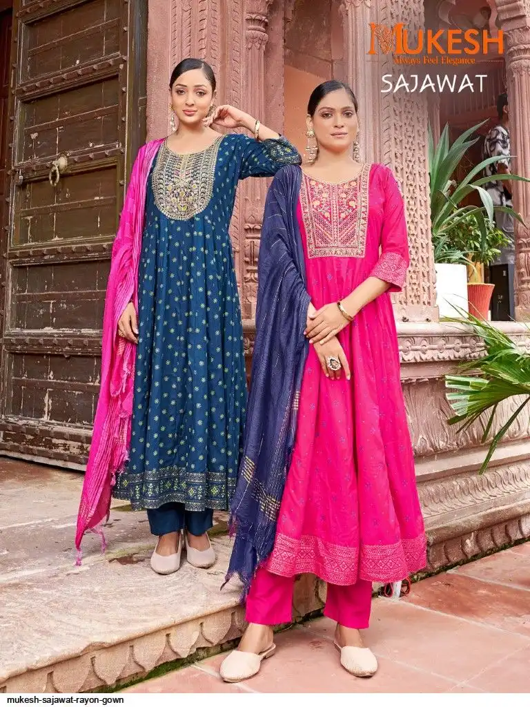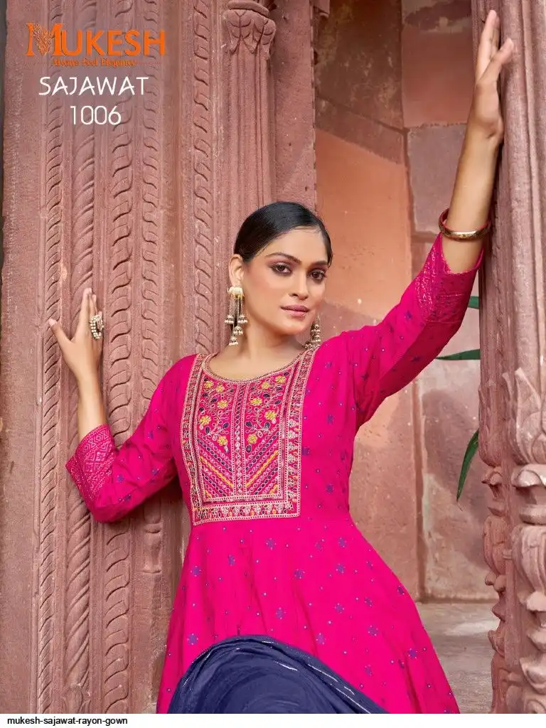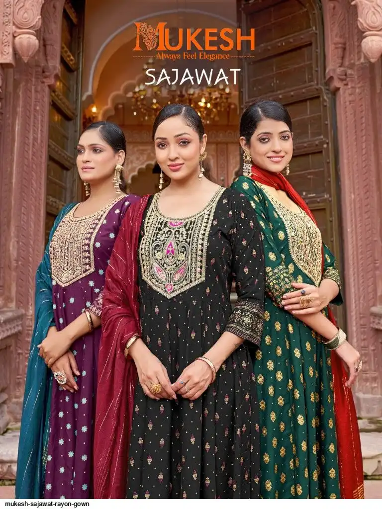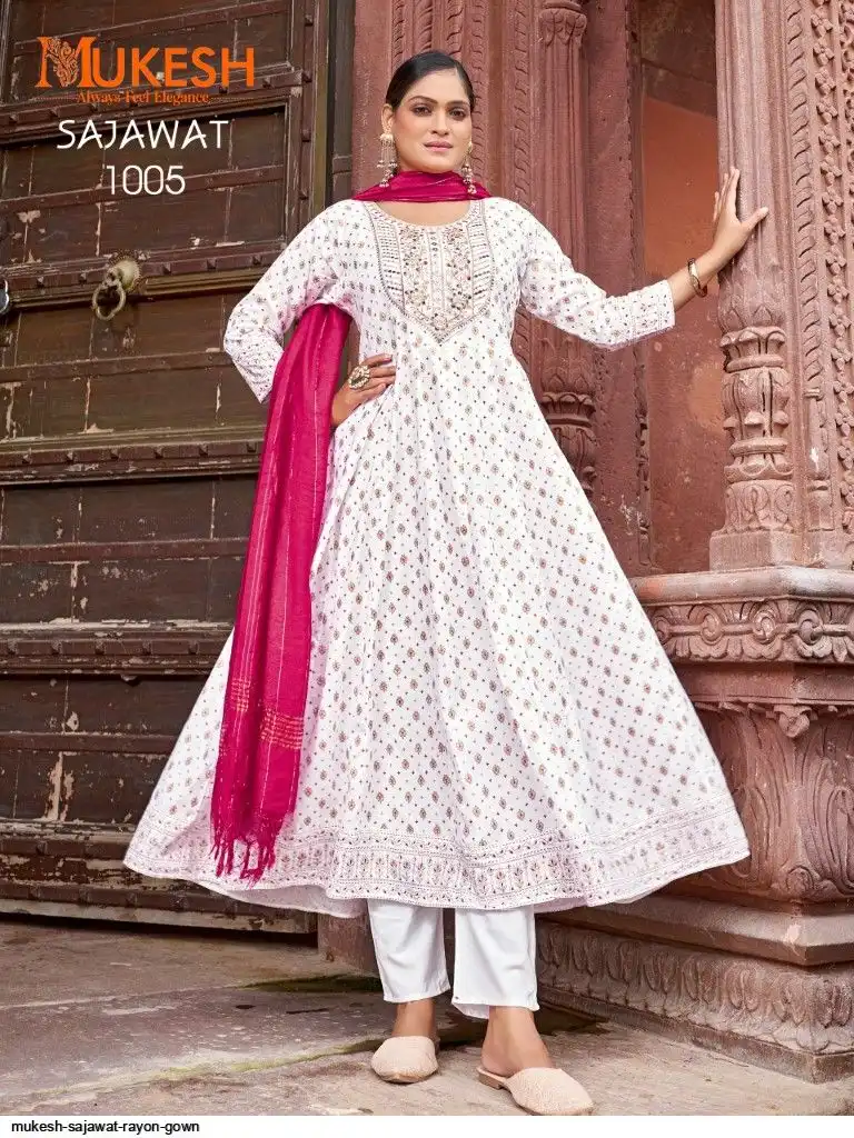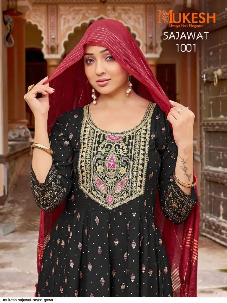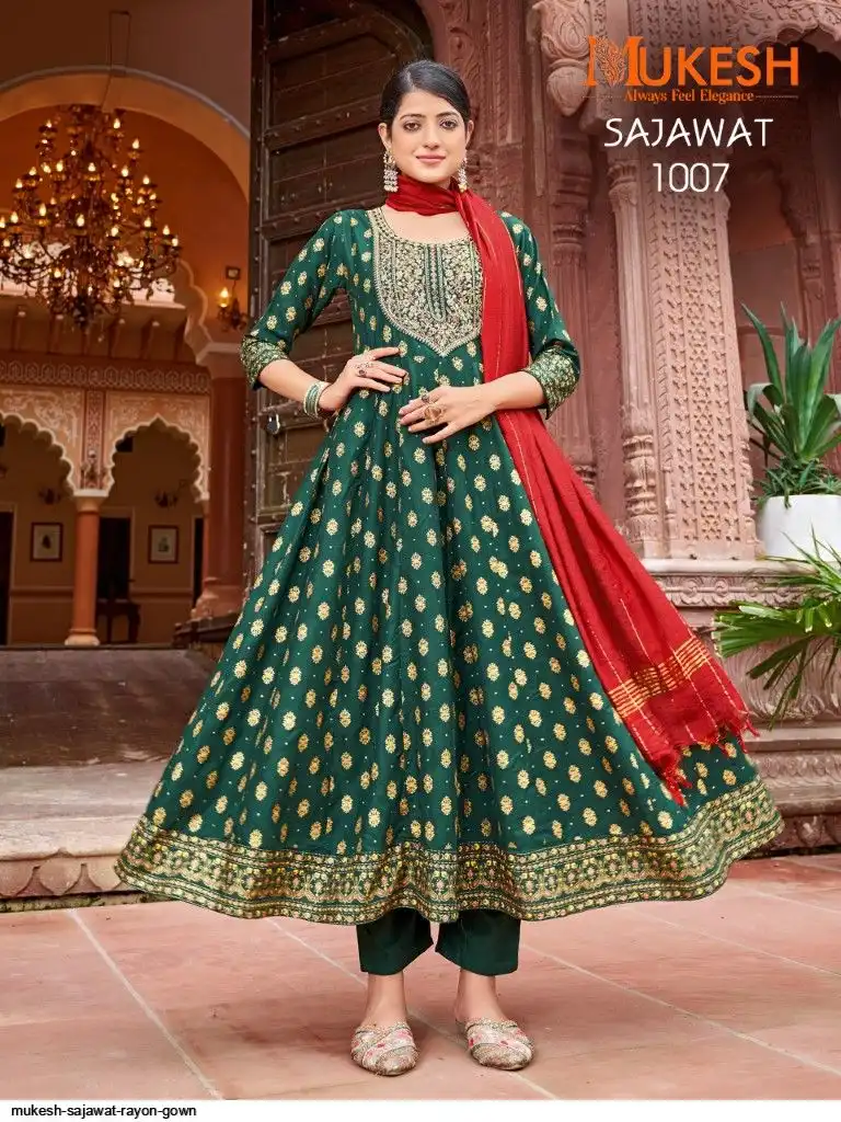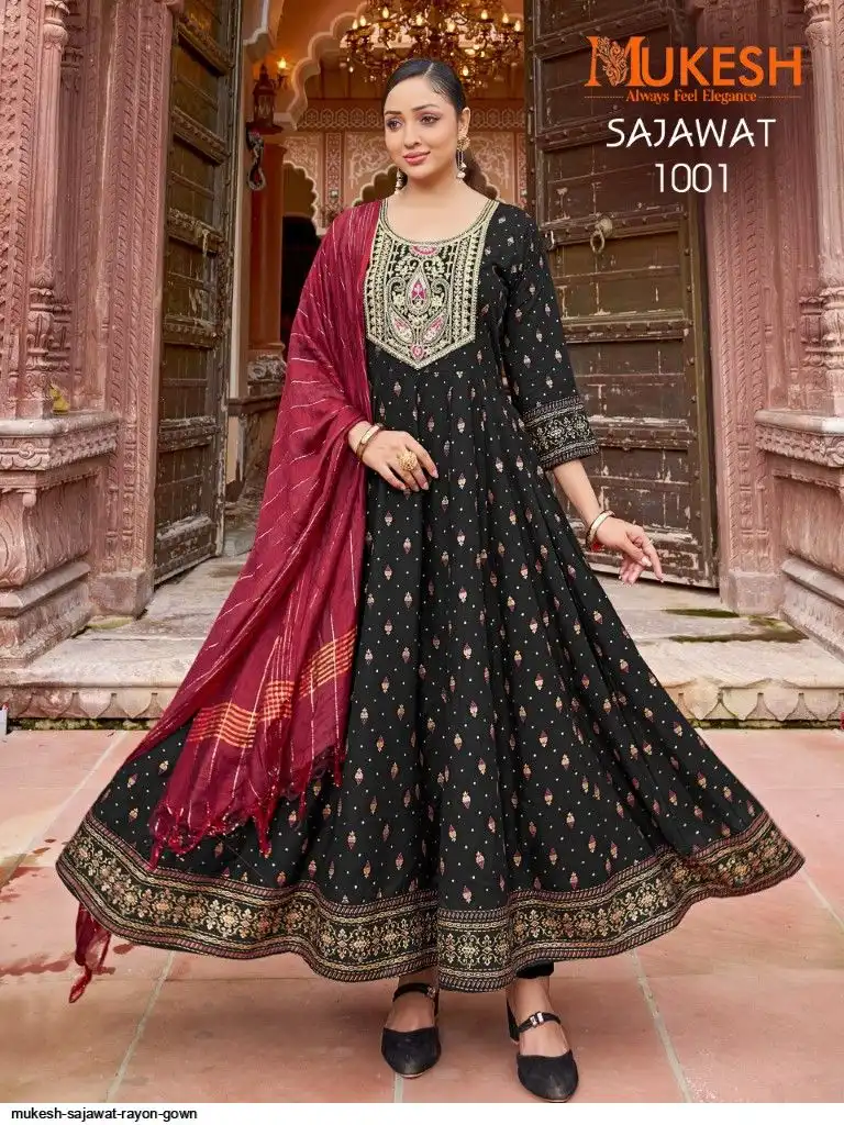 GOWN :- 14KG RAYON WITH HEAVY SEQUENCE EMBROIDERY QUARDING WORK WITH COLOR FOIL PRINT
