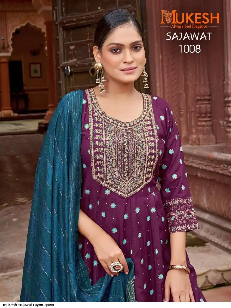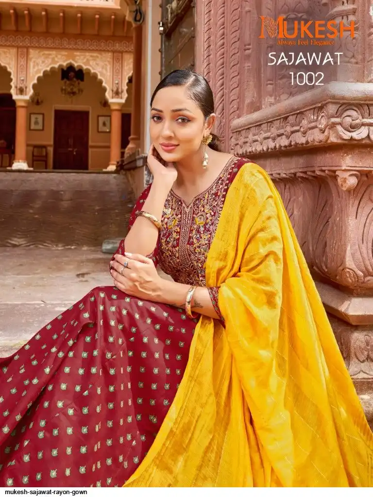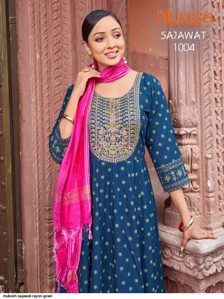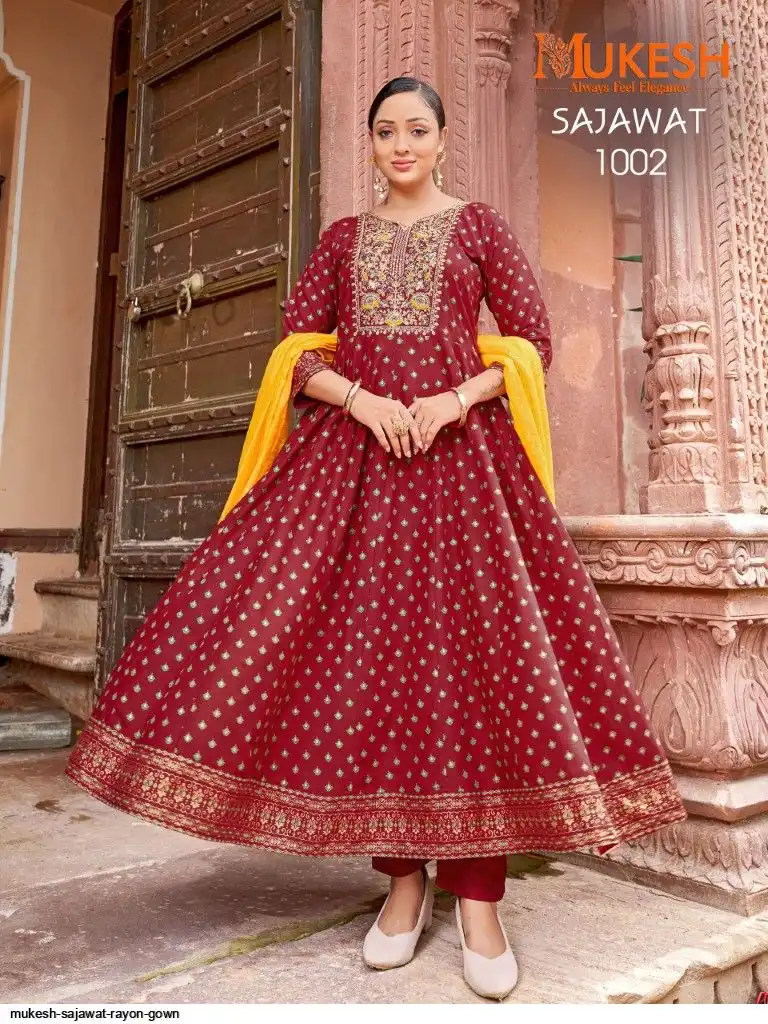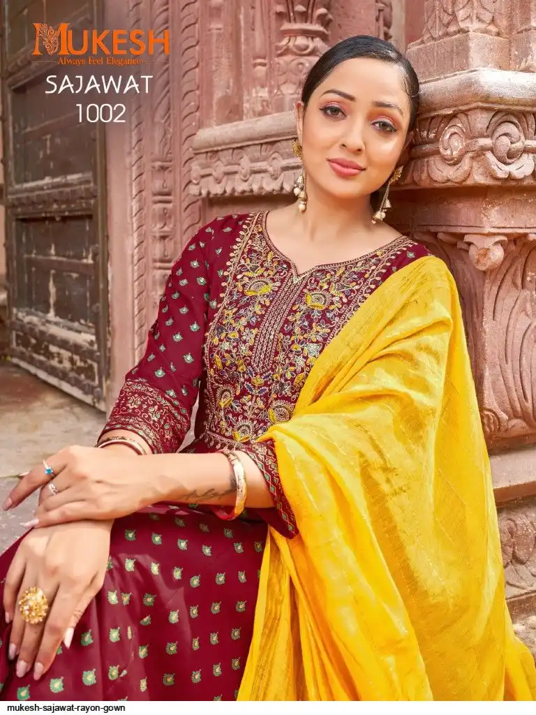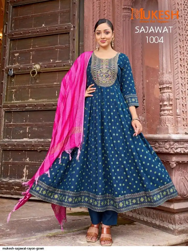 GOWN :- 14KG RAYON WITH HEAVY SEQUENCE EMBROIDERY QUARDING WORK WITH COLOR FOIL PRINT
