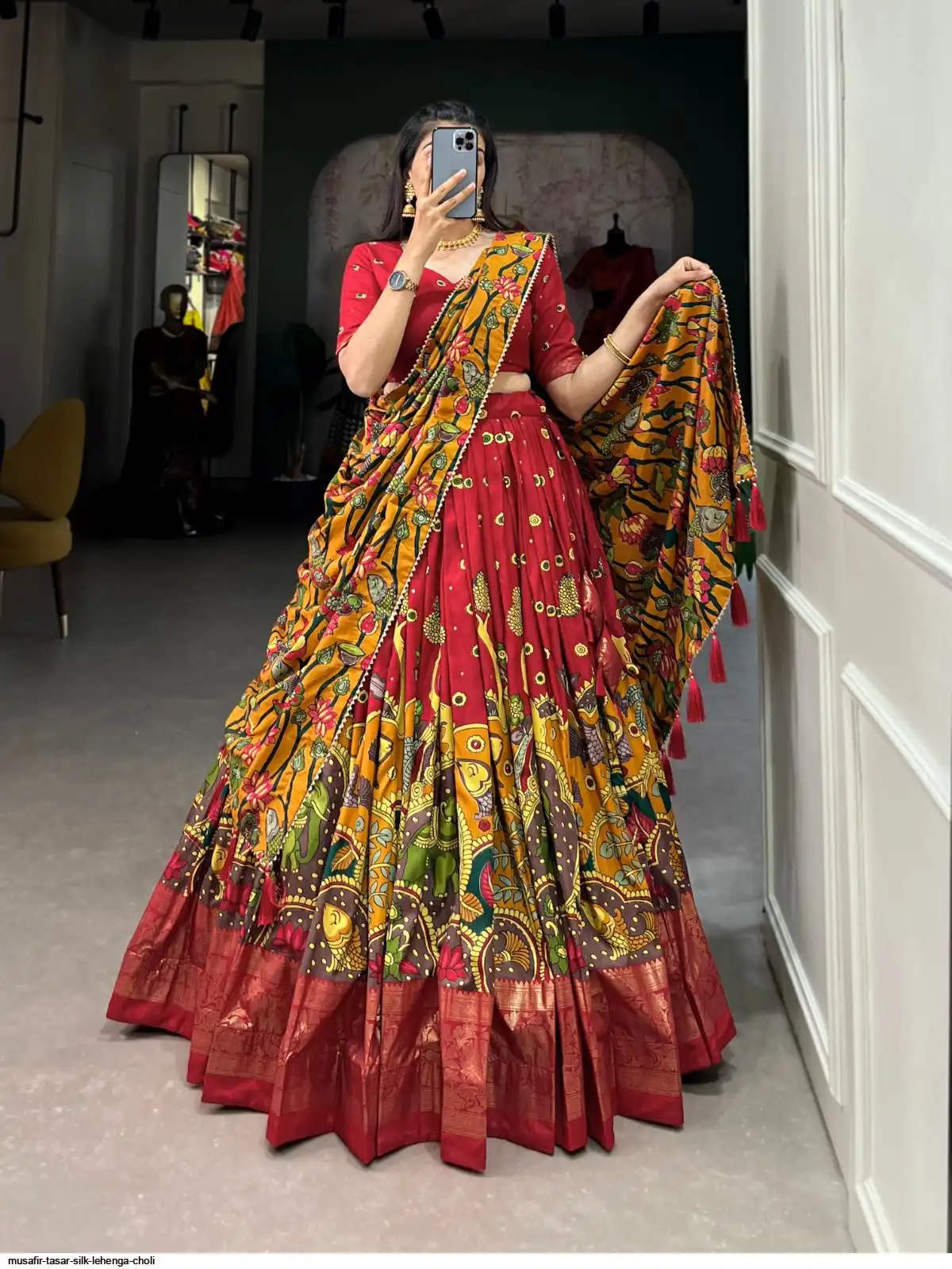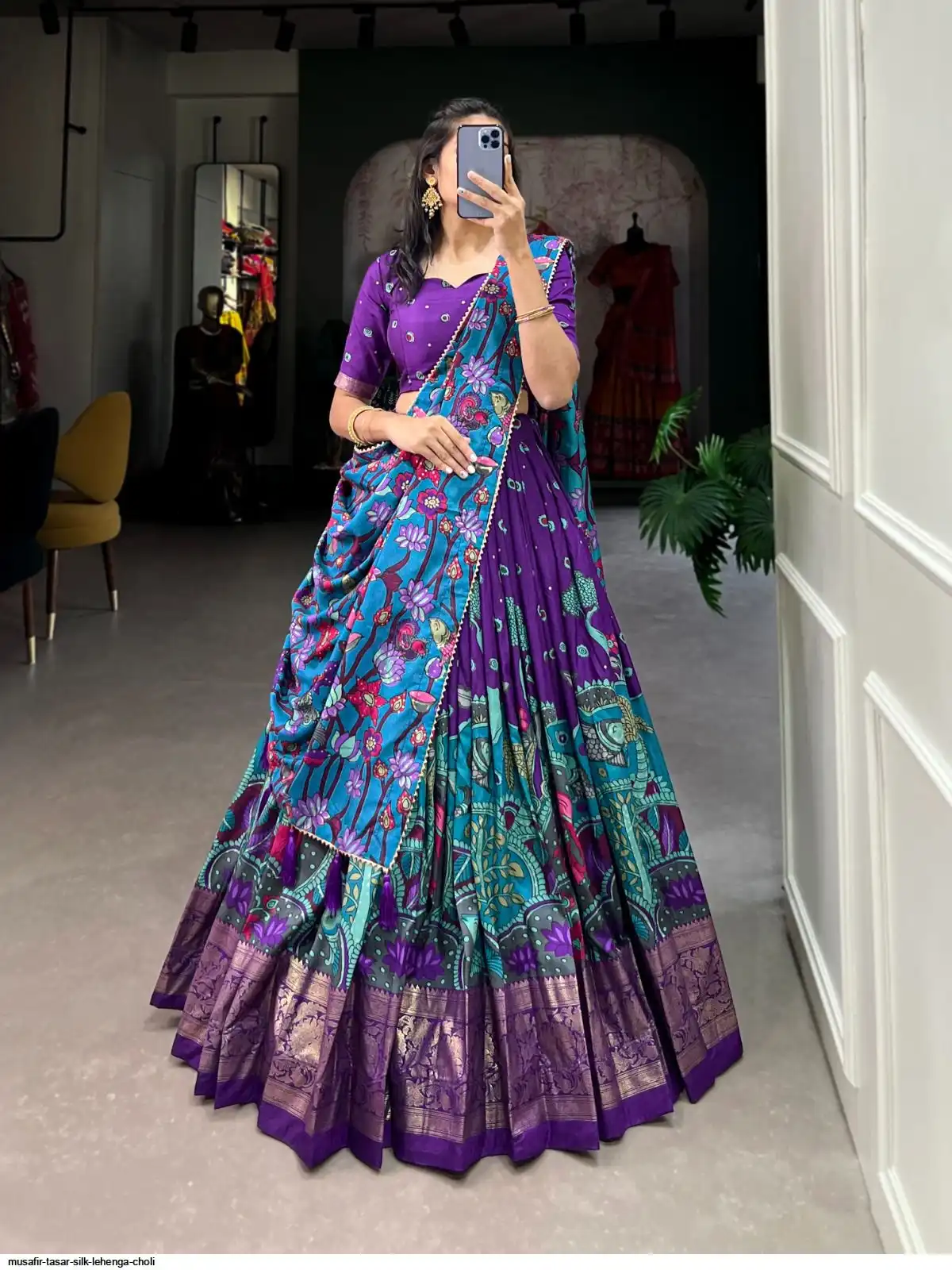 Infuse Your Wardrobe with Southern Grace—Tasar Silk Kalamkari Print Lehenga Choli Featuring a Sophisticated Foil Work Border đŸª·