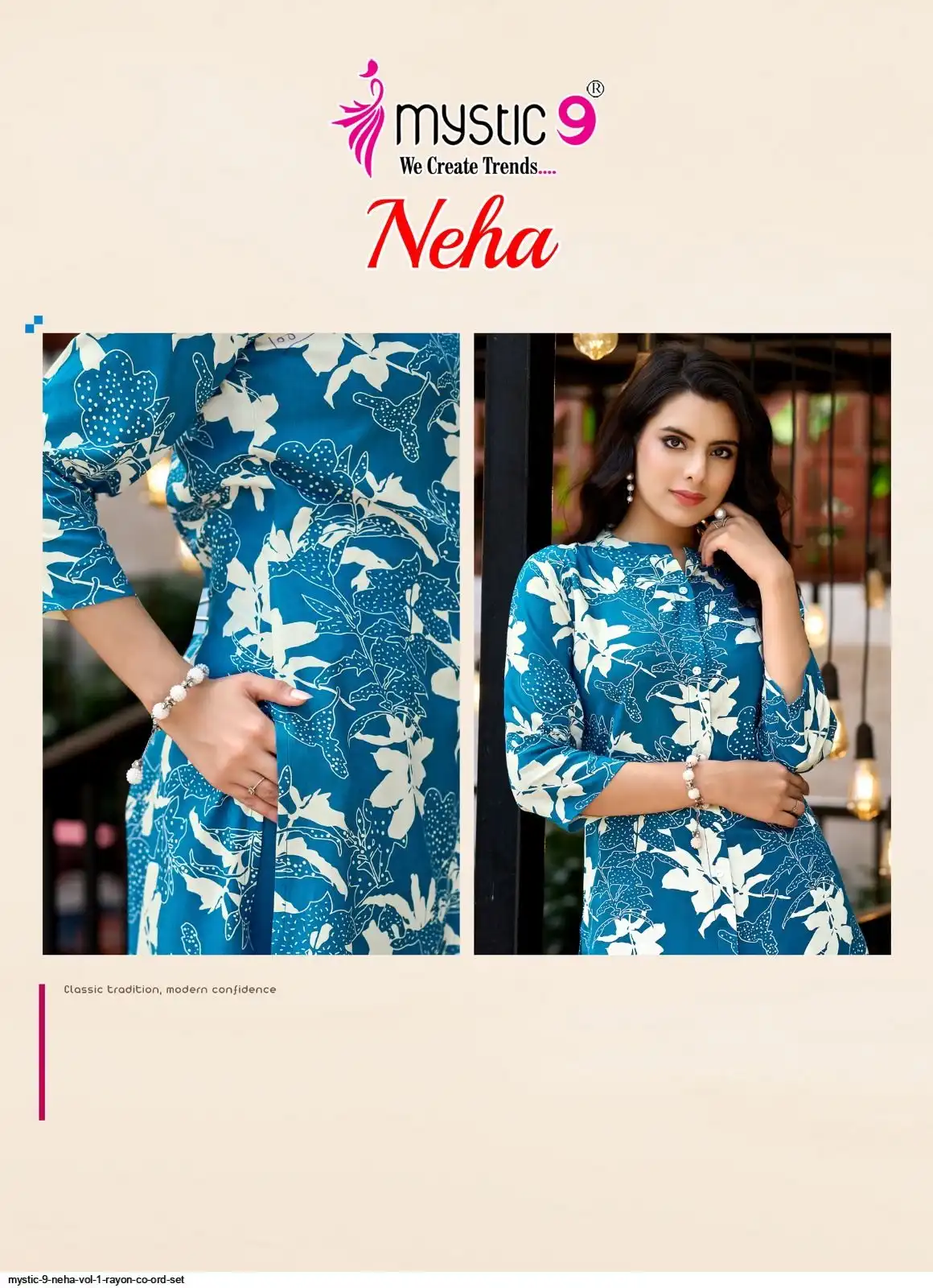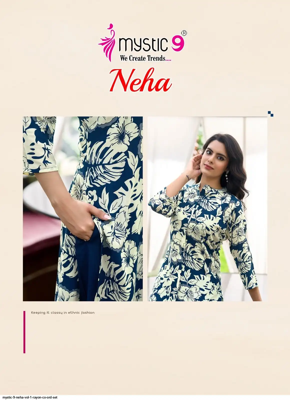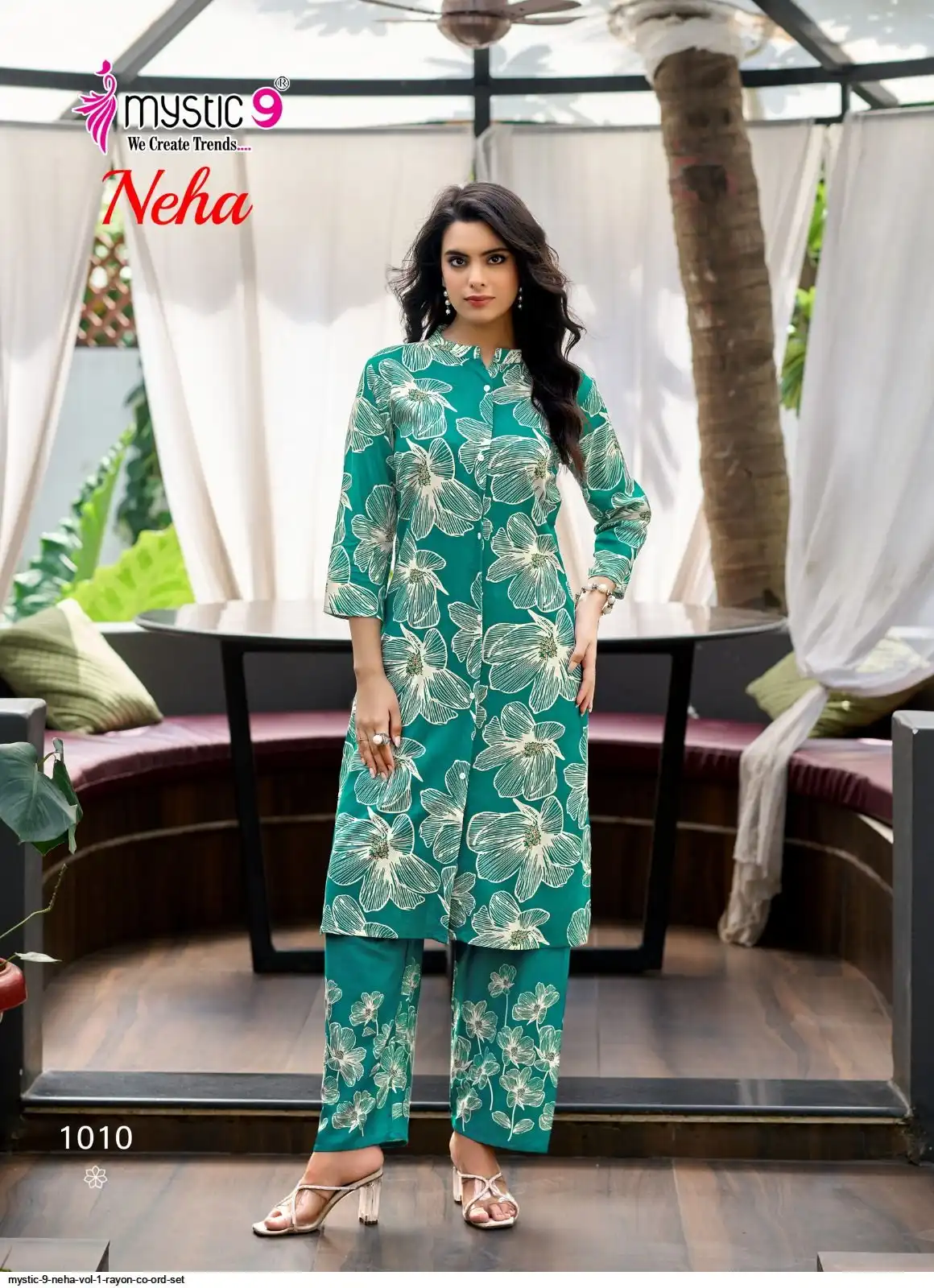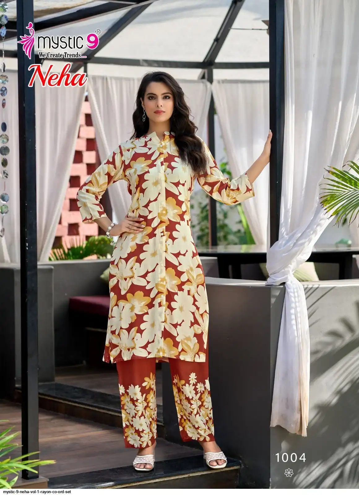 Top: Premium Rayon Print with Mandarin Collar, Sleeves Lock, and Buttons on front.