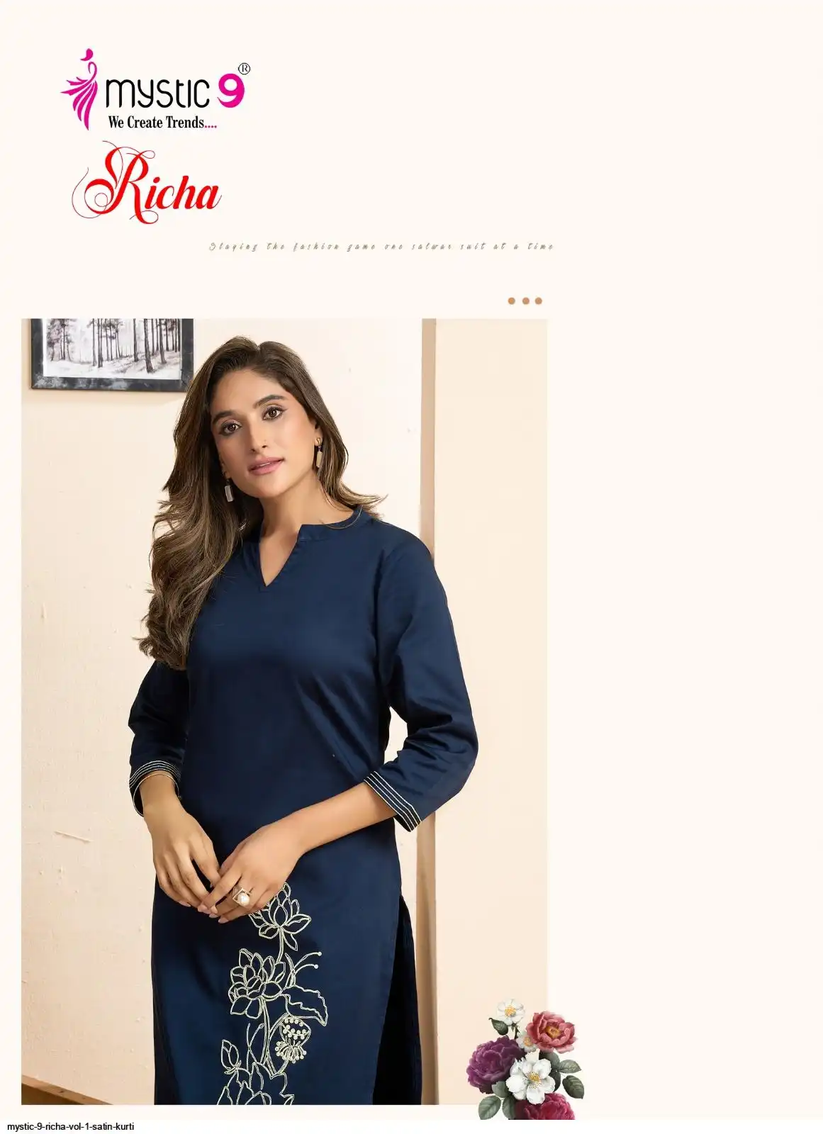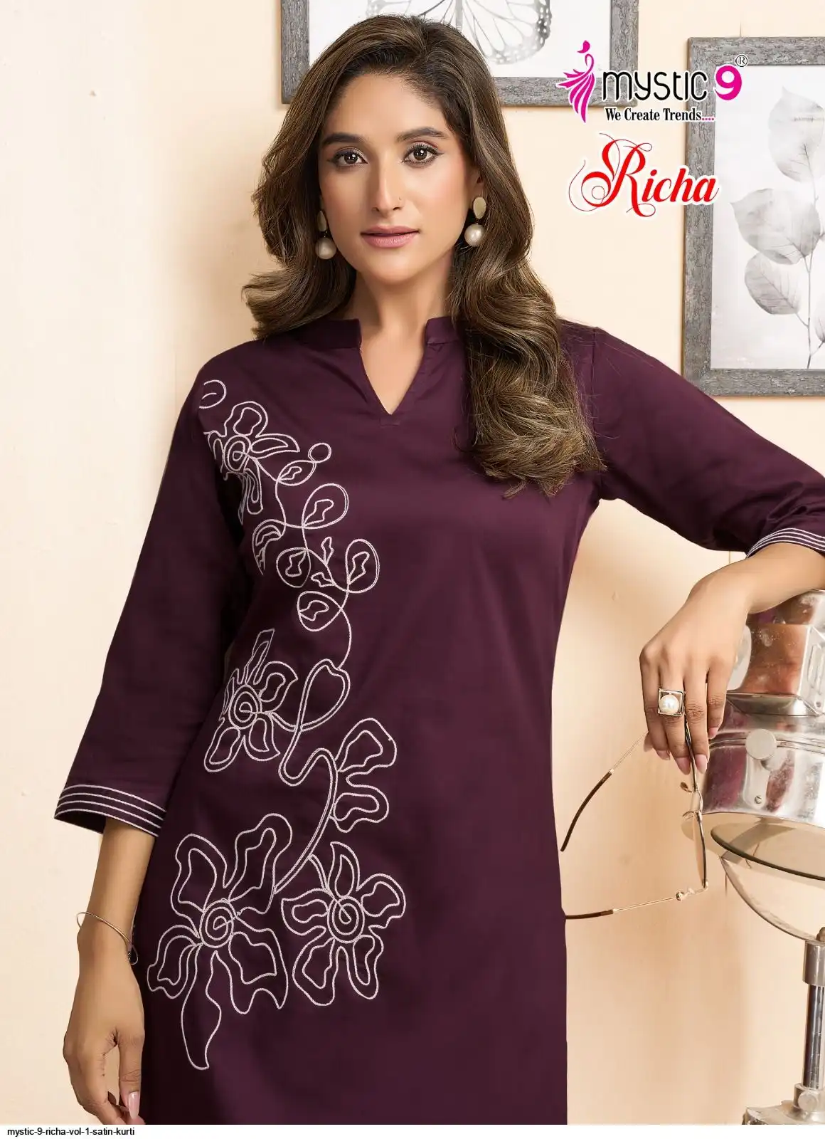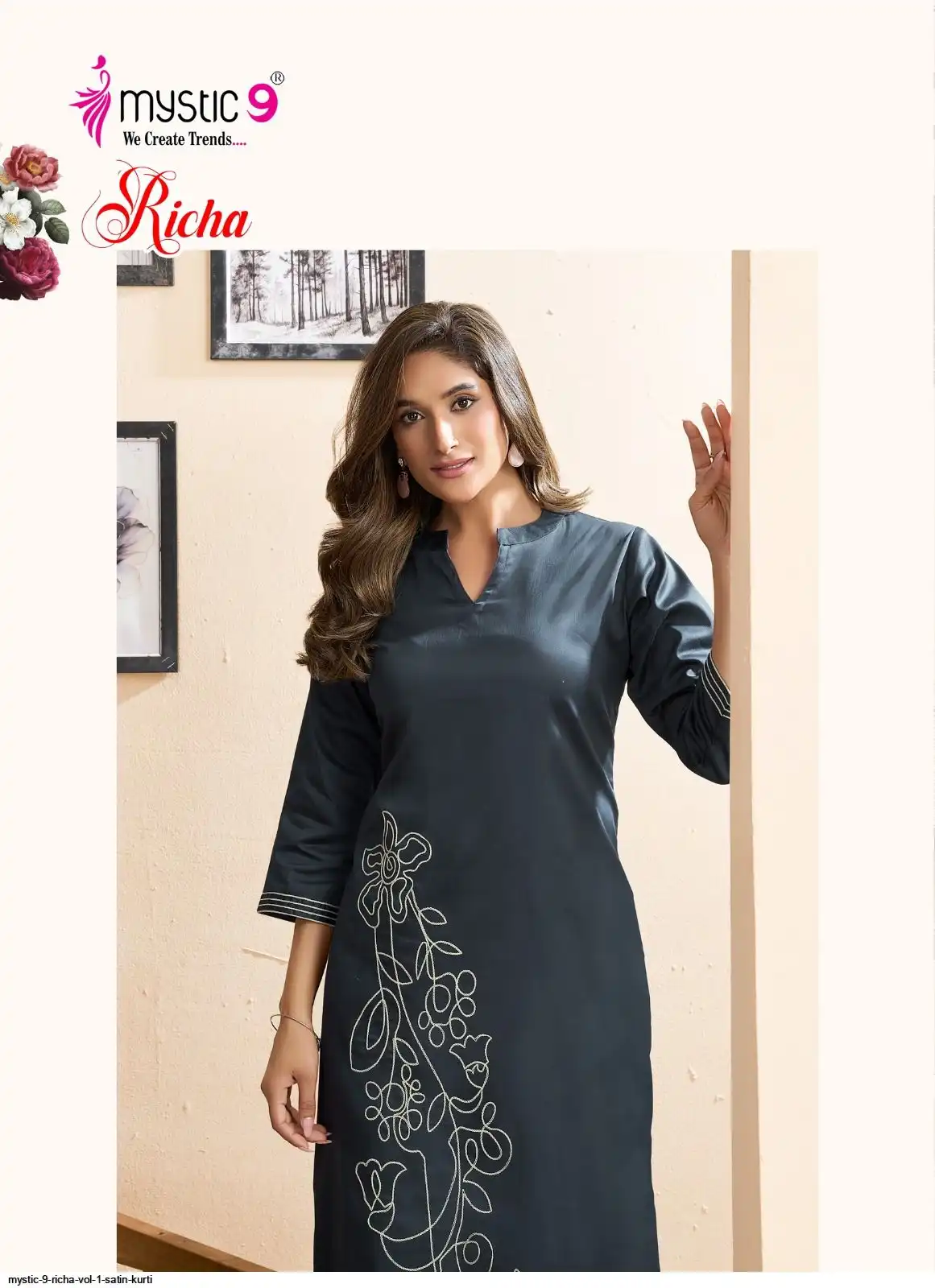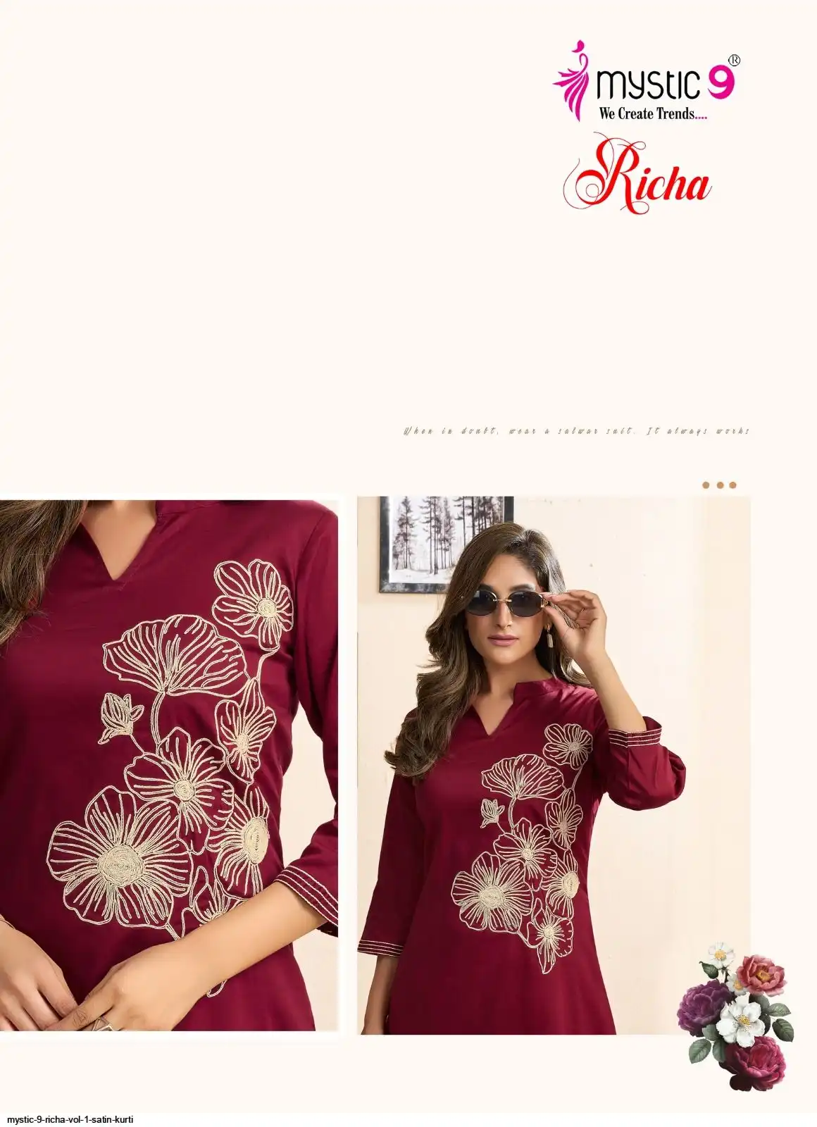 Top: Premium Satin Lycra with Mandarin Collar, Sleeves Lock, and Elegant THREAD WORK Embroidery on front and sleeves.