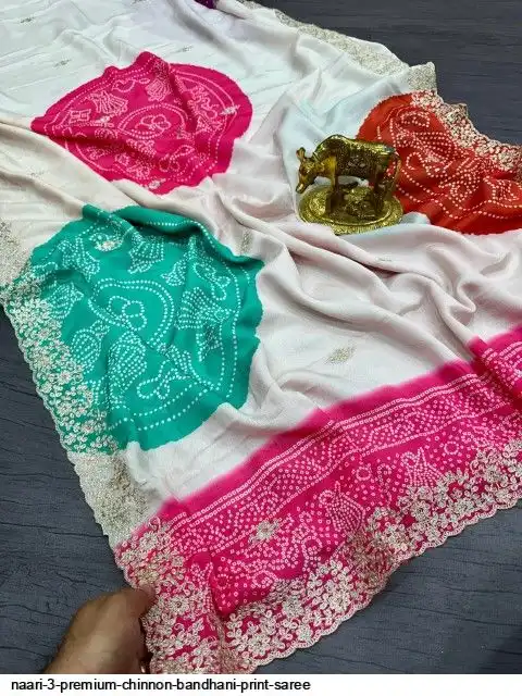 Saree :~ Pure n Premium chinon high Quality with Bandhani Print Saree multiple colors C~Pallu Pita Work & Butti Border In Saree