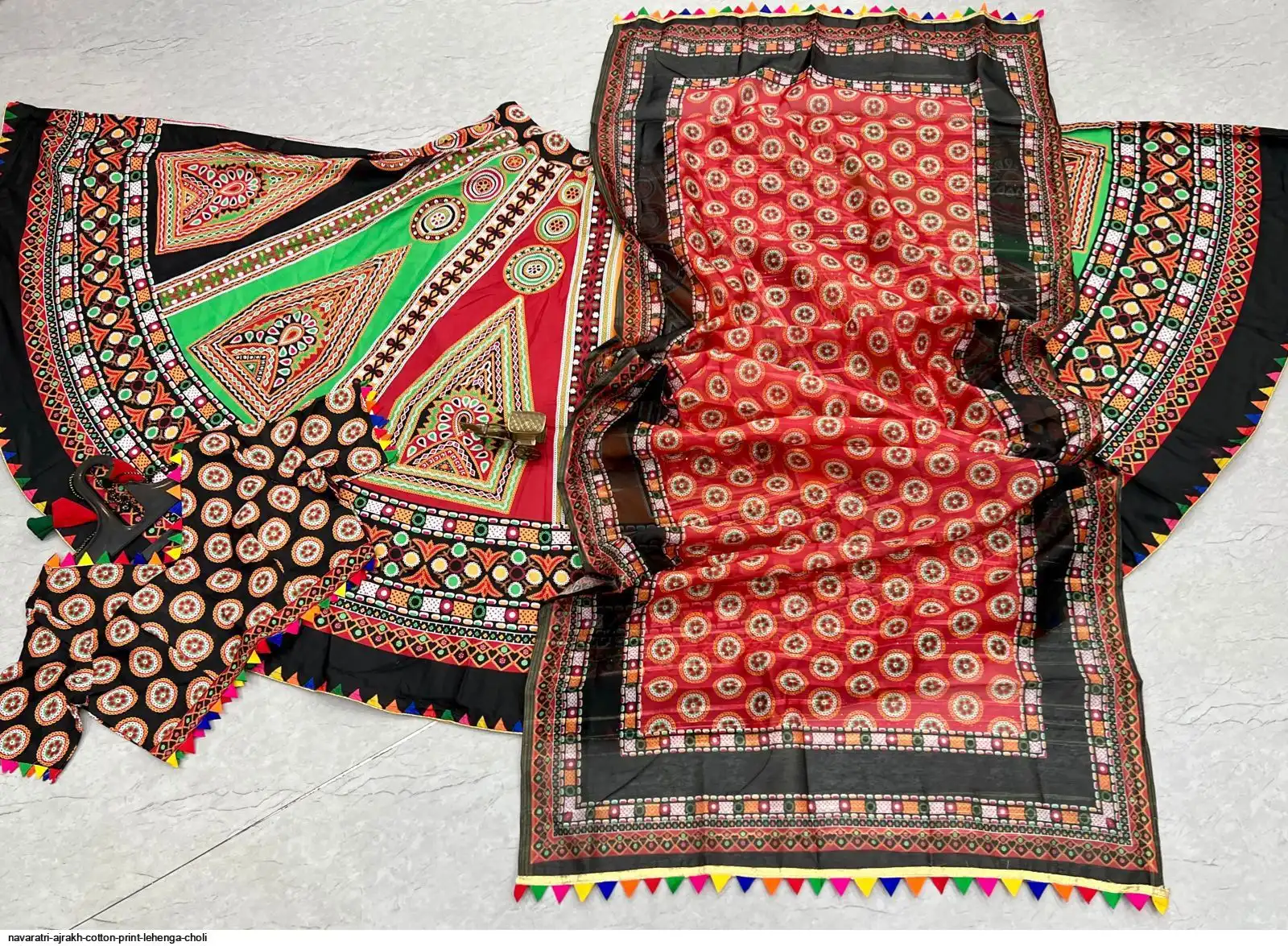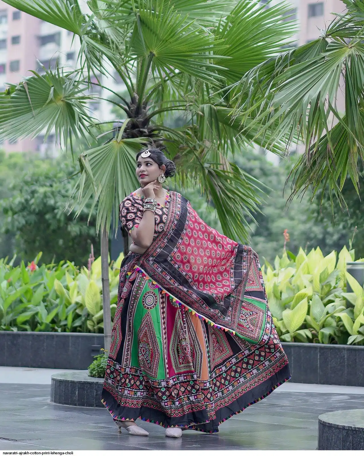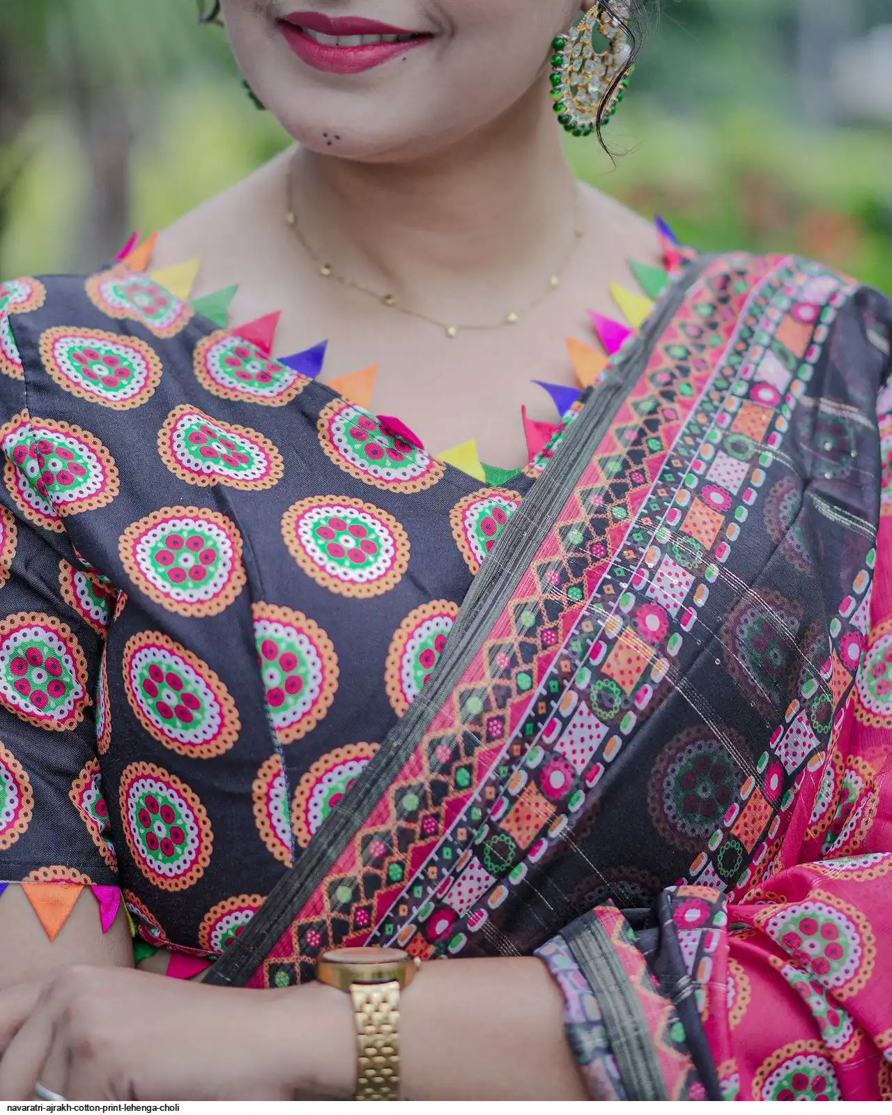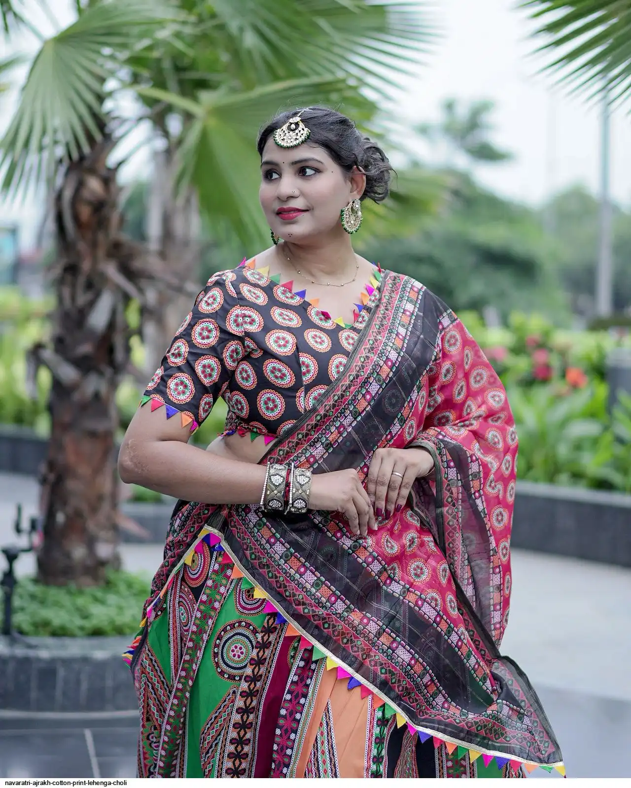 Presenting a perfectly blended endless array of patterns, designs, color, print work and lucknowi print dupatta, that represents a vibrant gujarati culture & true essence of our navaratri choli.