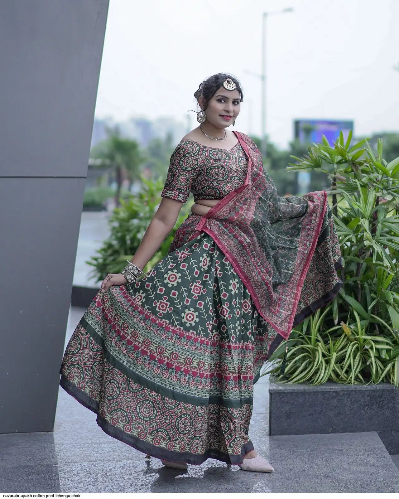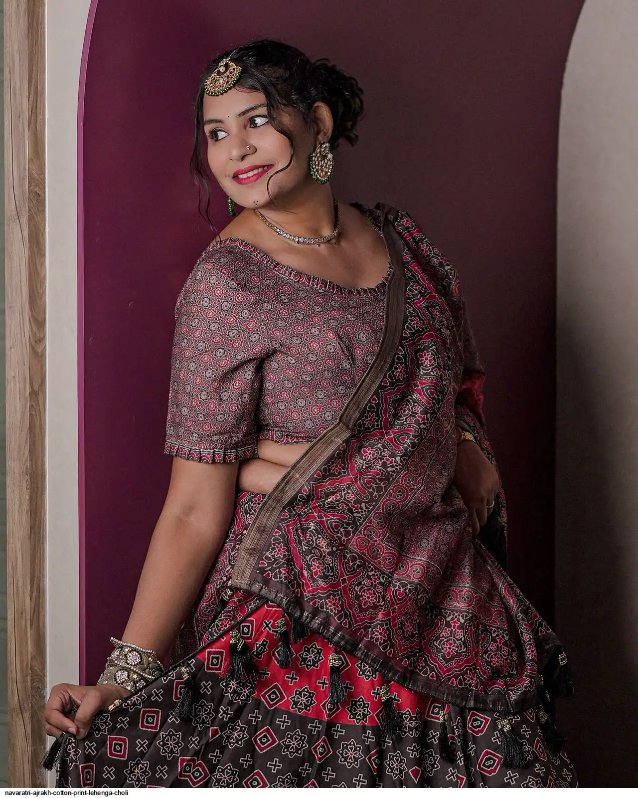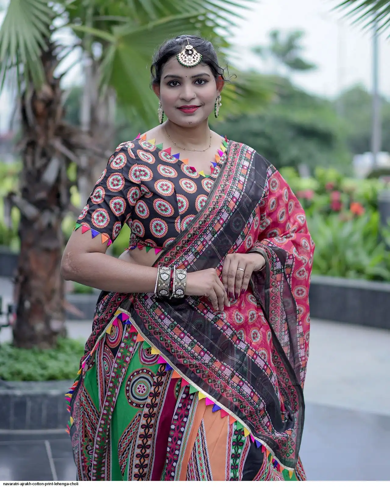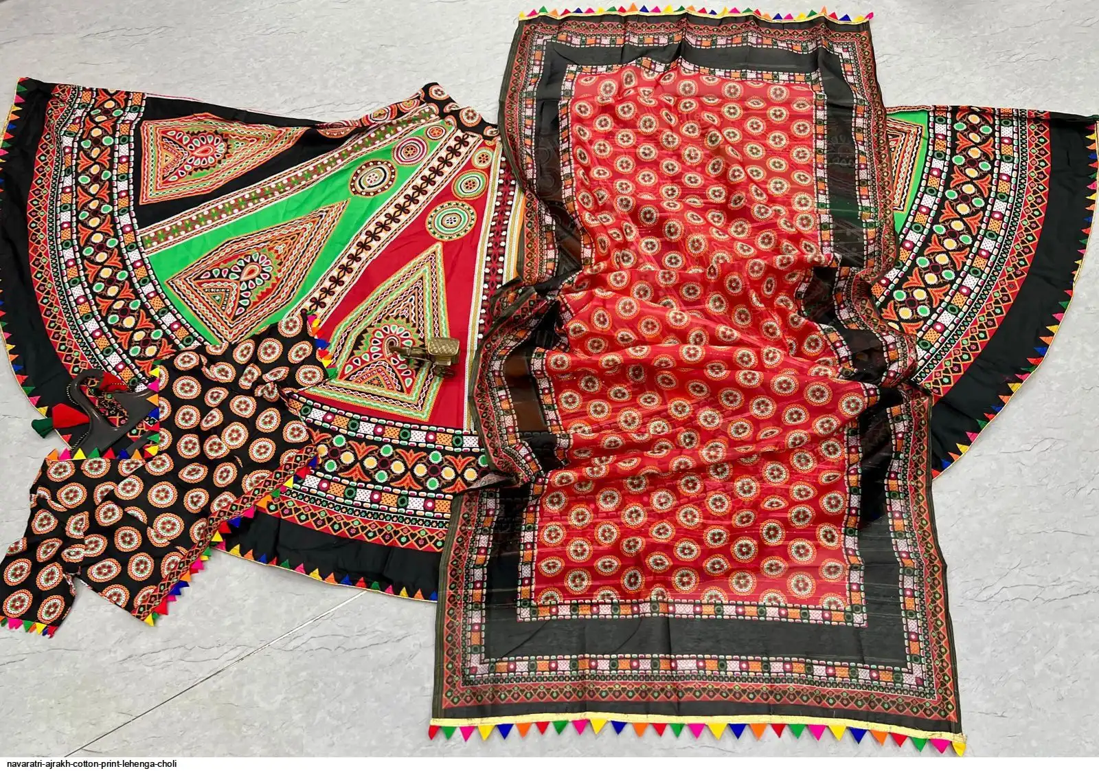Presenting a perfectly blended endless array of patterns, designs, color, print work and lucknowi print dupatta, that represents a vibrant gujarati culture & true essence of our navaratri choli.