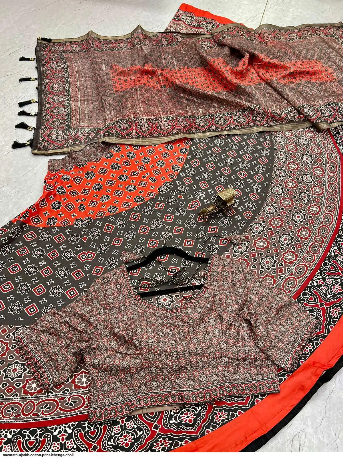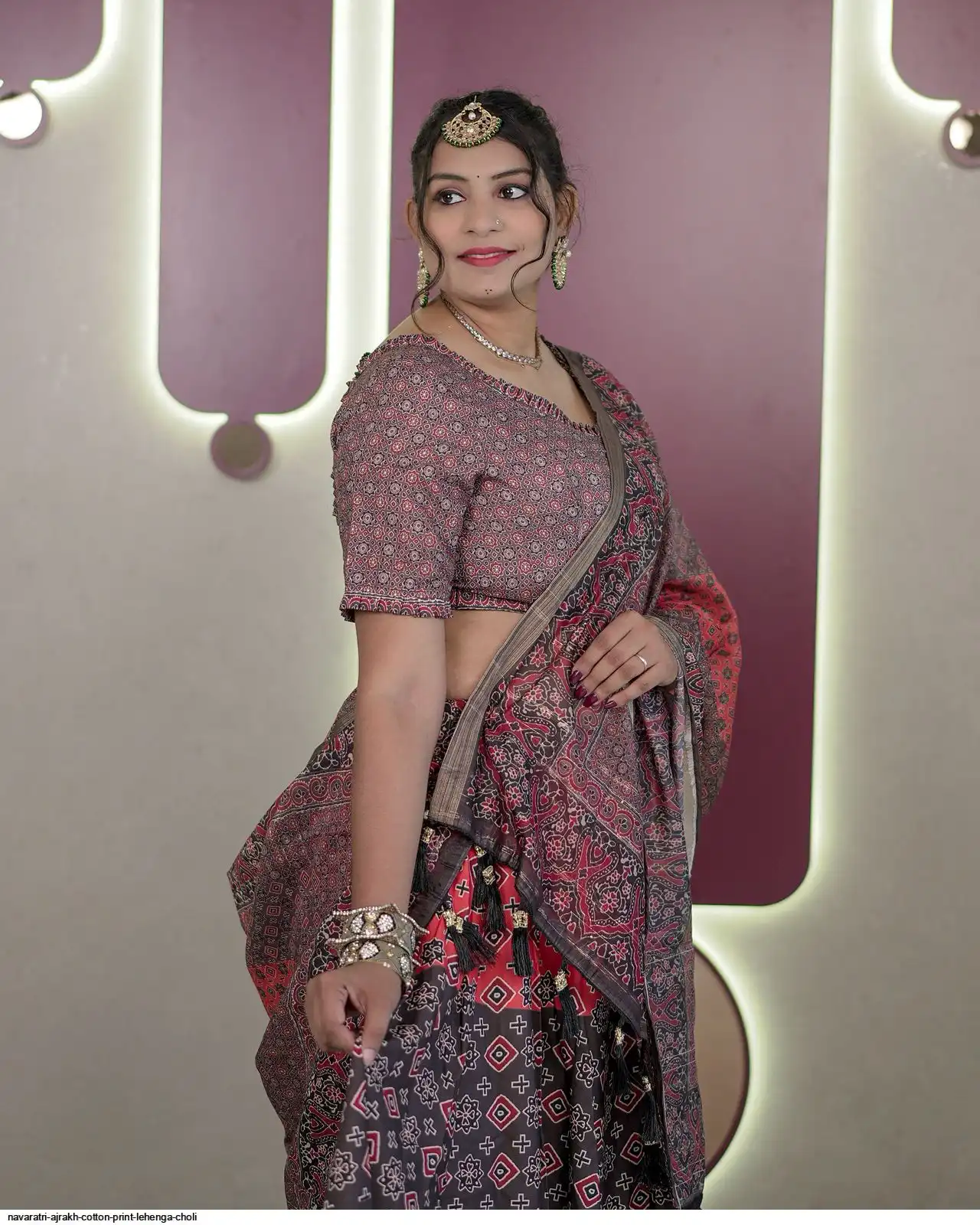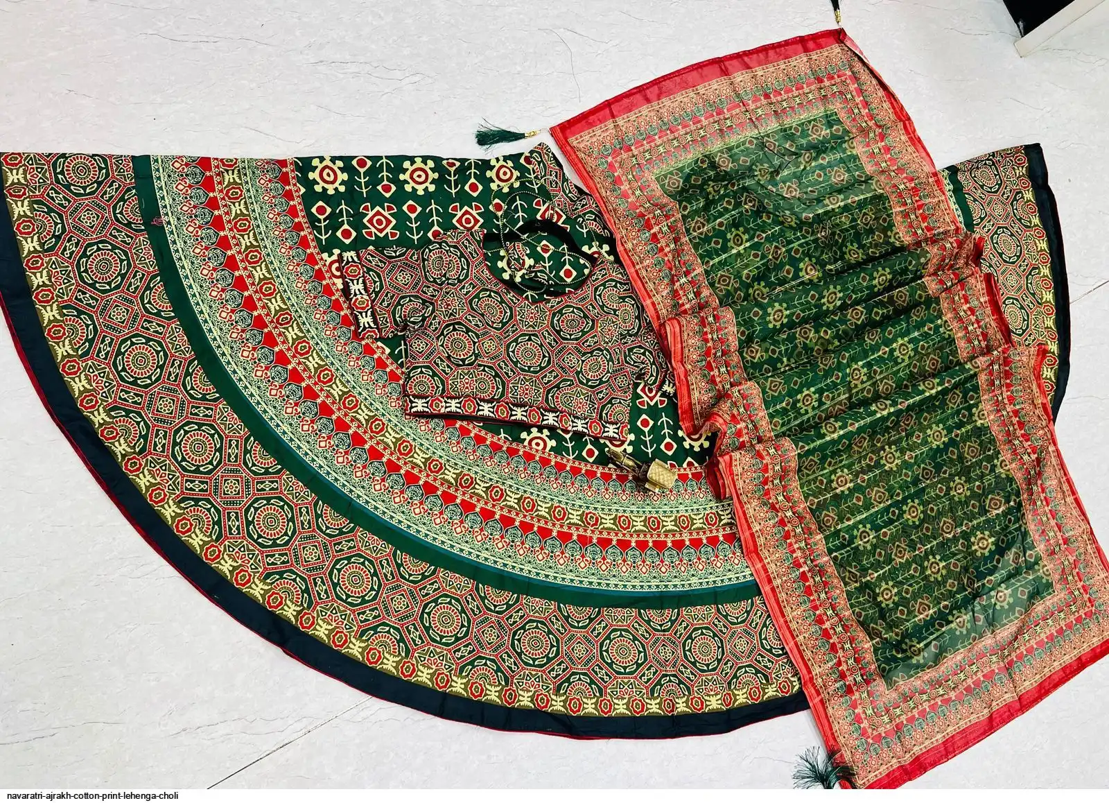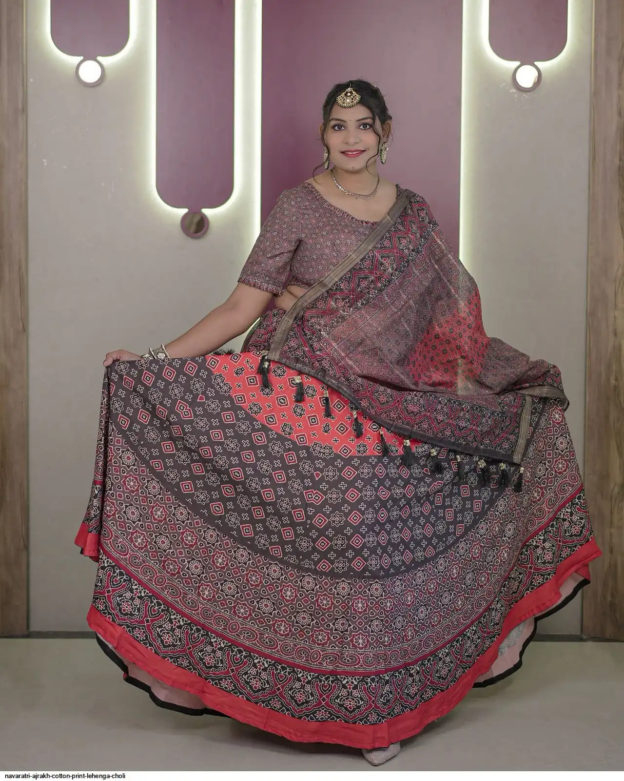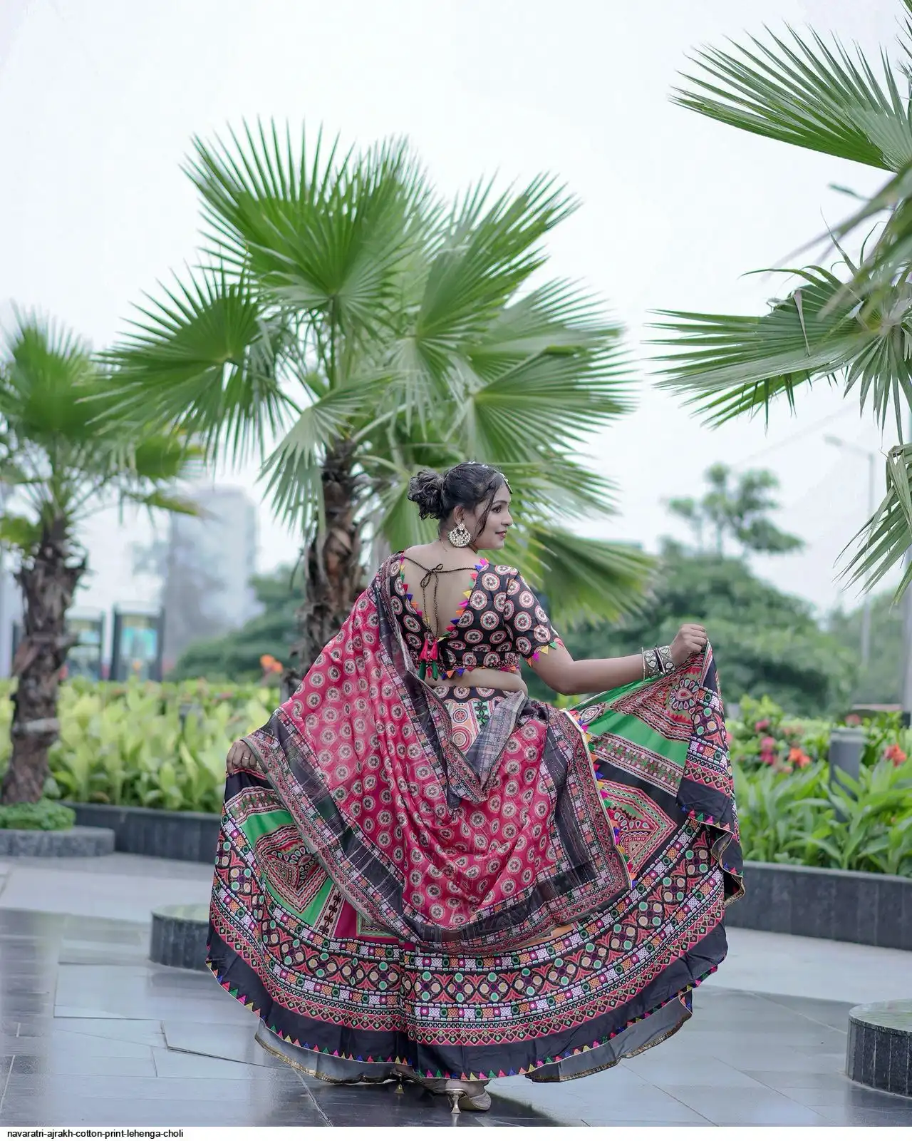 Presenting a perfectly blended endless array of patterns, designs, color, print work and lucknowi print dupatta, that represents a vibrant gujarati culture & true essence of our navaratri choli.