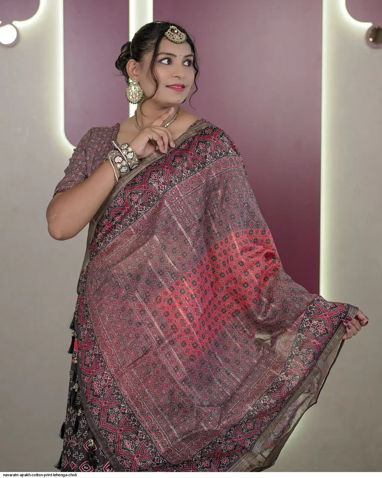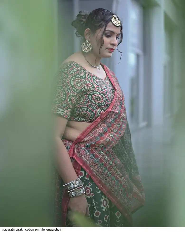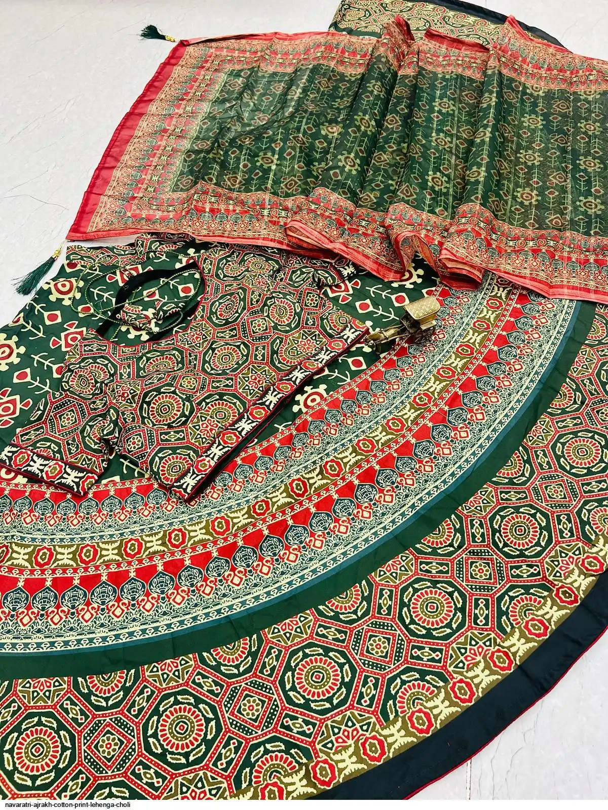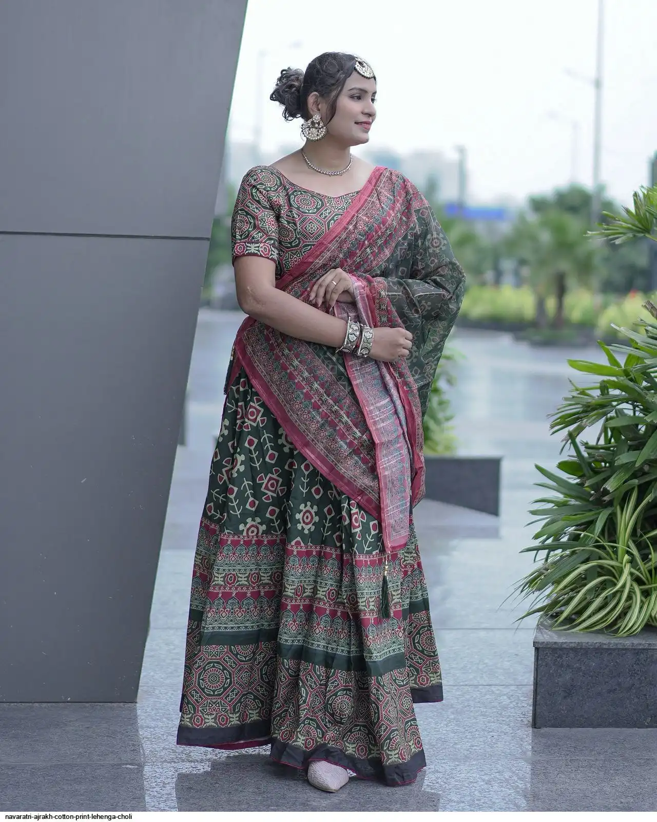 Presenting a perfectly blended endless array of patterns, designs, color, print work and lucknowi print dupatta, that represents a vibrant gujarati culture & true essence of our navaratri choli.
