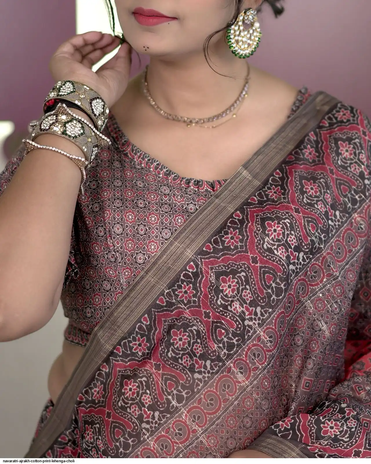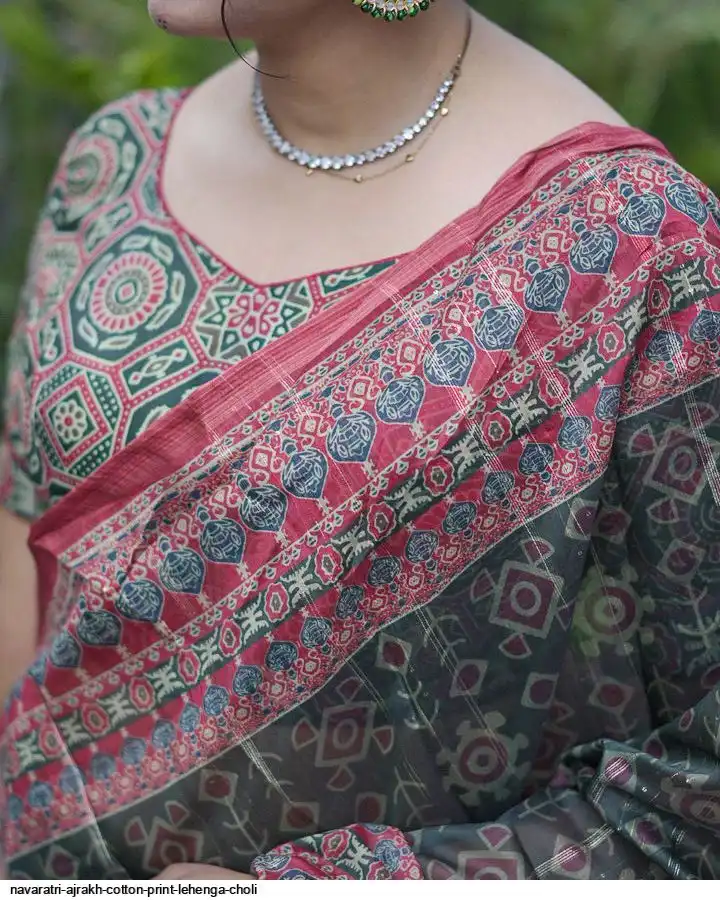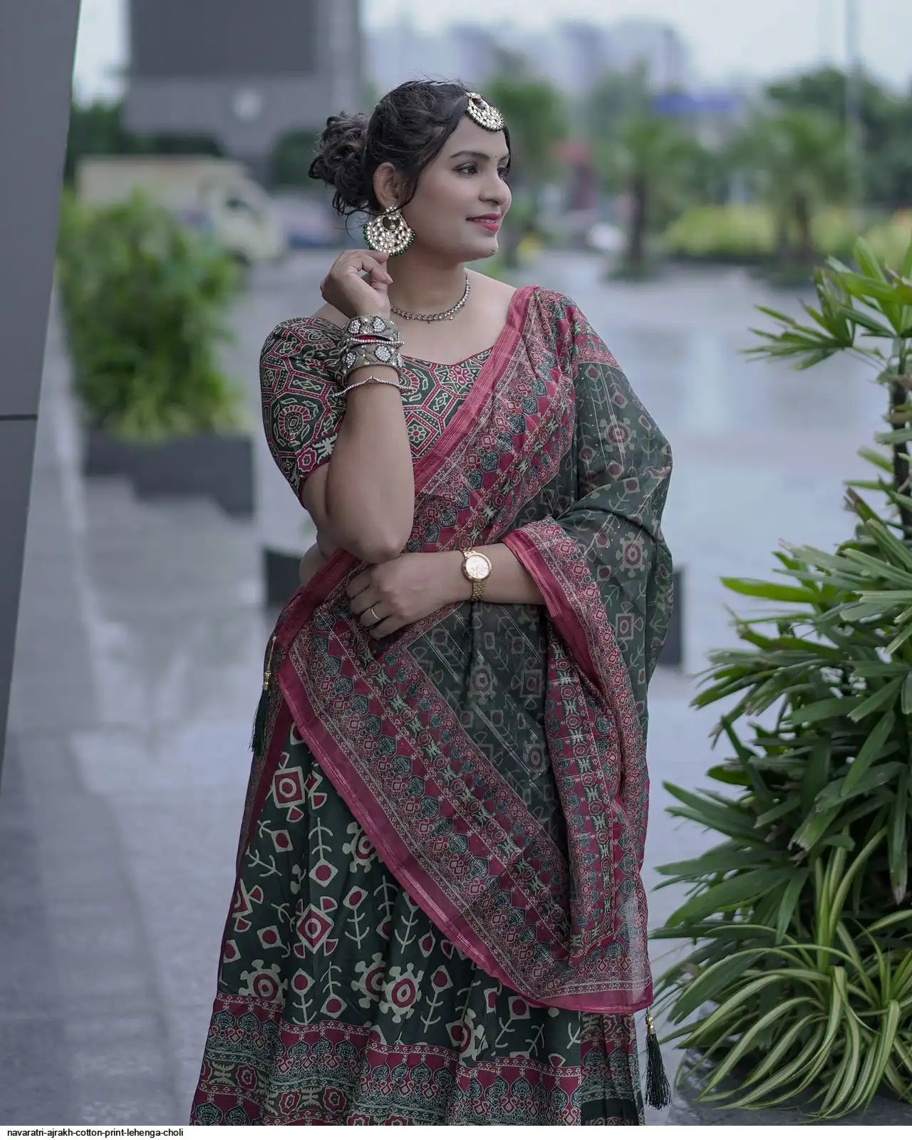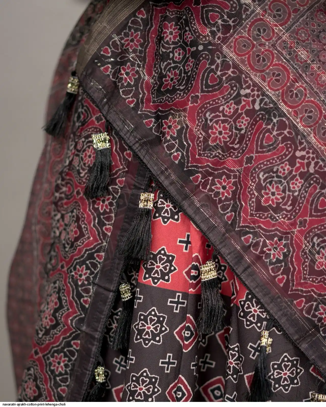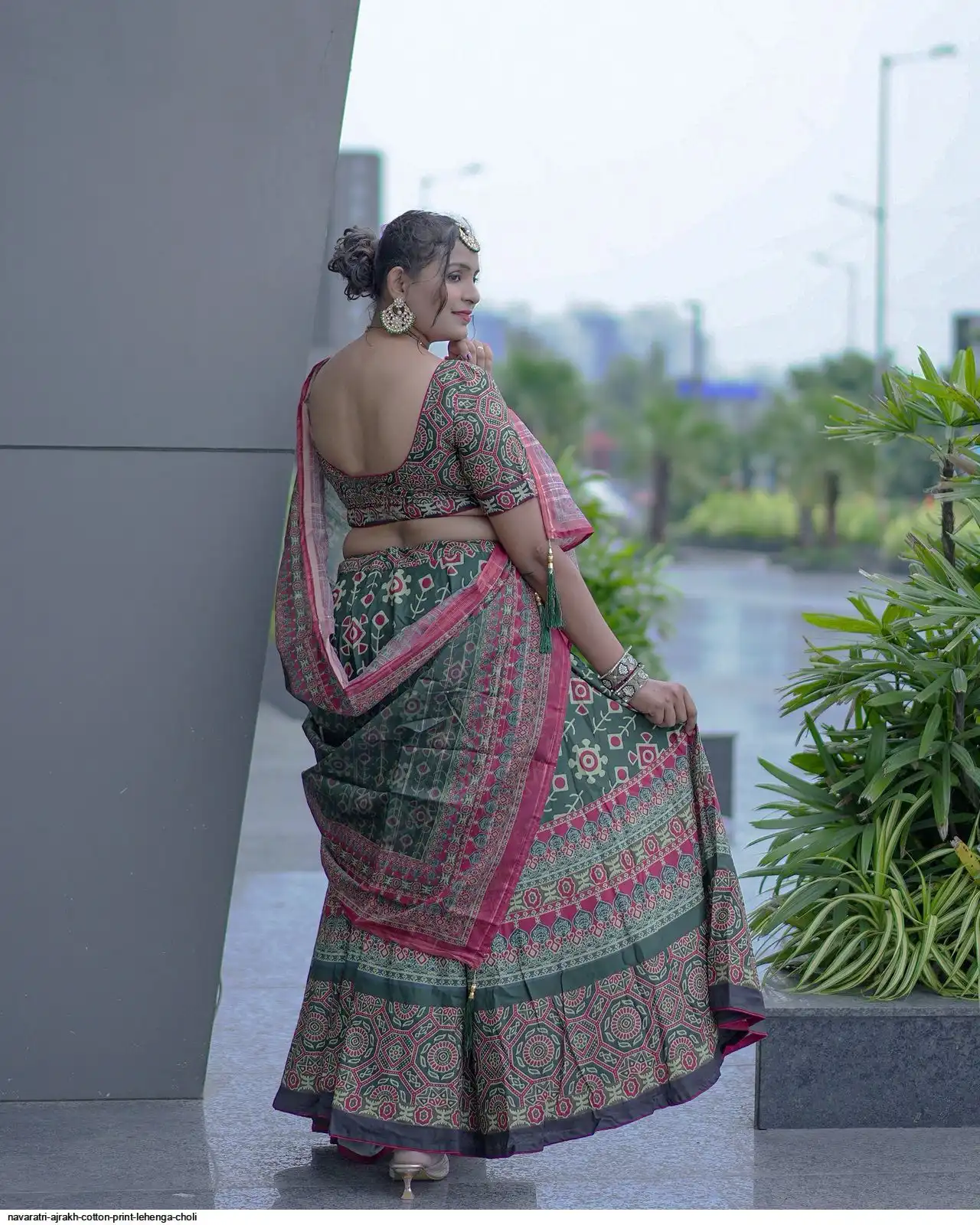 Presenting a perfectly blended endless array of patterns, designs, color, print work and lucknowi print dupatta, that represents a vibrant gujarati culture & true essence of our navaratri choli.