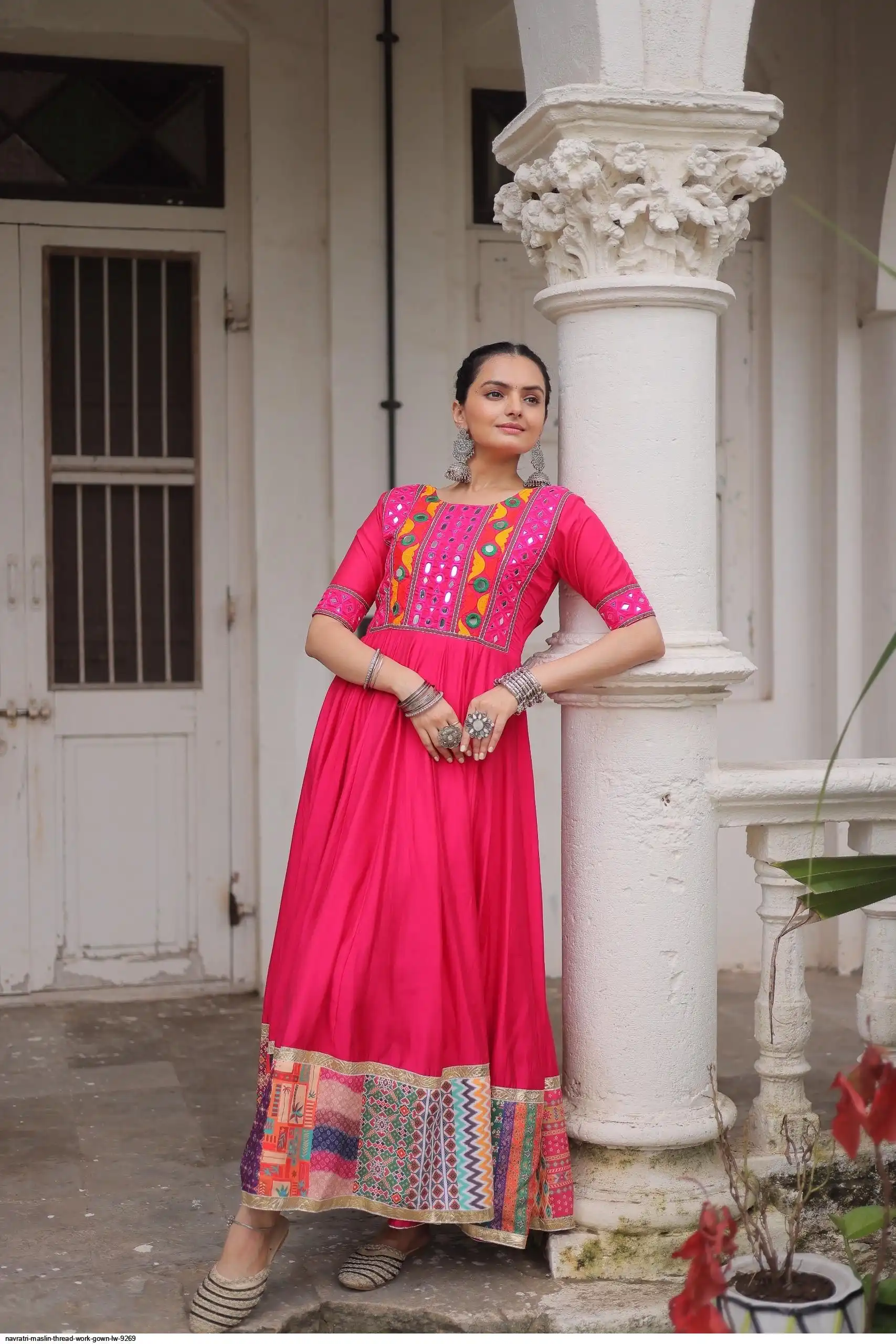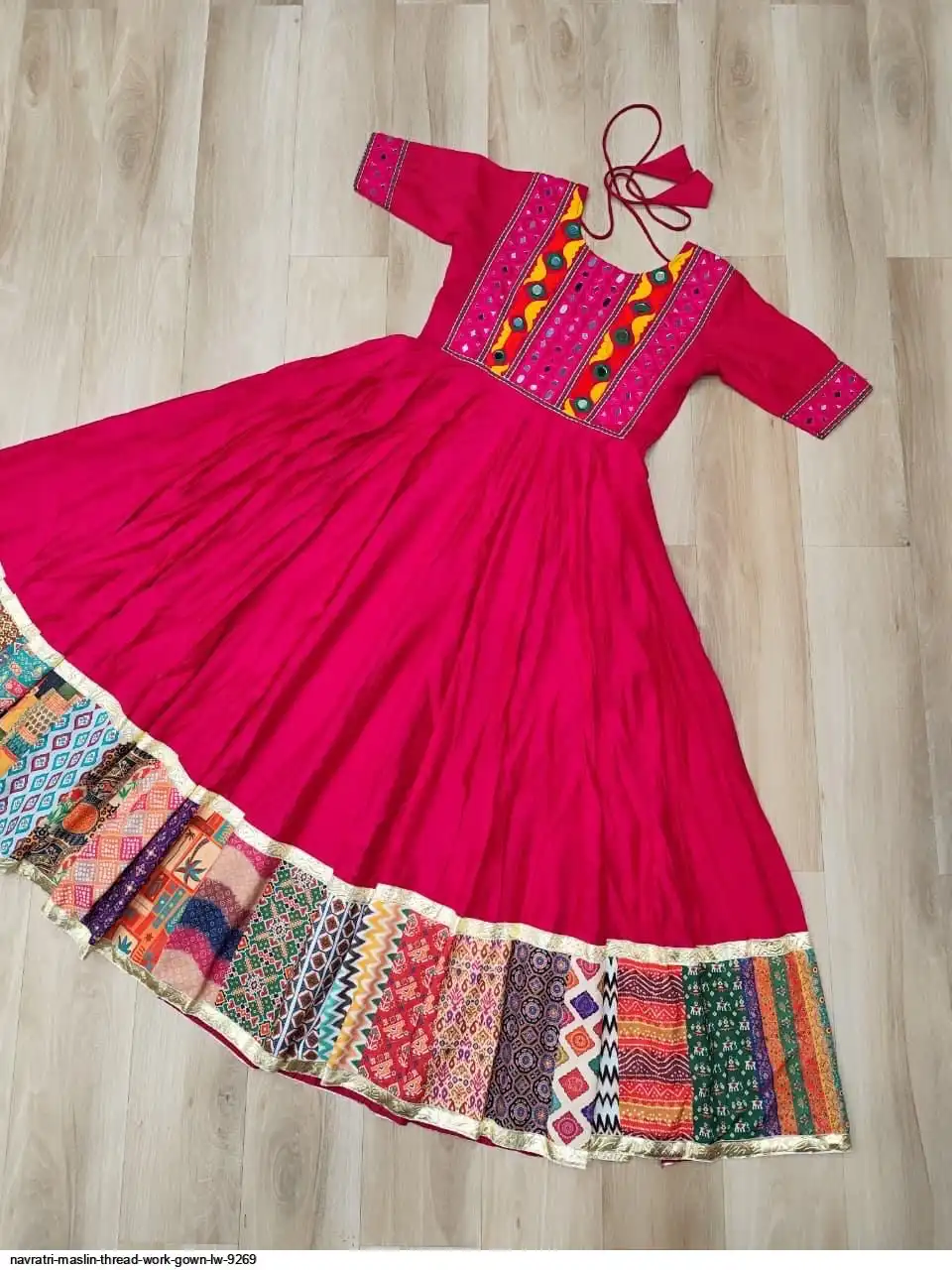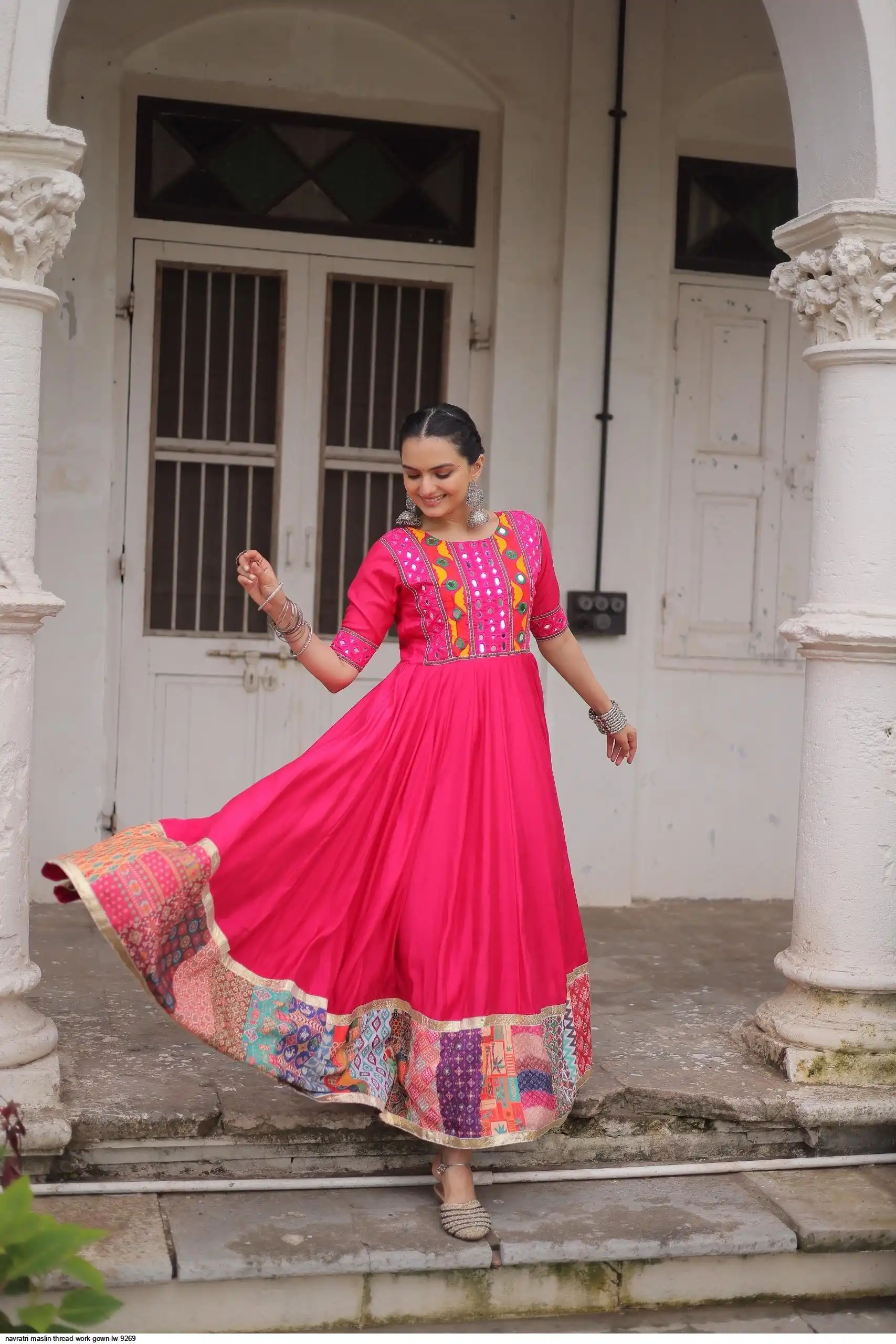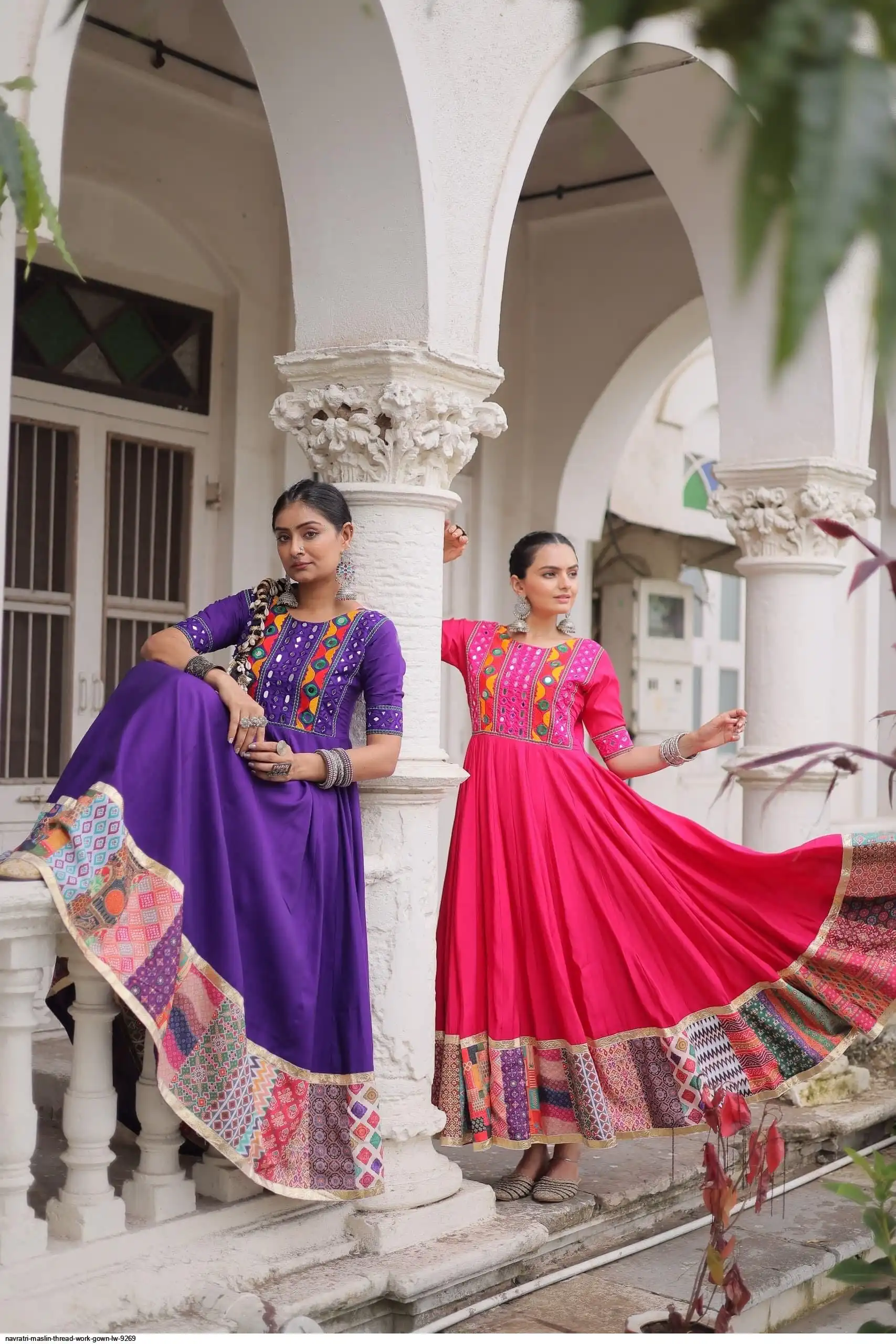 FABRICS & WORK :- Roman With multicolor Thread with mirror work & Maslin Crochet Print Work