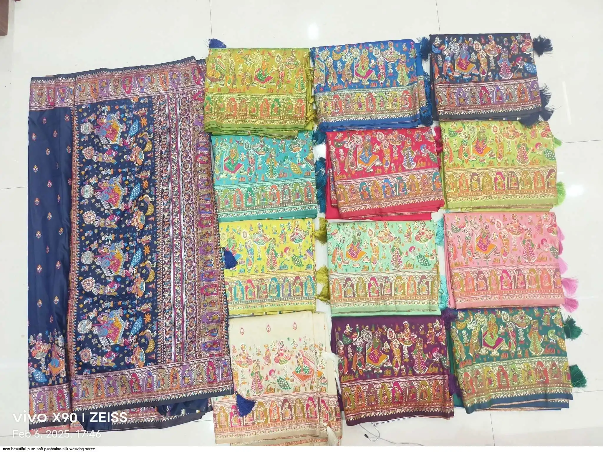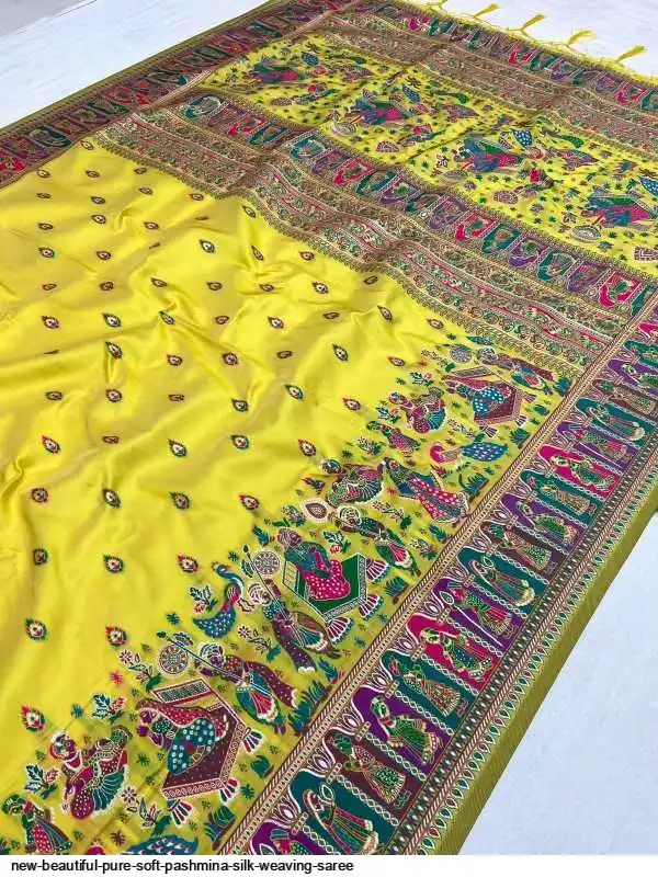 Fabric : Pure soft pashmina silk weaving saree with kashmiri Thread wooven pallu having fancy Tassels with beautiful Zari weaving with Running butti blouse