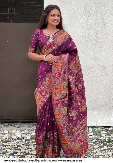 Fabric : Pure soft pashmina silk weaving saree with kashmiri Thread wooven pallu having fancy Tassels with beautiful Zari weaving with Running butti blouse