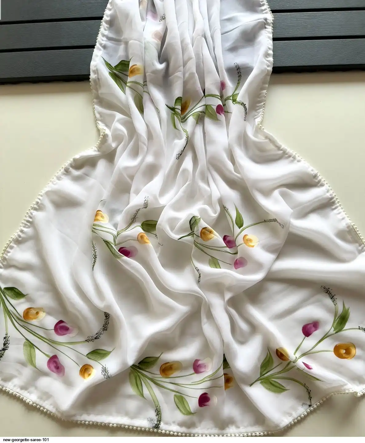 ▶️ Fabric - Georgette Fabric With Beautiful Floral Handbrush Print And Fancy Pearl (Moti 📿) Lace Bordar With Contrast Art Silk Blouse👚