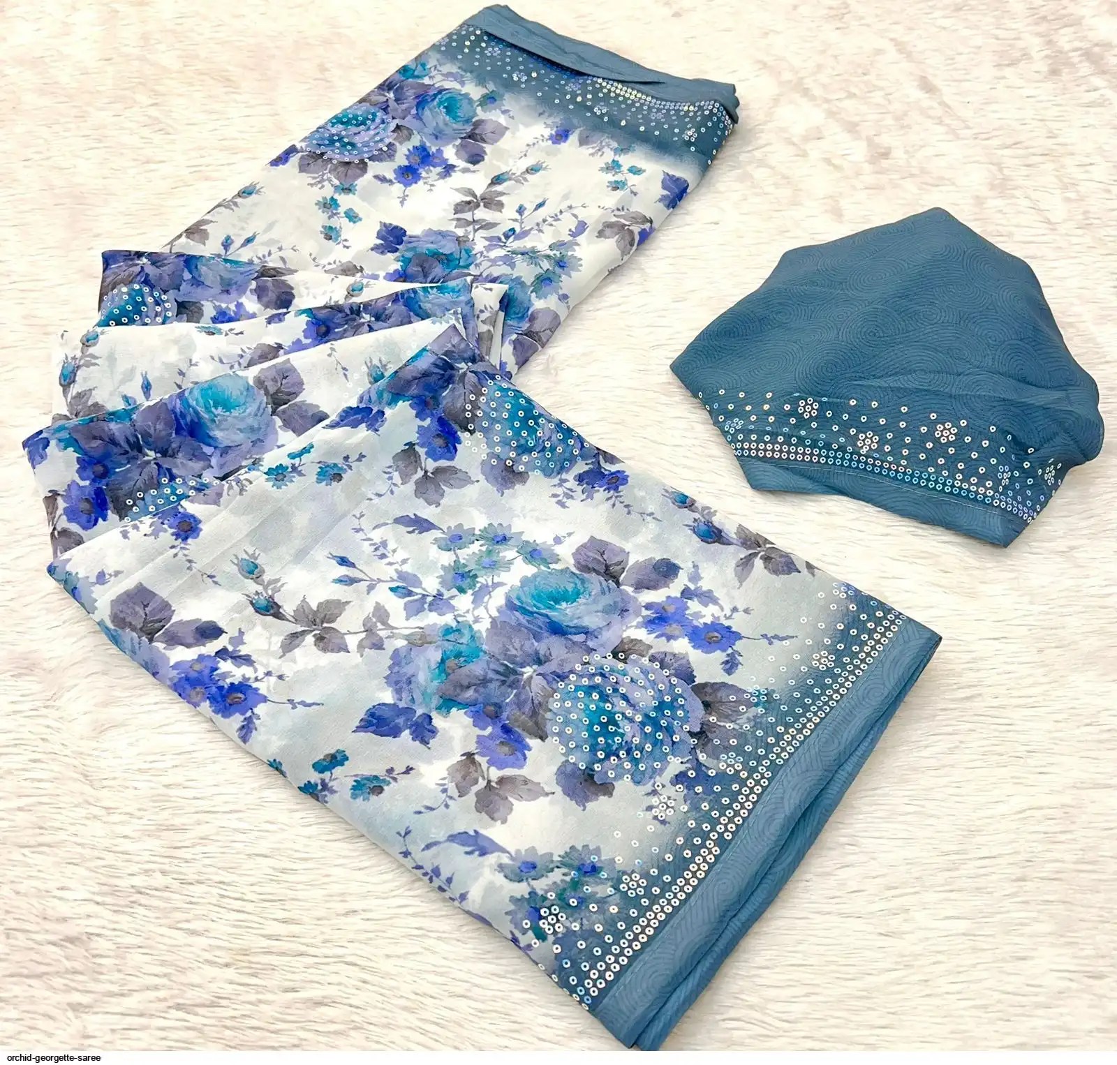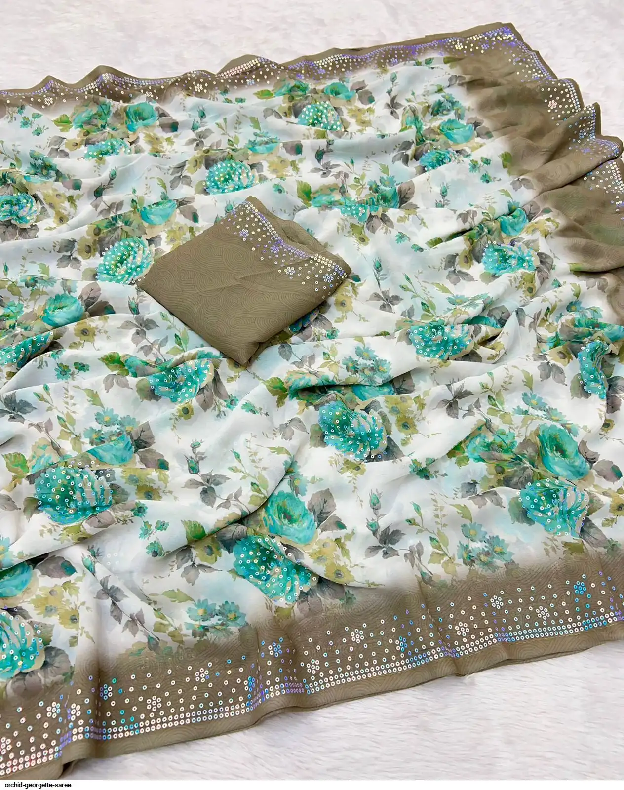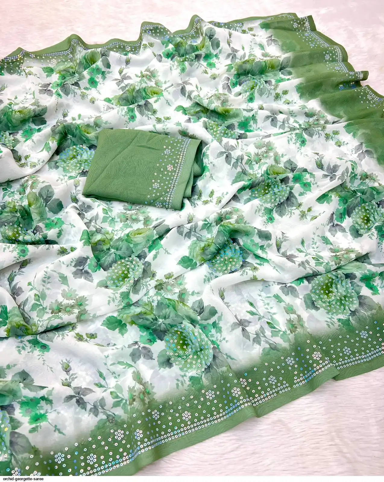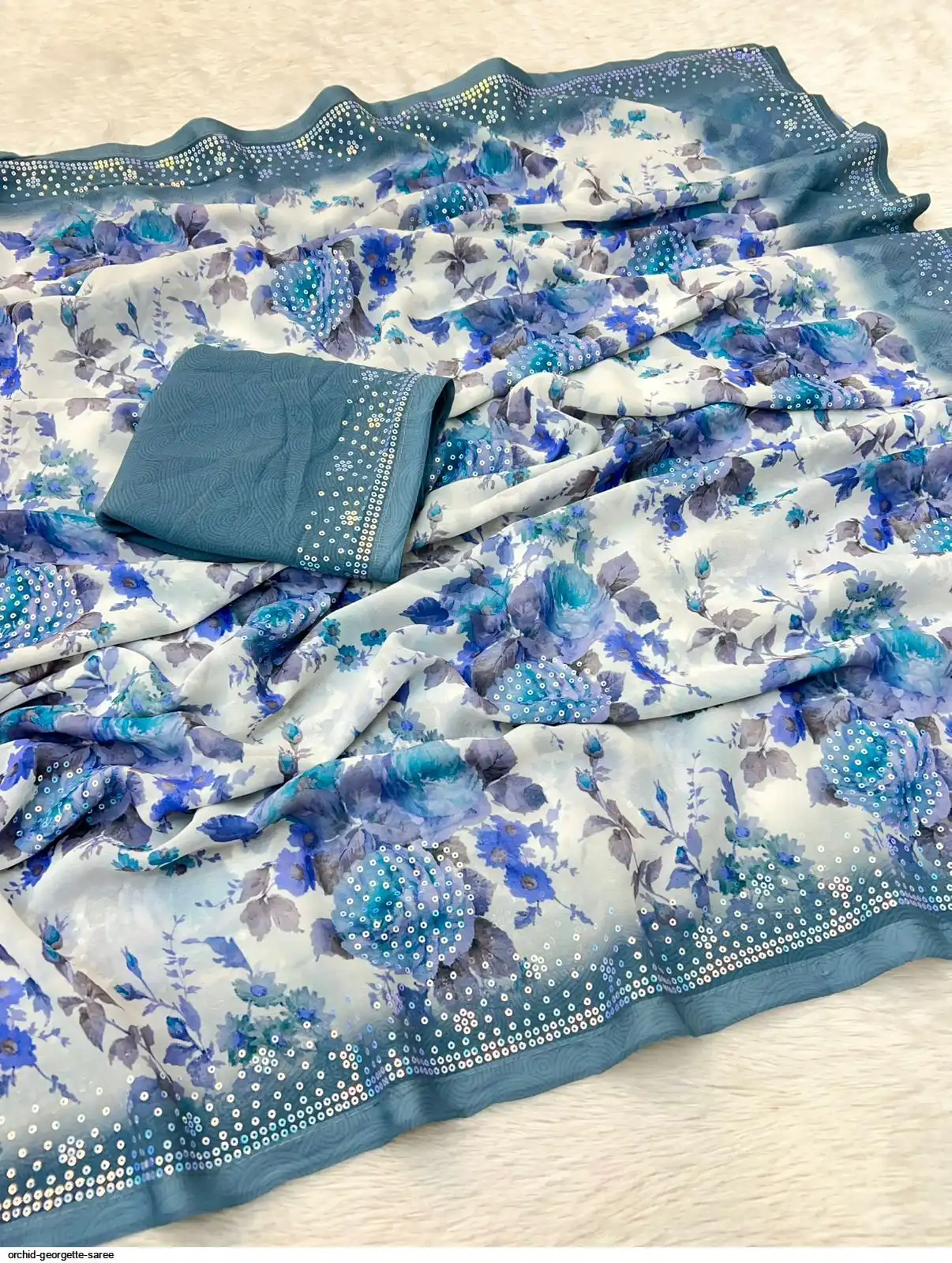 Fabric - Soft Georgette Fabric Beautiful Floral 3D Digital Print And Fancy Sequence In Body & Border With Runing Blouse