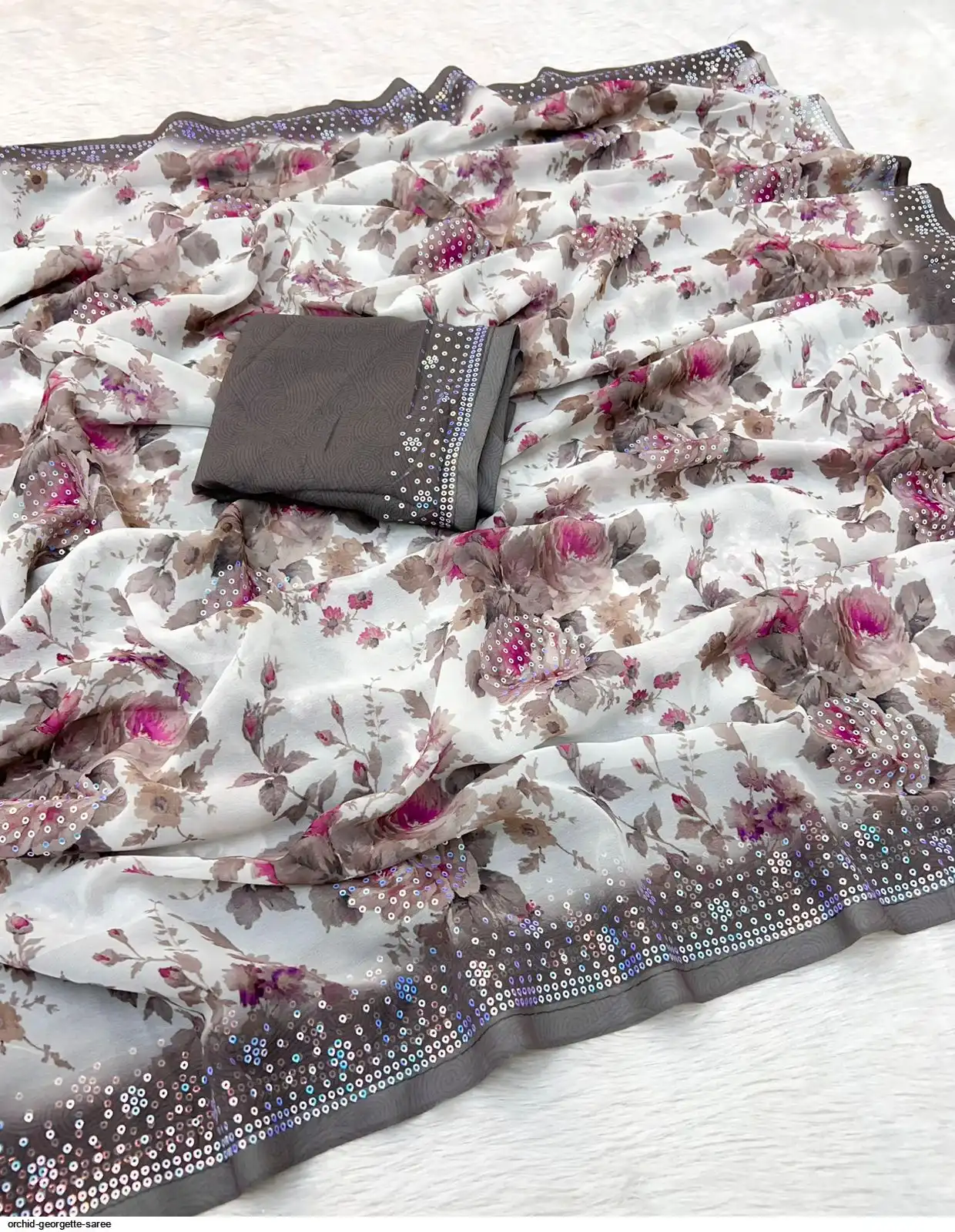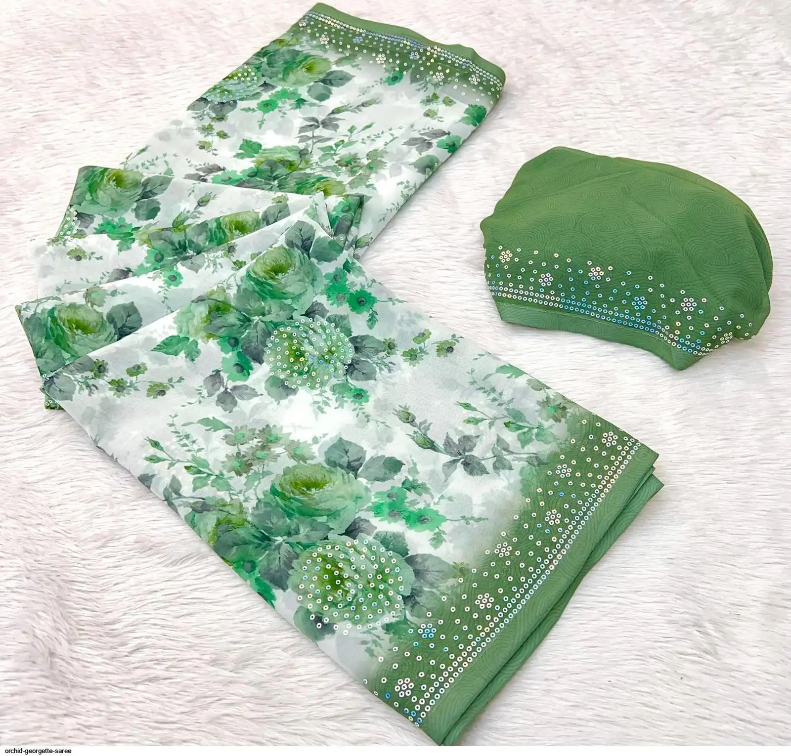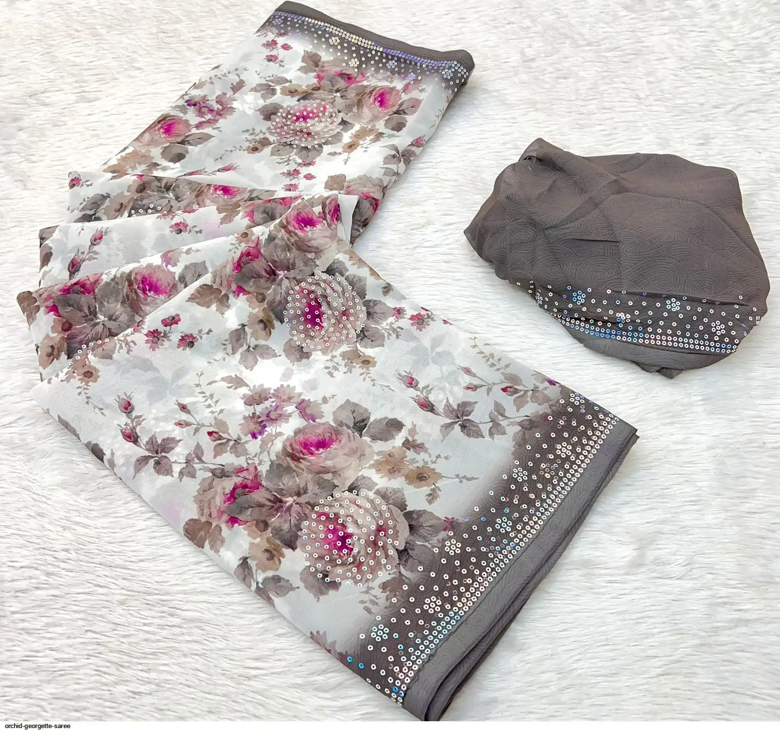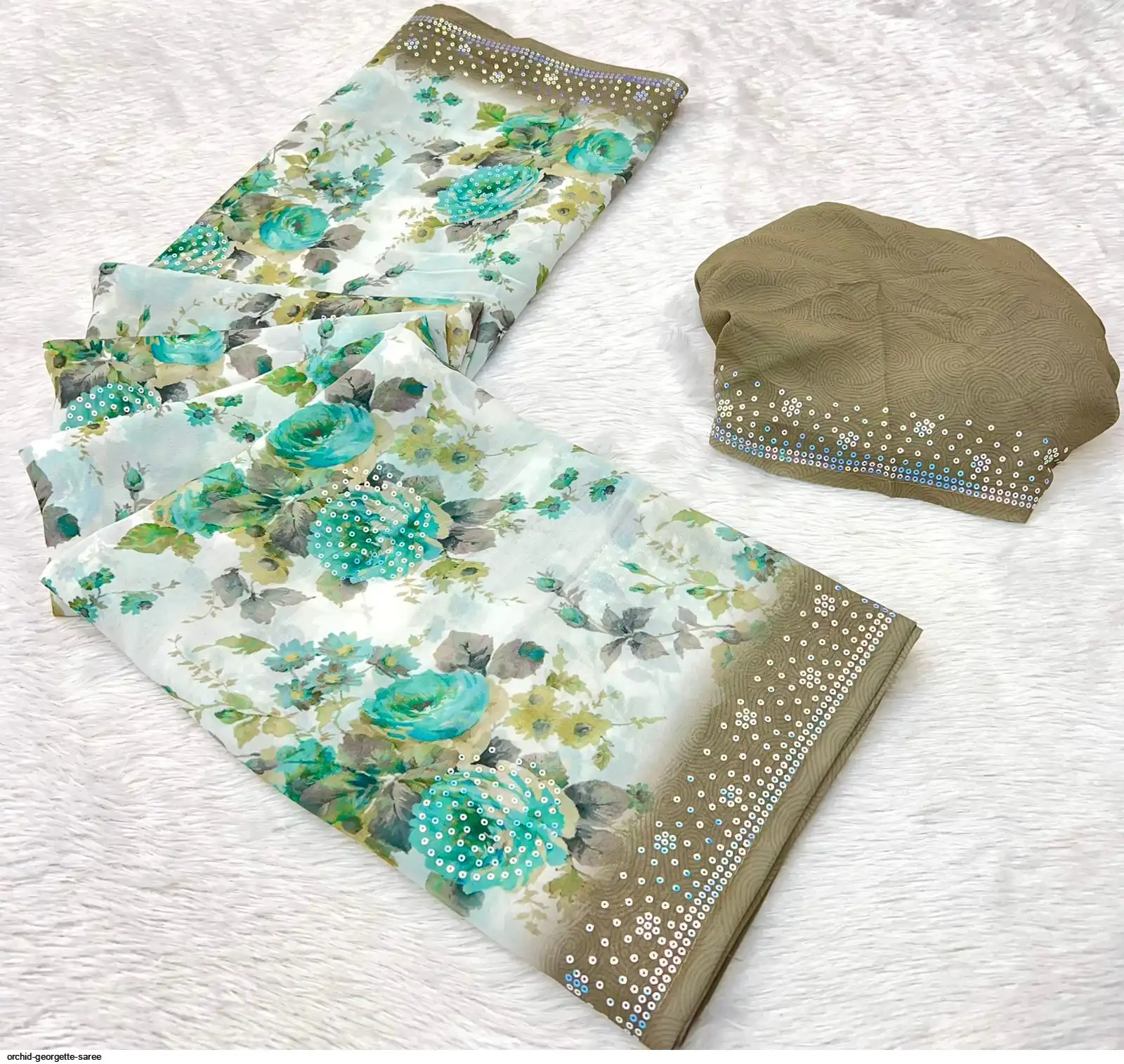 Fabric - Soft Georgette Fabric Beautiful Floral 3D Digital Print And Fancy Sequence In Body & Border With Runing Blouse