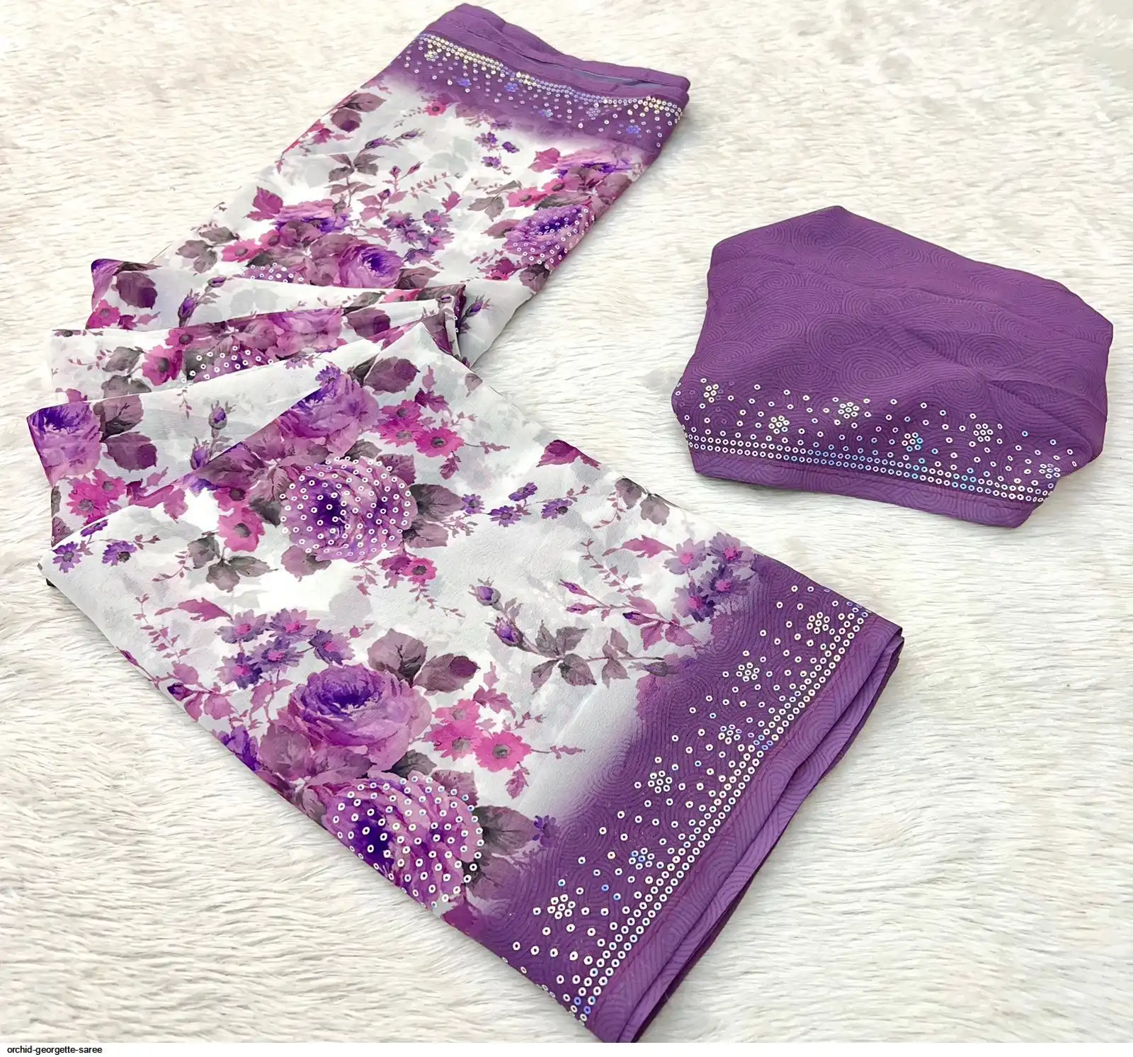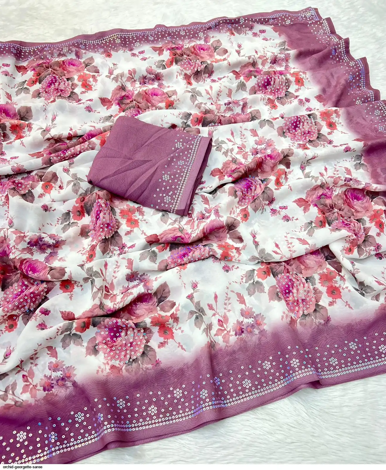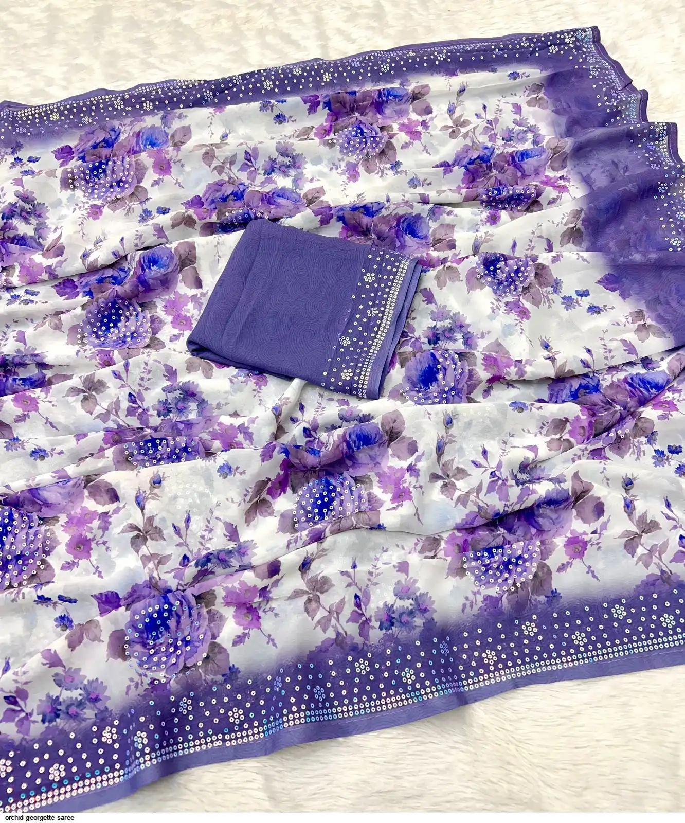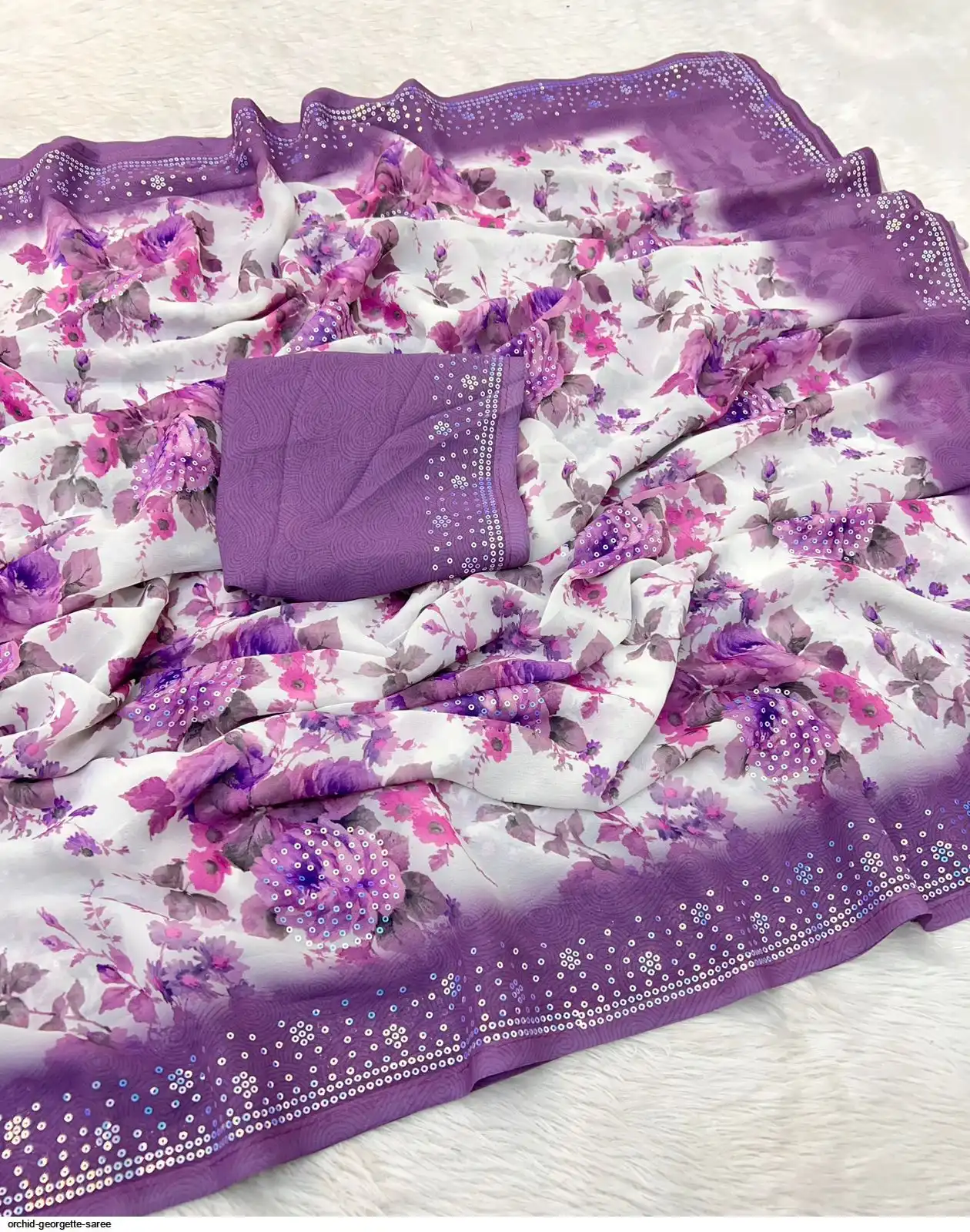 Fabric - Soft Georgette Fabric Beautiful Floral 3D Digital Print And Fancy Sequence In Body & Border With Runing Blouse